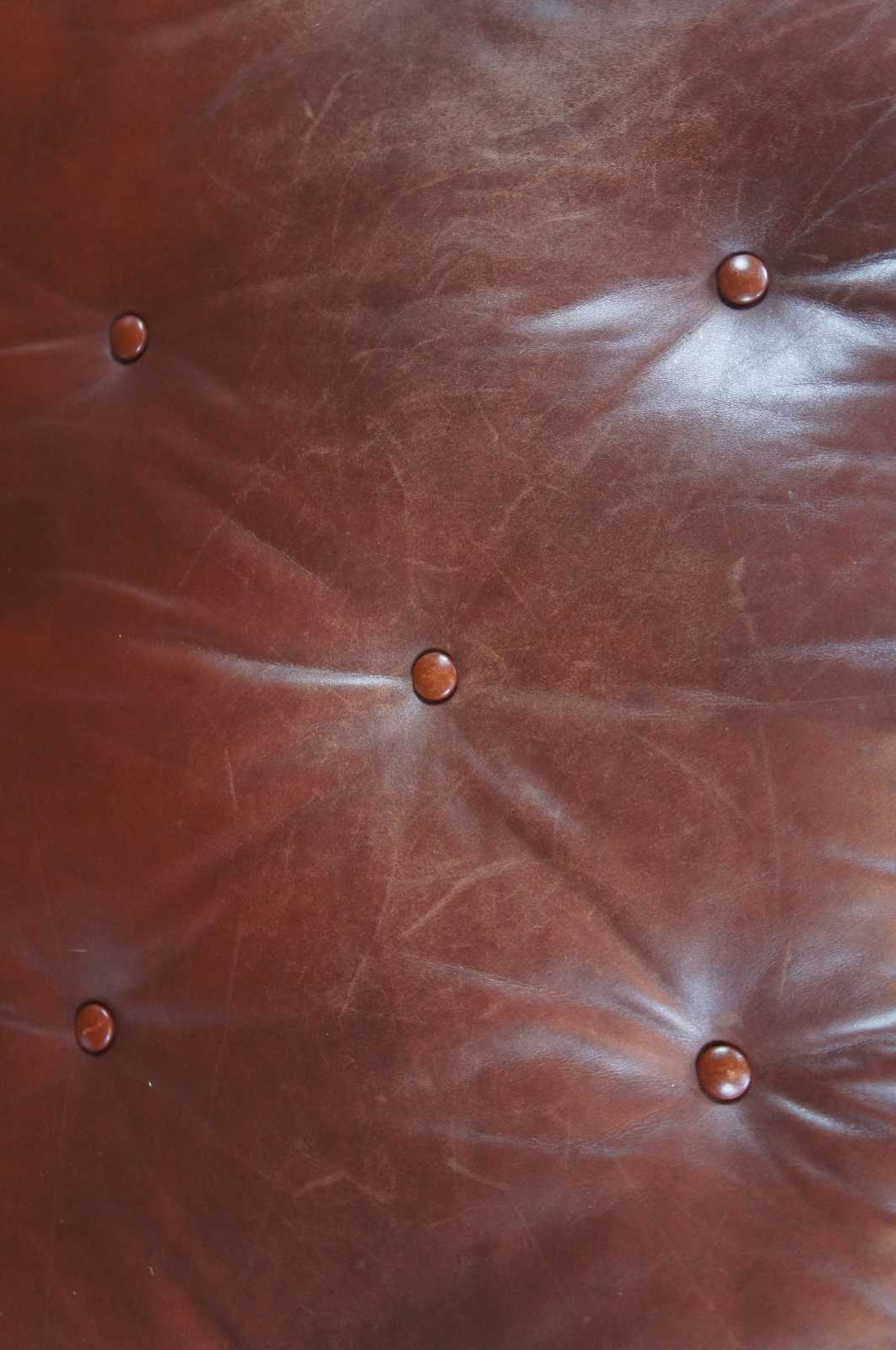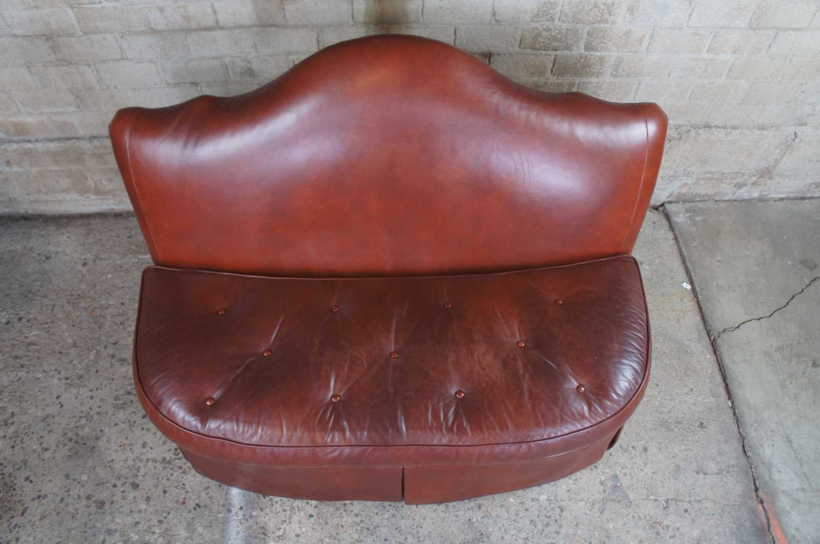 Century Furniture Camelback Banquette/Bench. Made from a warm brown leather with tufted kidney shaped seat. Front legs on casters for ease of movement.