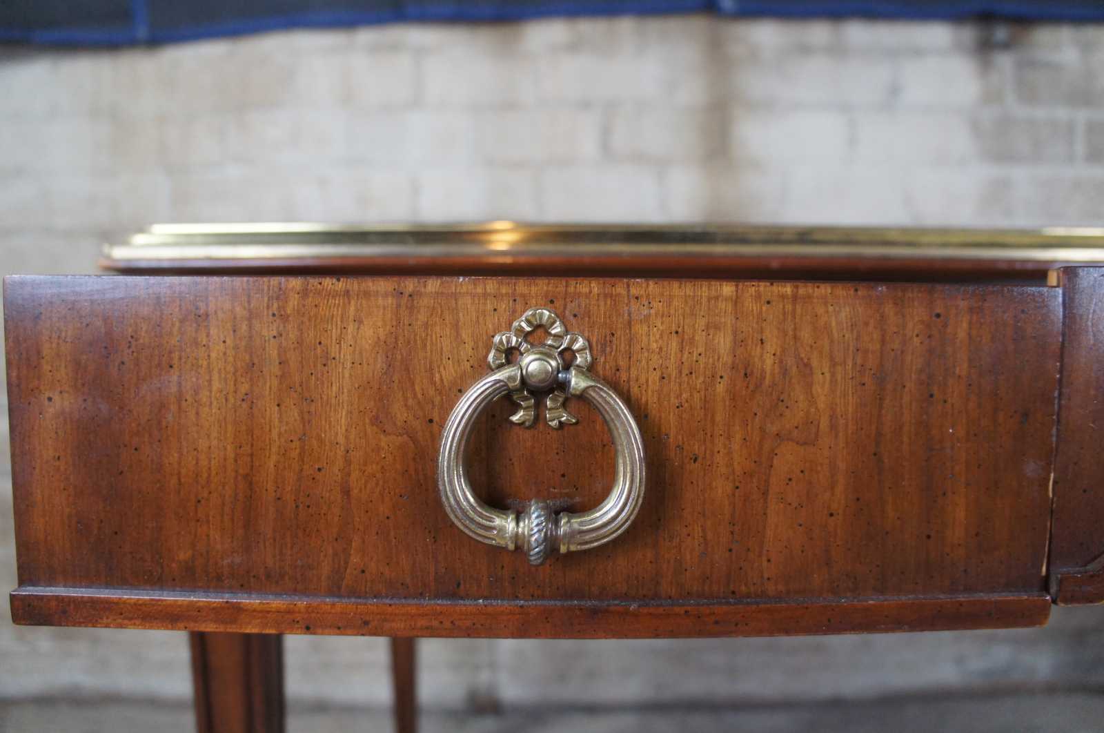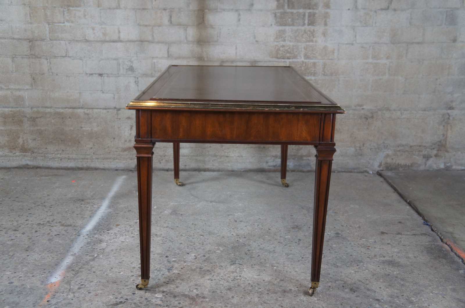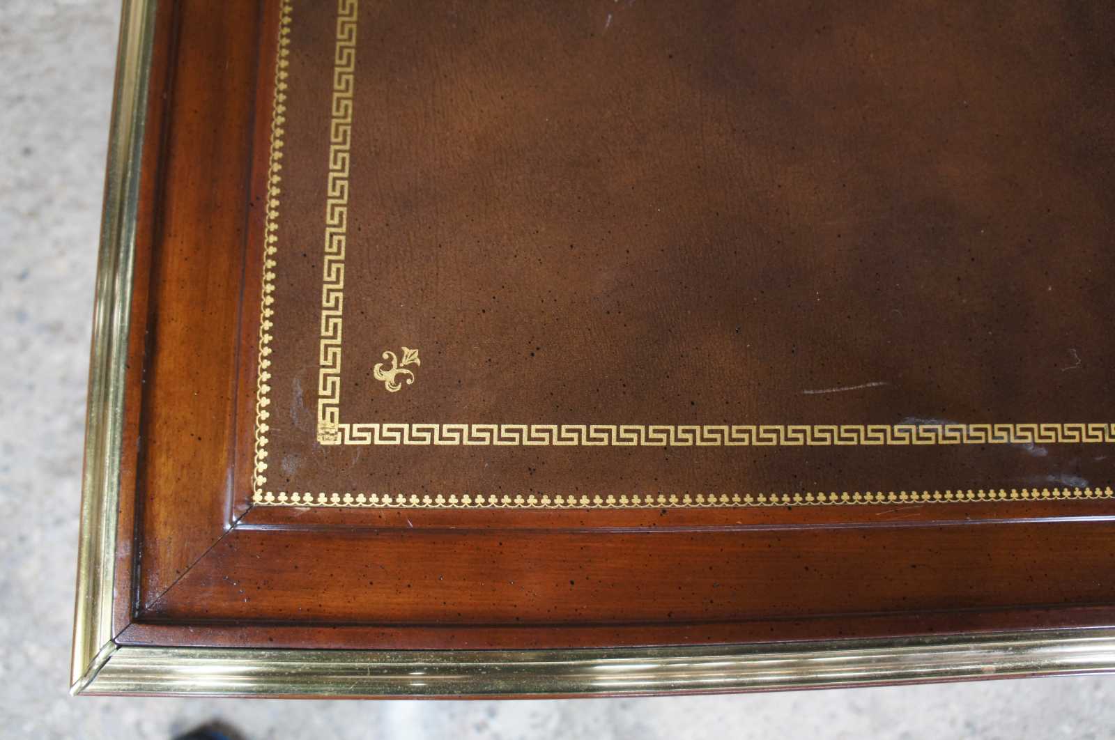 Vintage Sligh Furniture writing desk. Made of mahogany with brass edgework, tooled leather top featuring greek key, fleur de lis, repeating spades and neoclassical drawer pulls.