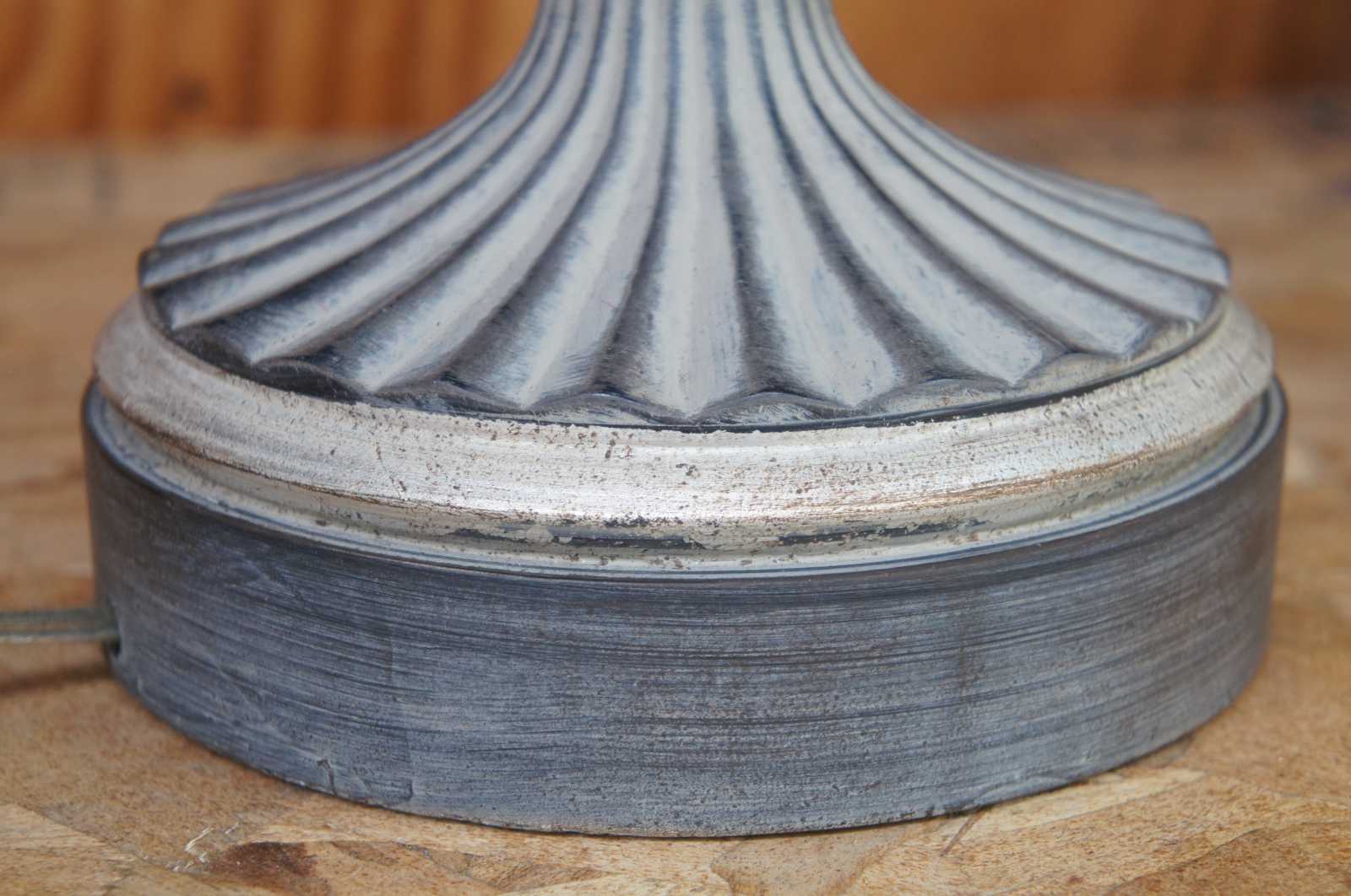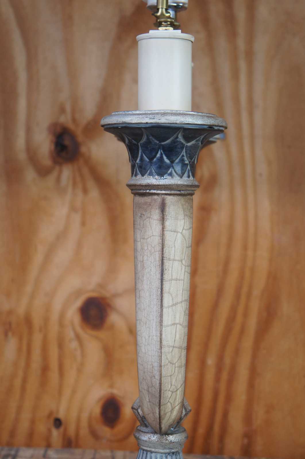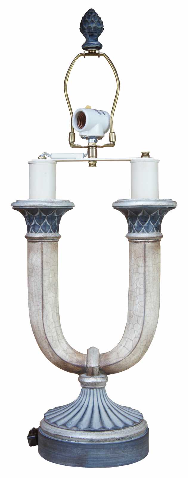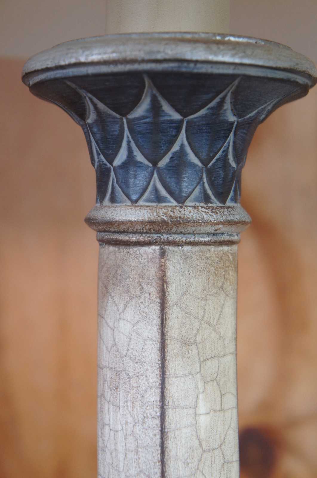 Artistically distressed two arm table lamp with ridged base and scale textured Corinthian style column toppers.