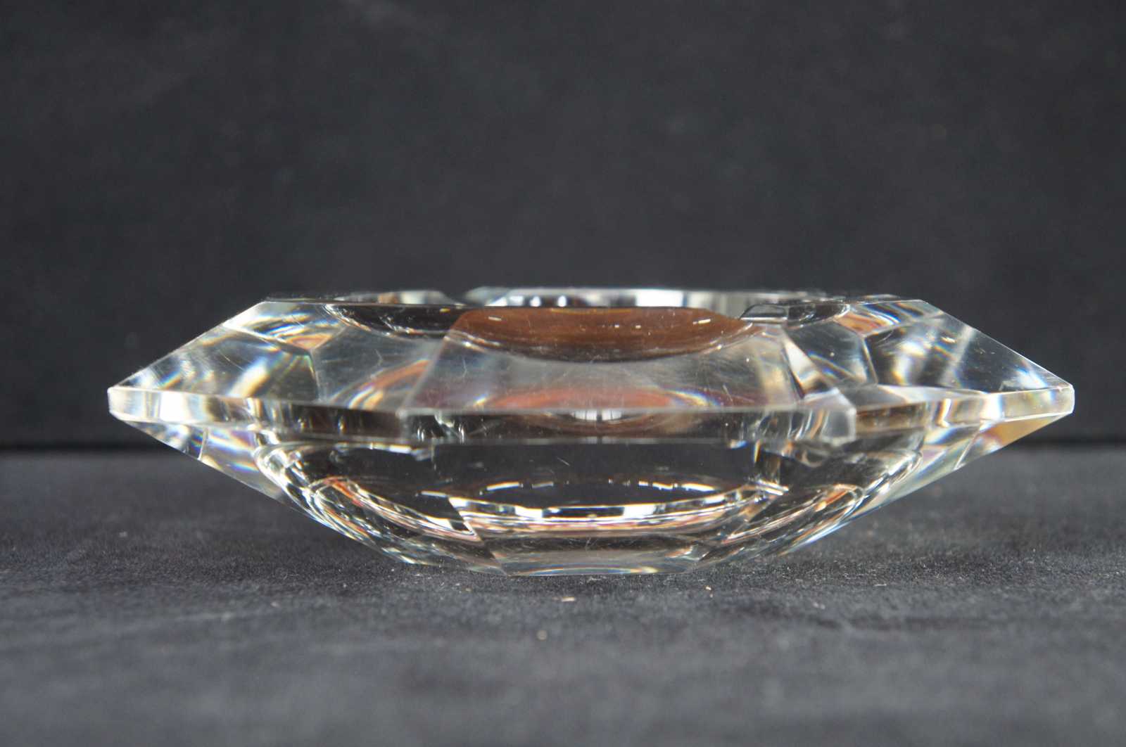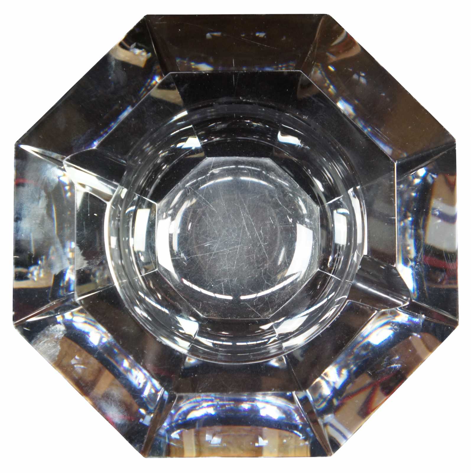 Vintage faceted octagonal ashtray with two cigarette rests, likely by Val St Lambert. “Val Saint Lambert is a Belgian crystal glassware manufacturer, founded in 1826 and based in Seraing. It has the royal warrant of King Albert II.”