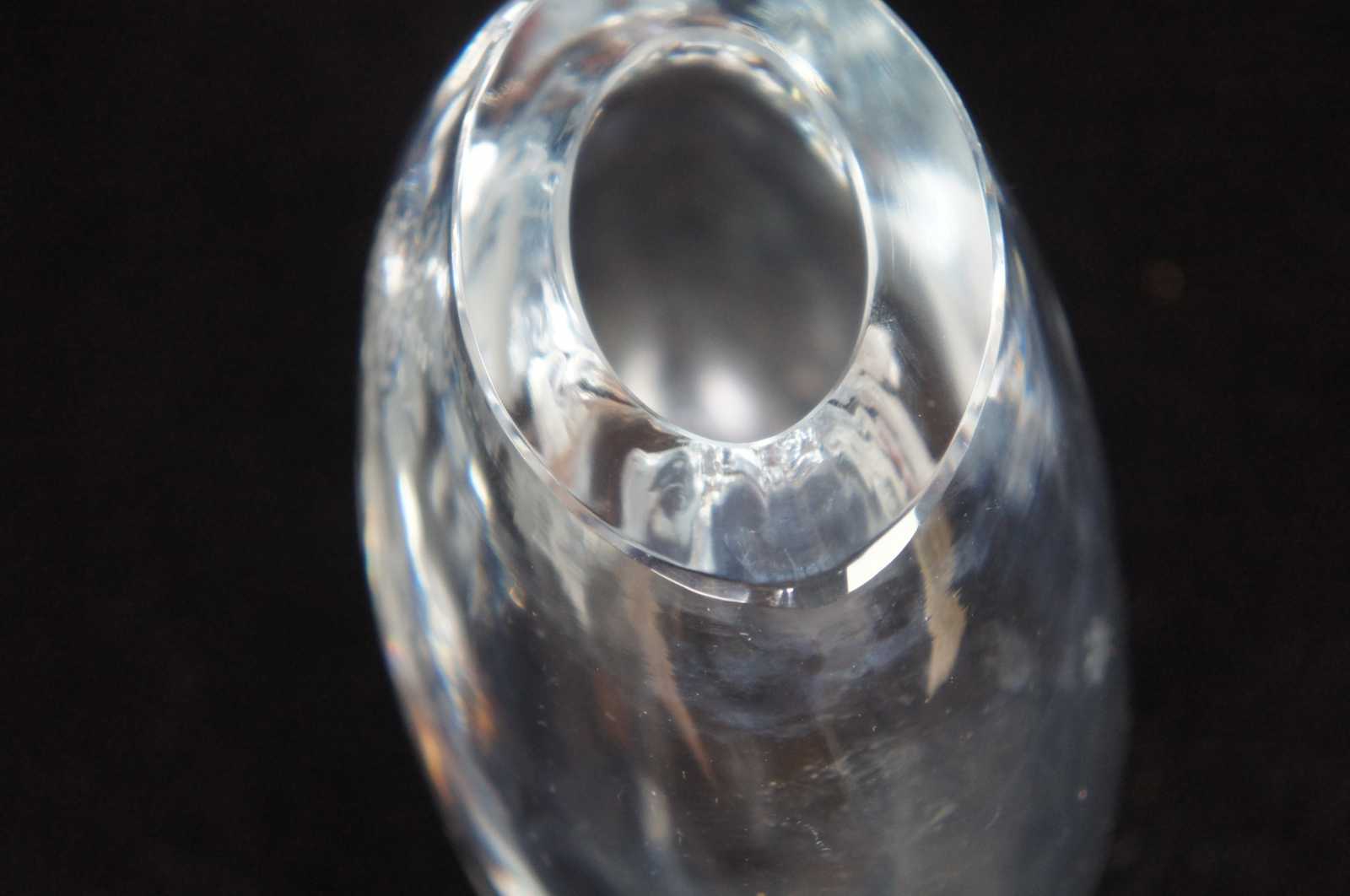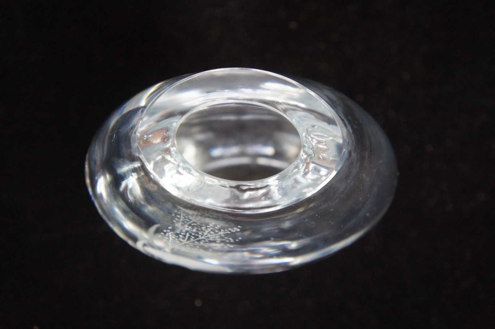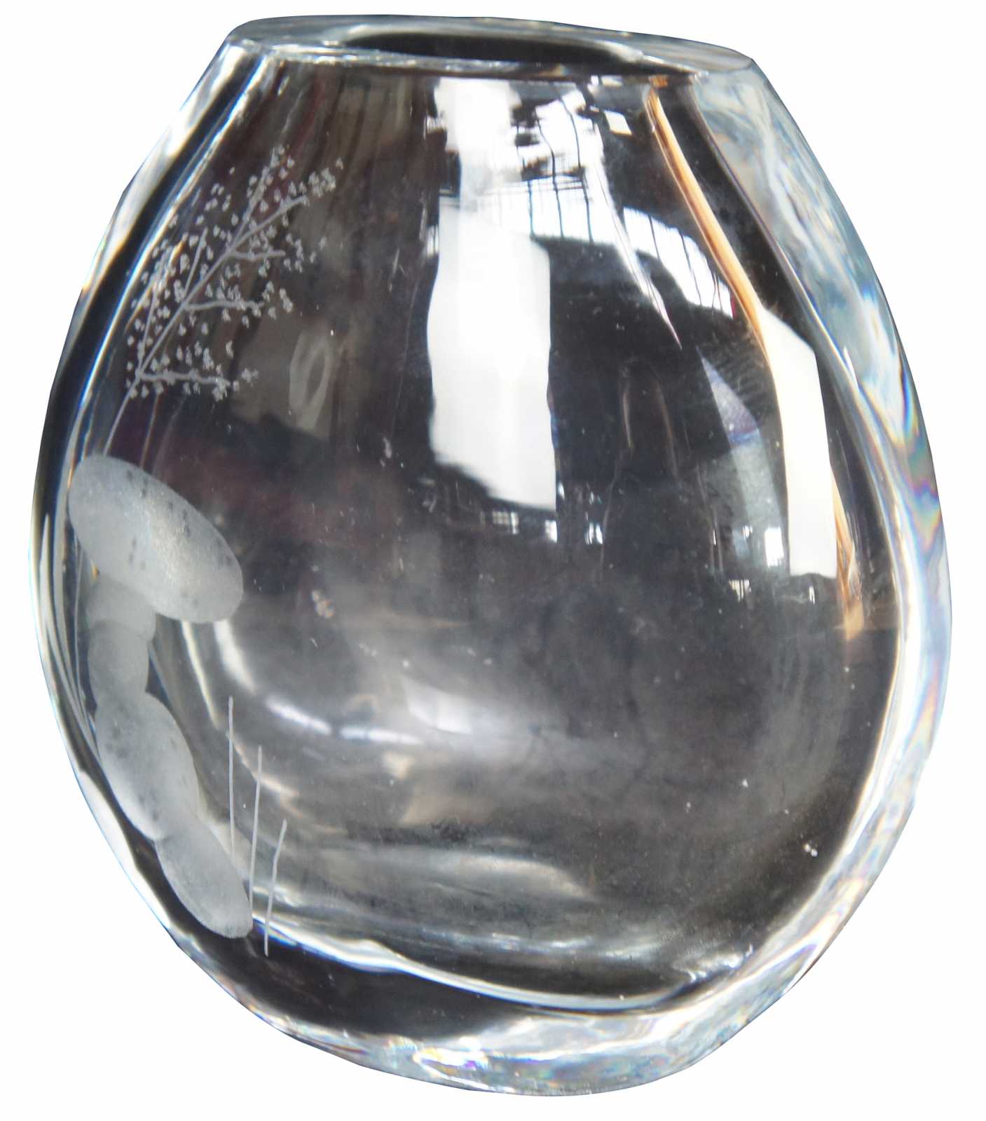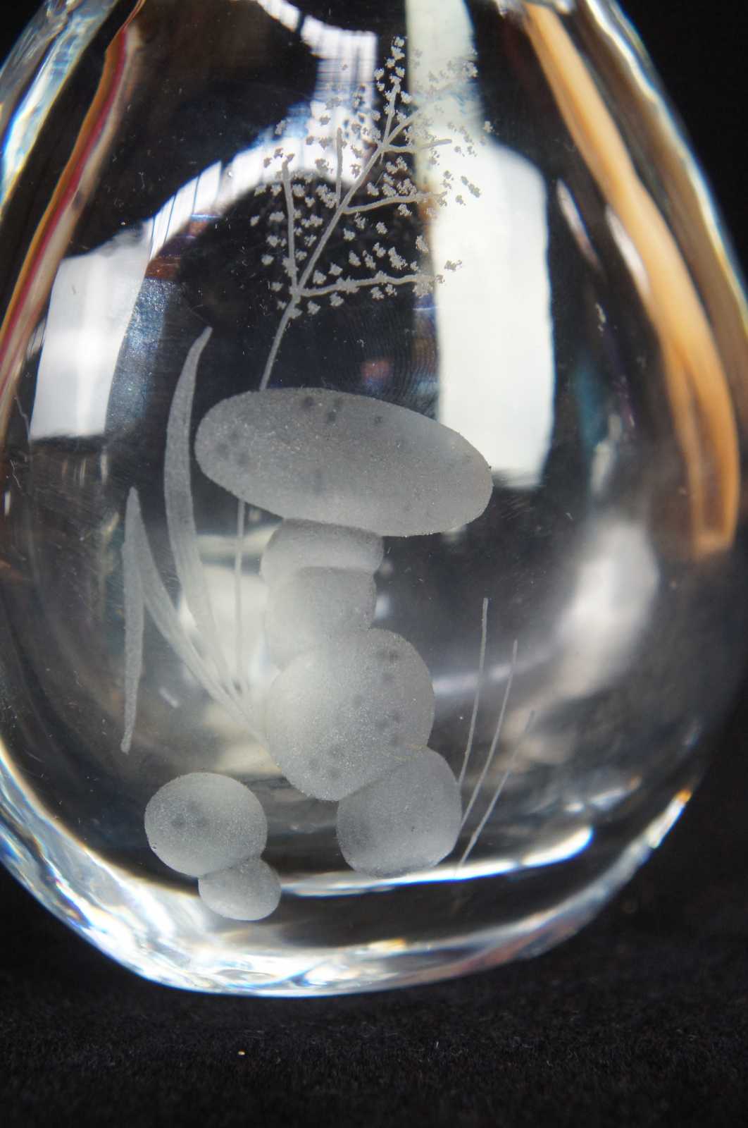 Vintage Ekenas Sweden etched glass oval bud vase with an image of mushrooms next to a branching wild flower.