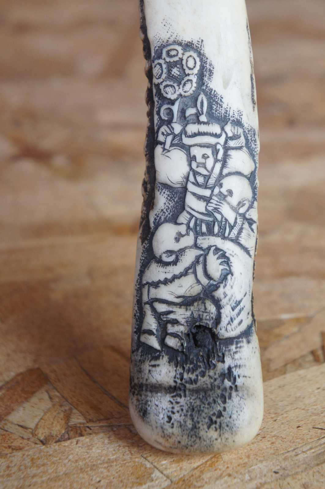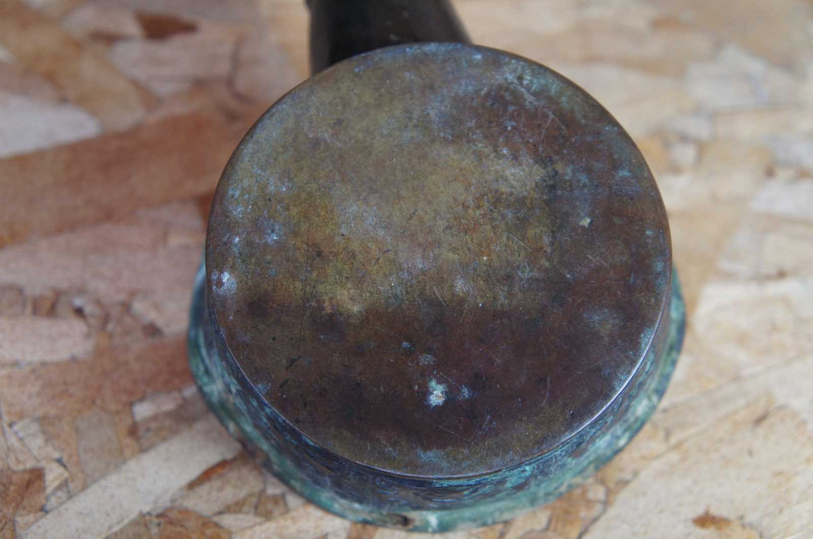 Antique bronze silk iron decorated with geometric patterns and dragons, with a naturally curved horn handle carved with figures and instruments.