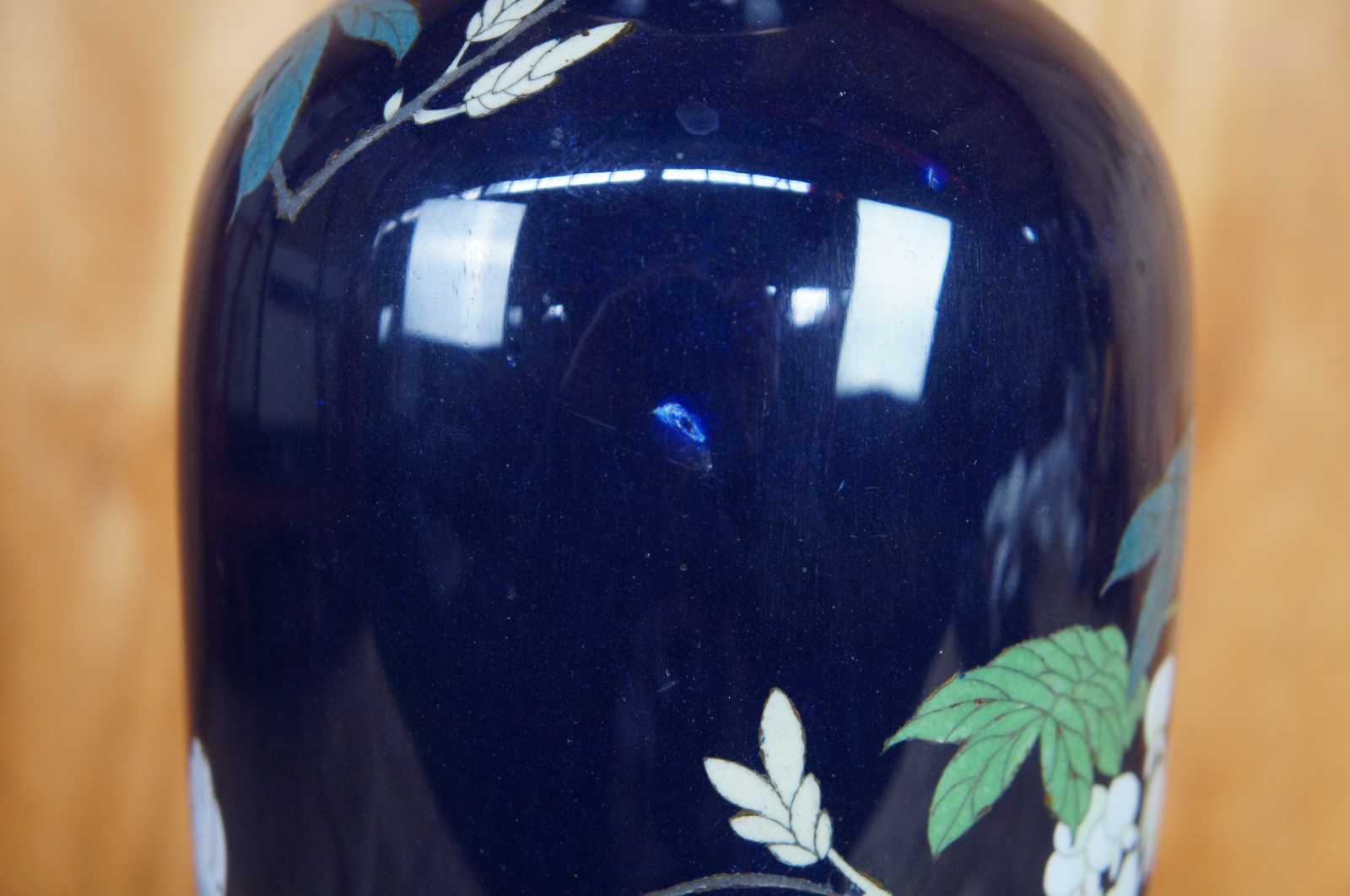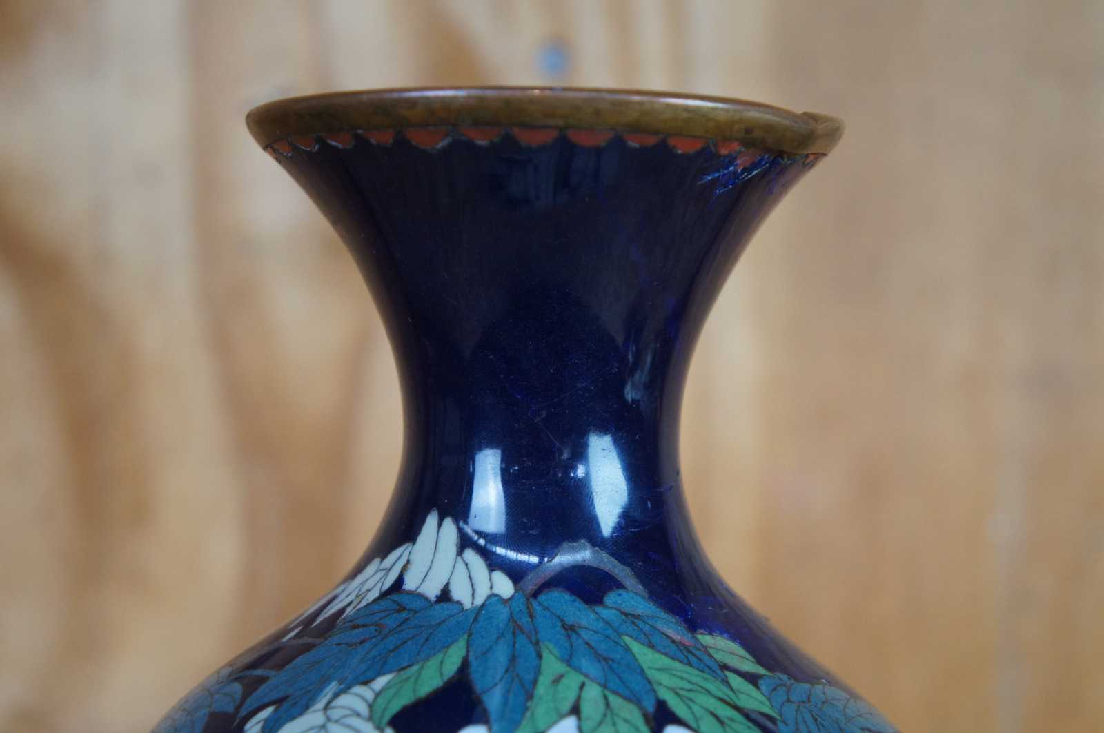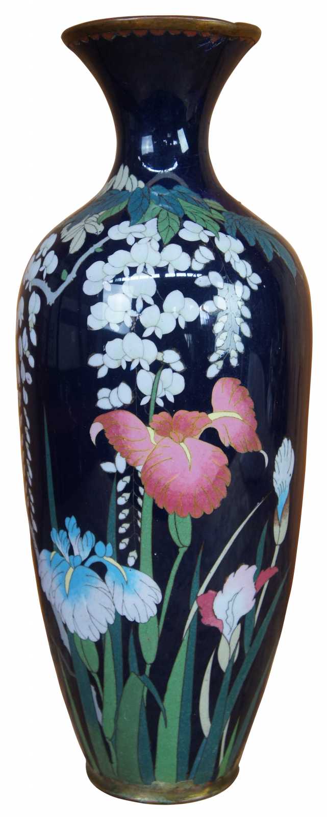 Tall vintage cloisonne vase with navy blue background setting off blue and pink irises and drooping lily of the valley.