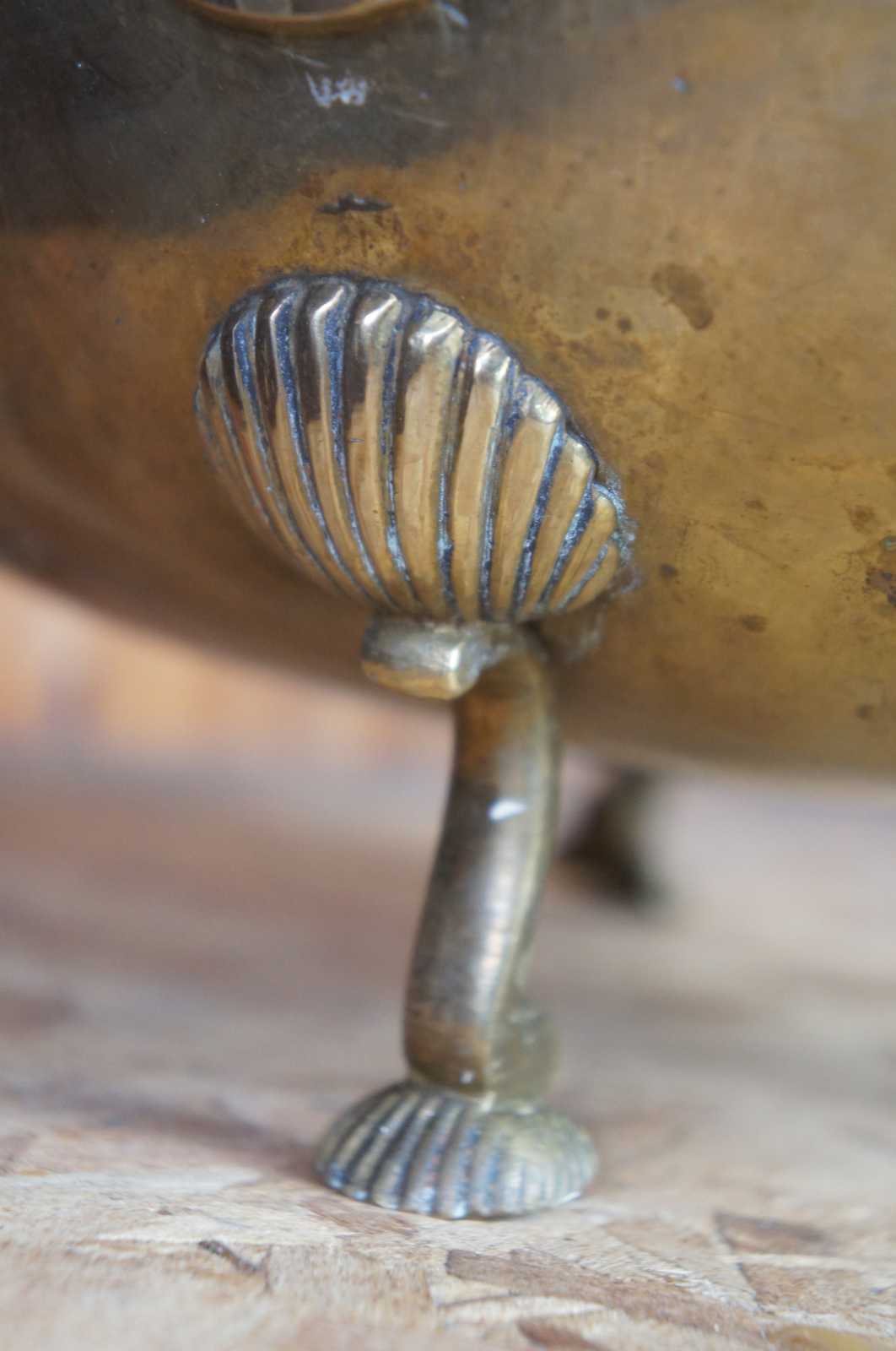 Vintage solid brass centerpiece bowl made in India with scalloped edges and scallop shell feet.