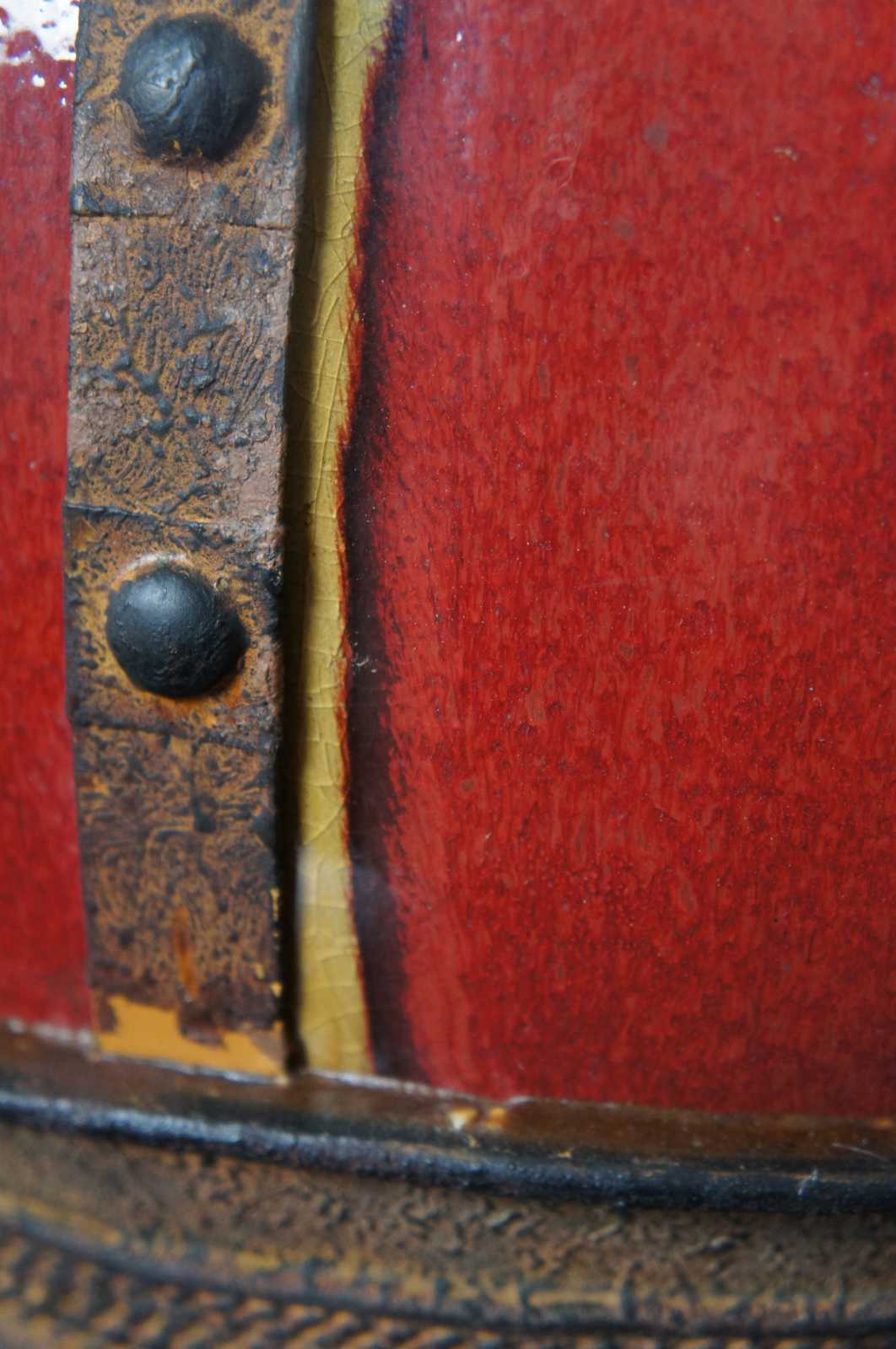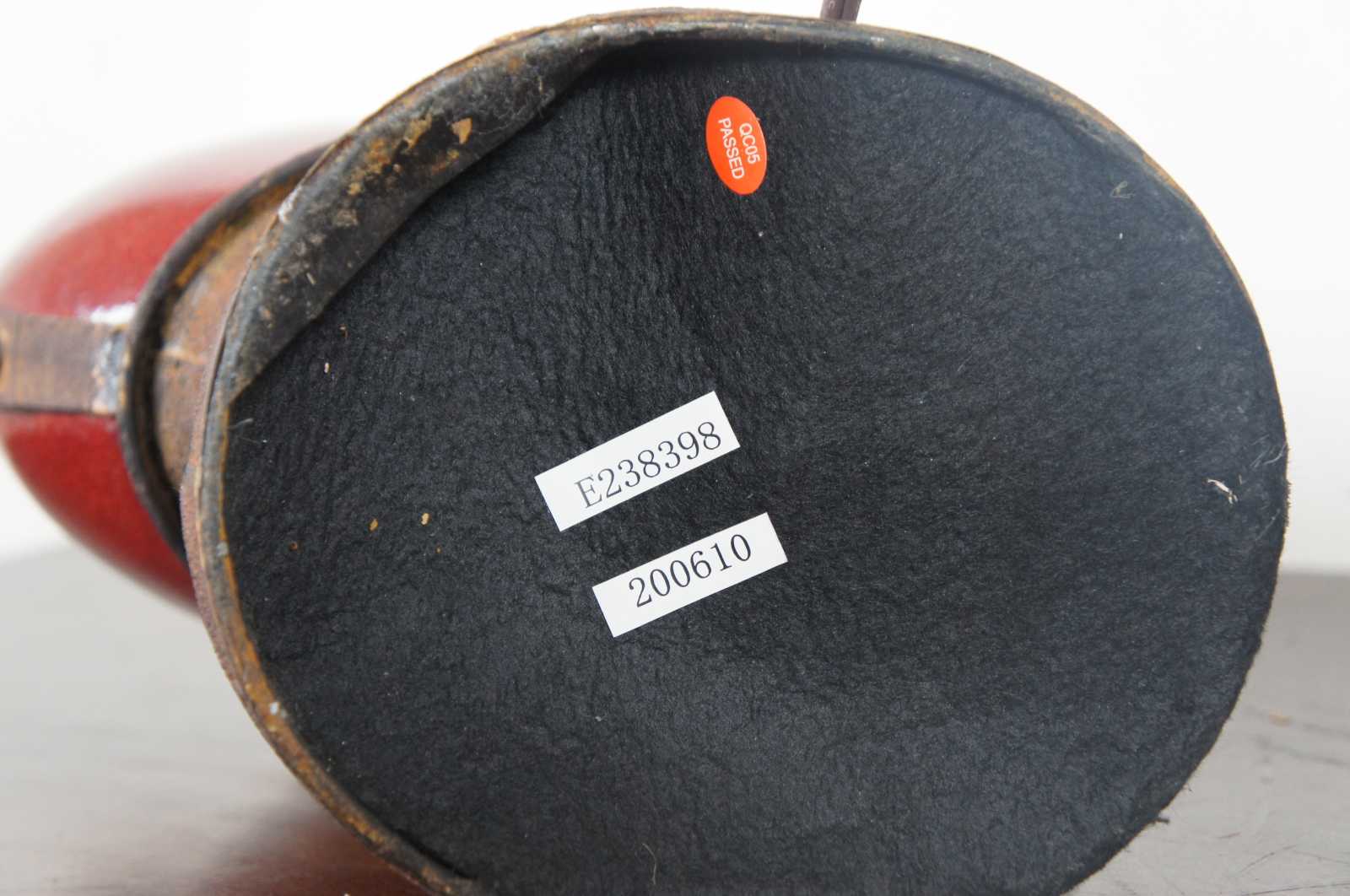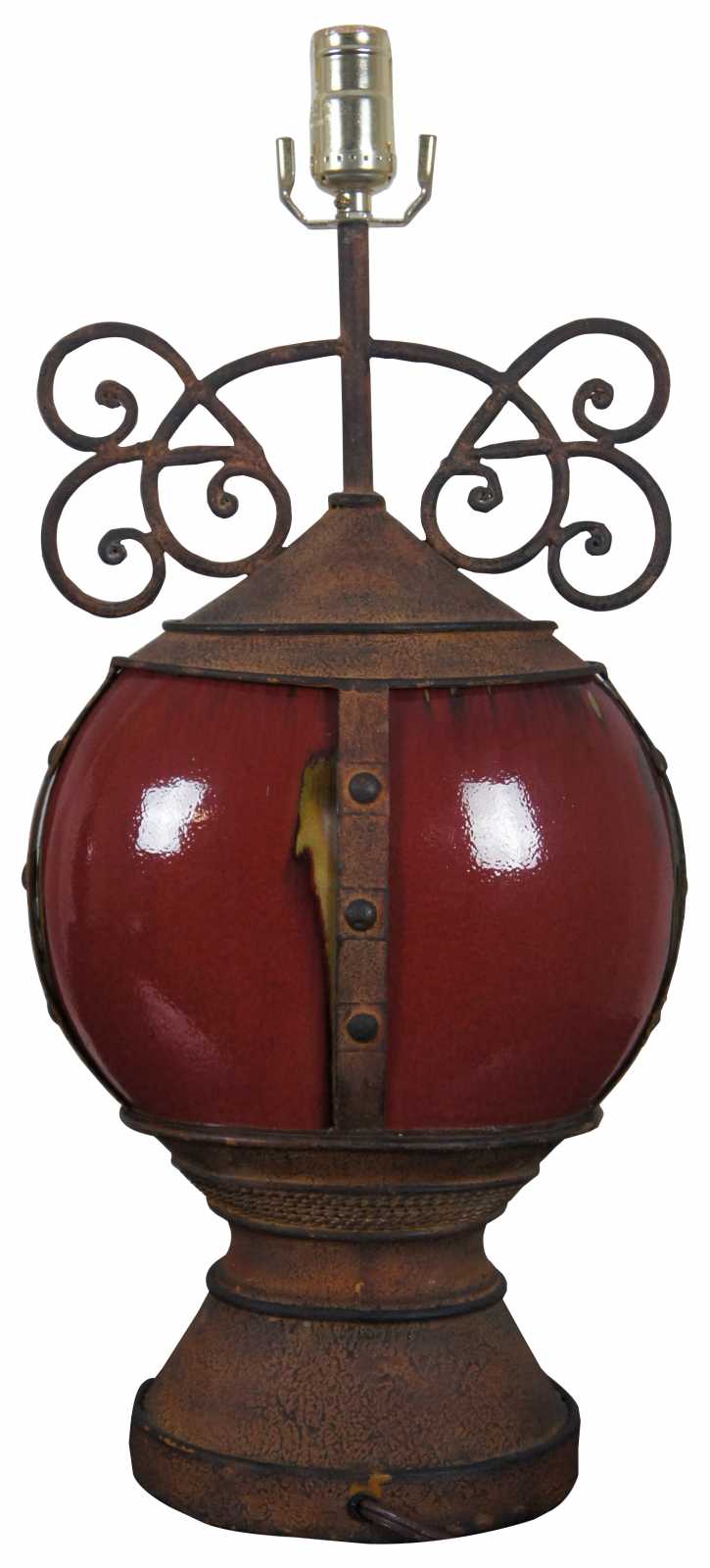 Pair of rustic round oxblood ceramic table lamps with iron bands, bases and scrolled accents.