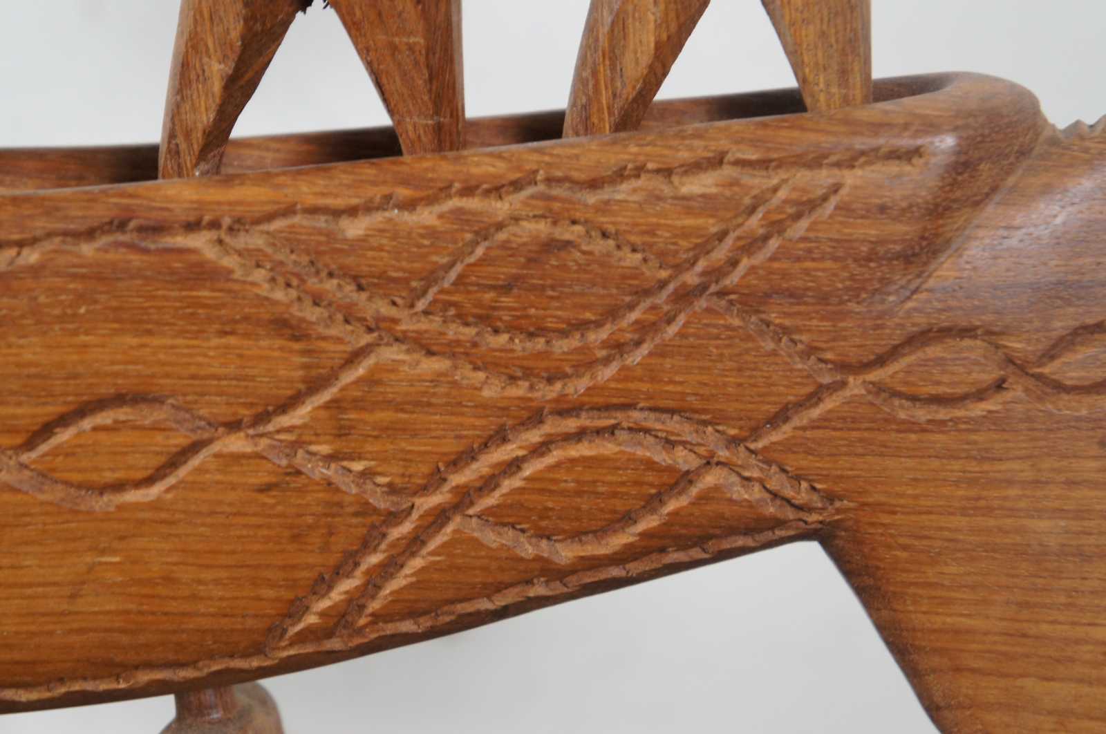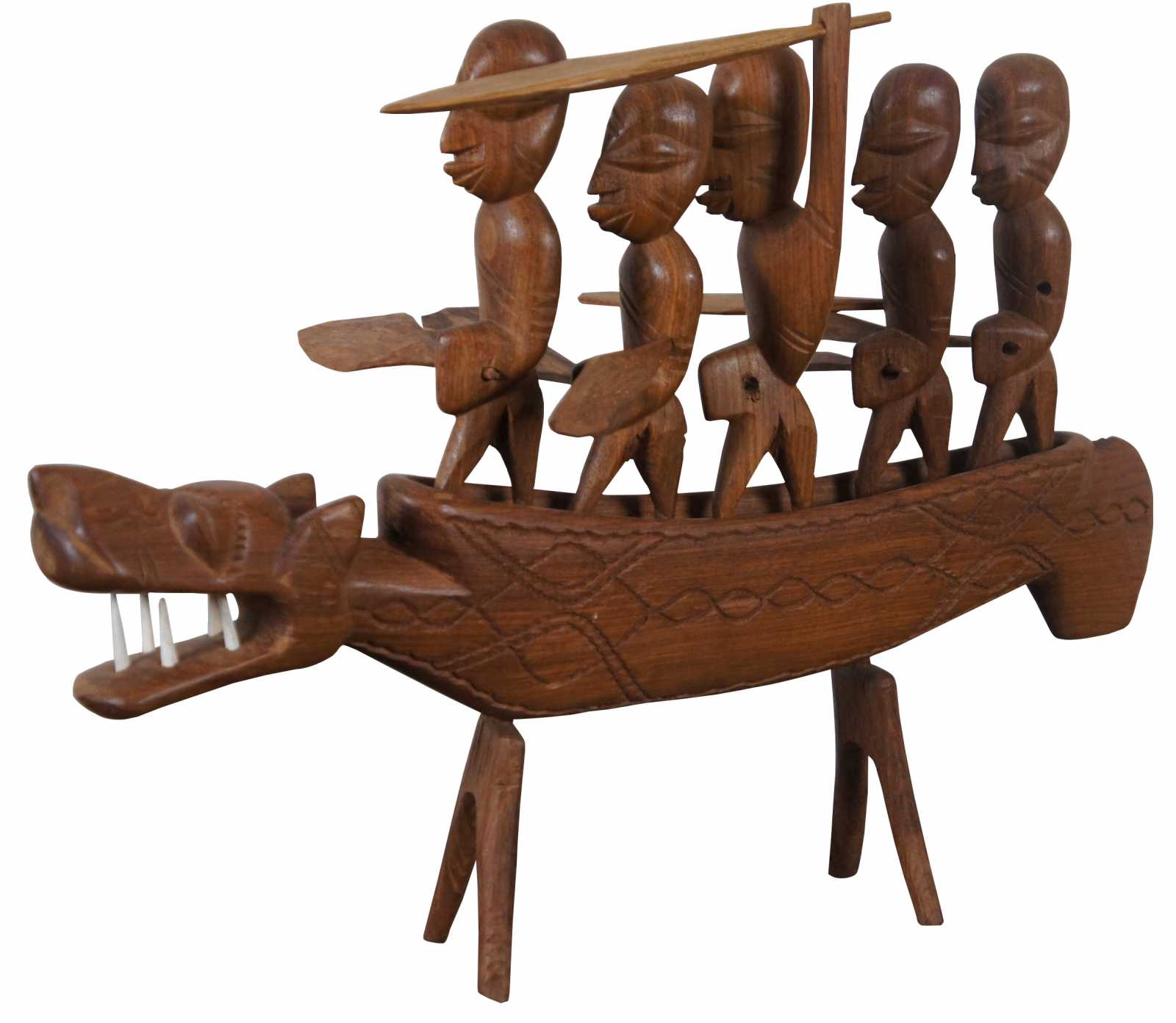 Primitive hand carved wooden boat or canoe with a dragon head prow, rowed by five standing figures. Made in Polynesia.