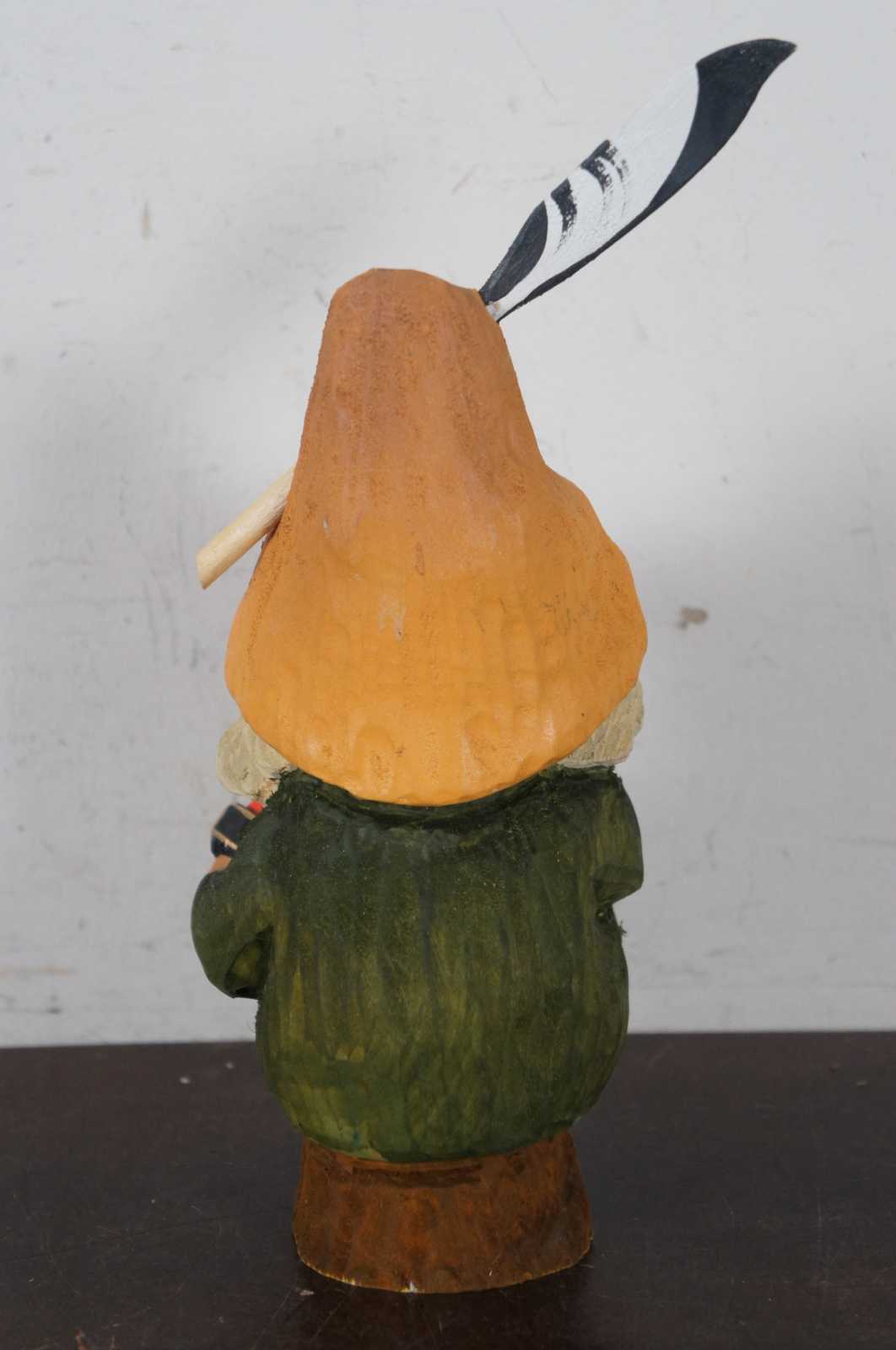Vintage hand carved troll figurine by Henning (catalogue number 131), dressed in green with black buckled shoes and yellow feathered hat, seated on a tree stump and playing the accordion. Marked “Svean NYC 1984” by previous owner in pen on base. “In Norwegian folklore there are many supernatural beings. The most famous of these are the trolls. At twilight time they emerge from the hills and mountains. They are rather huge and sometimes dangerous, but they might wink knowingly. - Henning Englesen’s workshop is situated at Toten, a rural district 120 km north of Oslo. The workshop was built in 1950 in a personal style. Engelsen and his family have managed to create a good and inspiring atmosphere among the employees who all come from the district.”