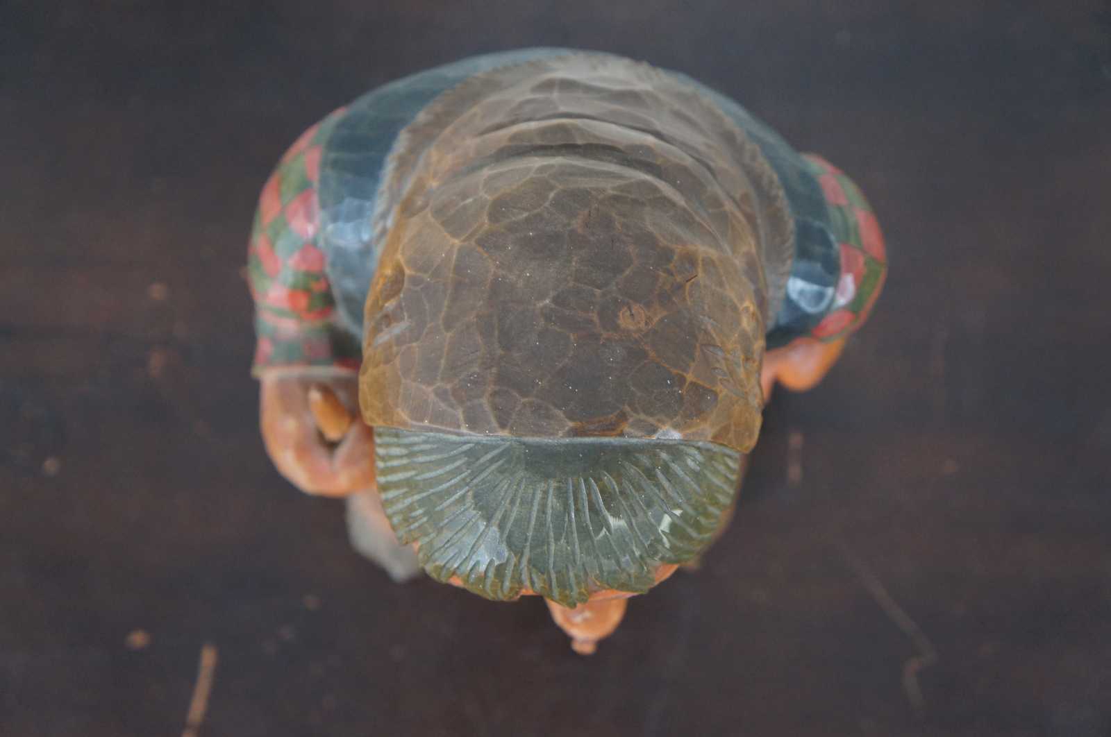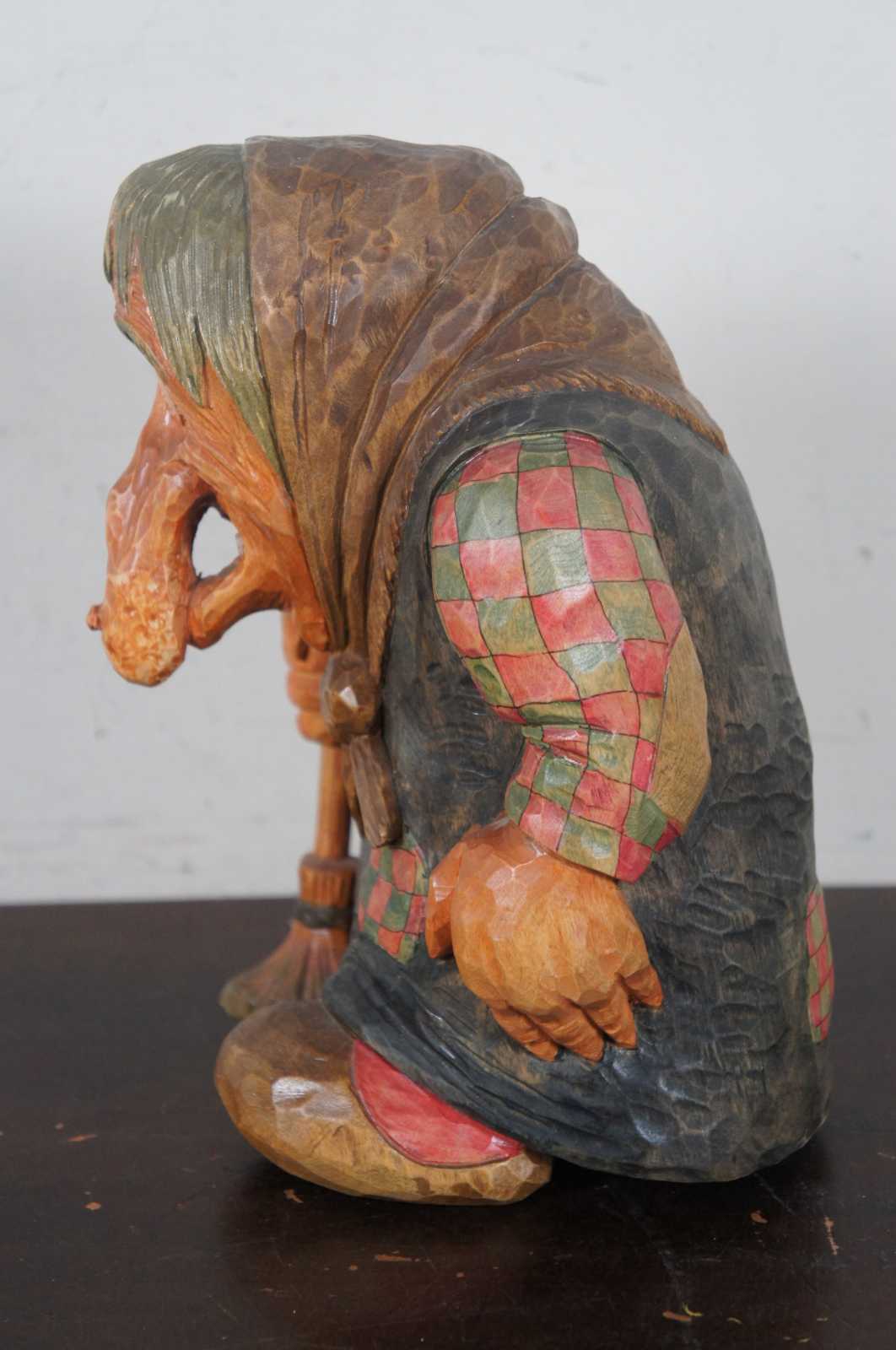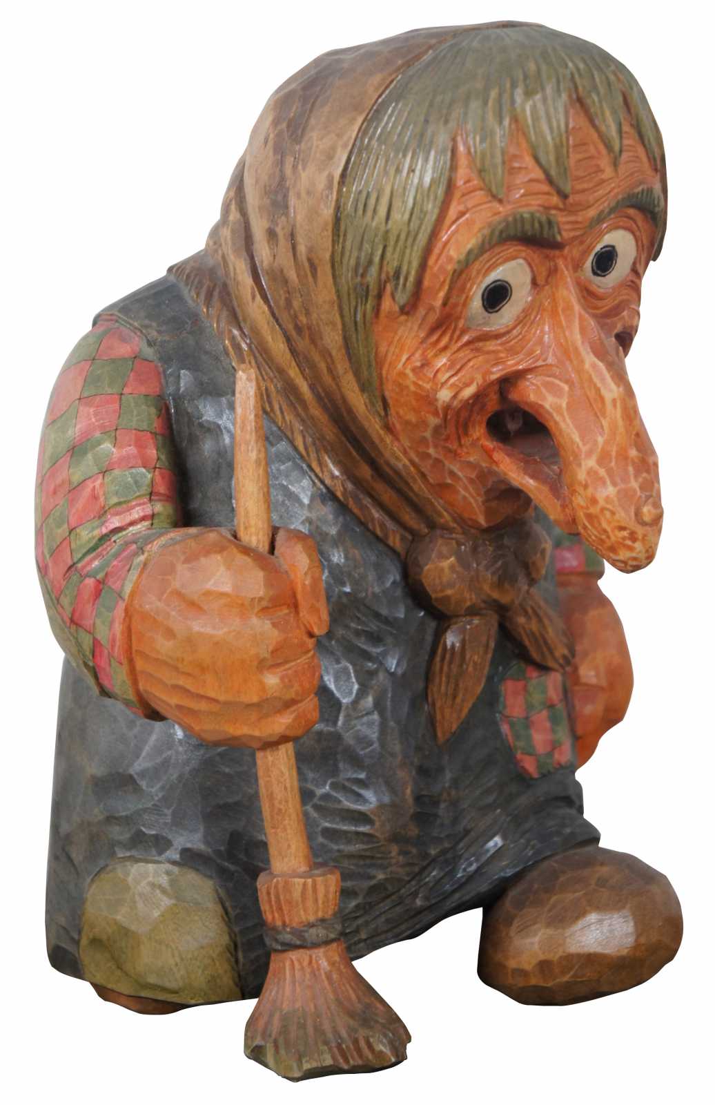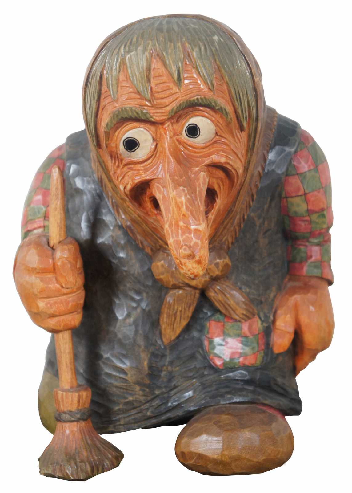 Vintage hand carved troll figurine by Anton Sveen, dressed in a checkered shirt with blue pinafore, brown kerchief, wooden shoes and holding a broom, signed along bottom of shoe. Marked “Hildi NYC May 1979” by previous owner in pen on base. “Anton (ASv) Sveen (1914 - 2009) was active/lived in Norway. Anton Sveen is known for Hand-carved wooden trolls, folk art.”