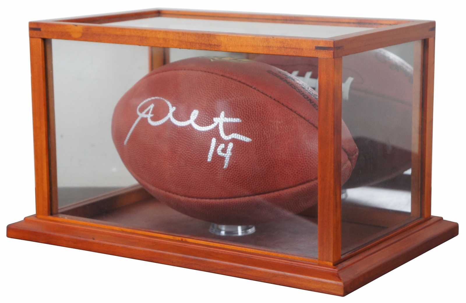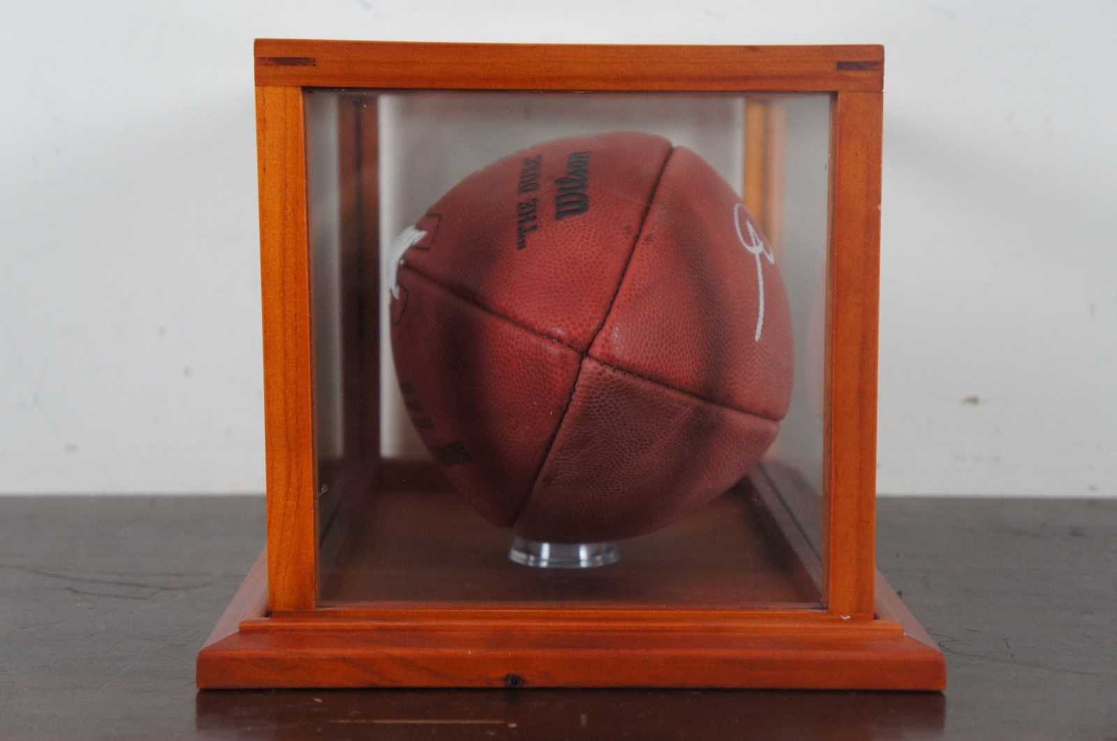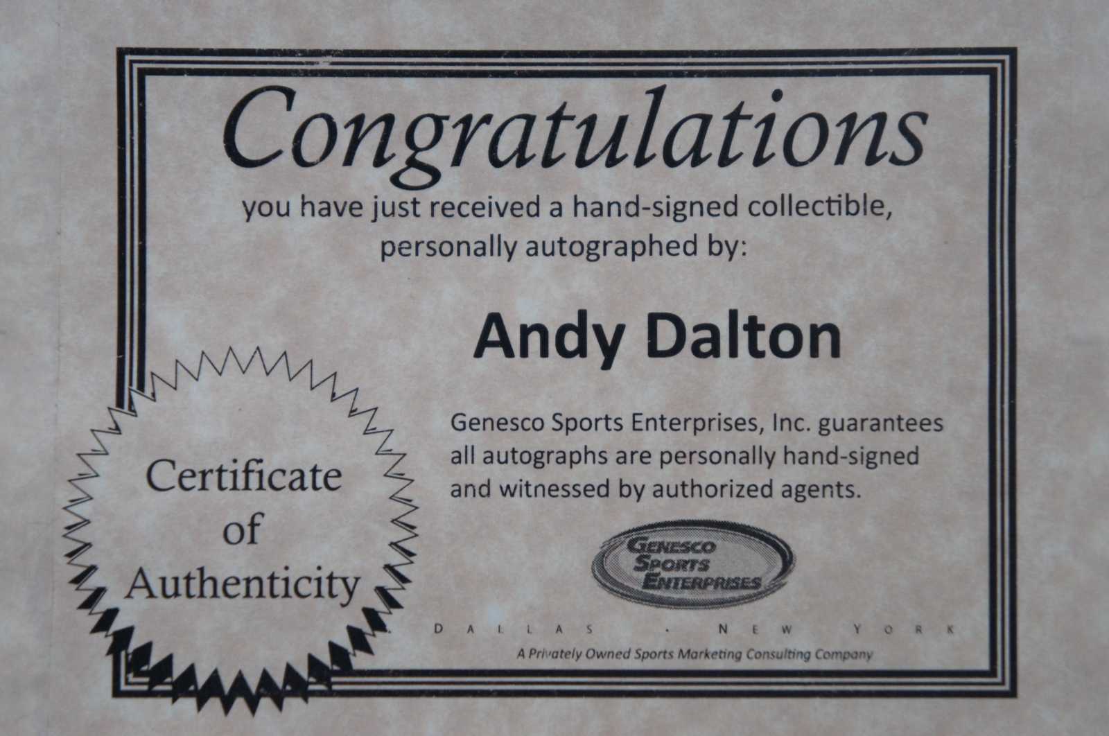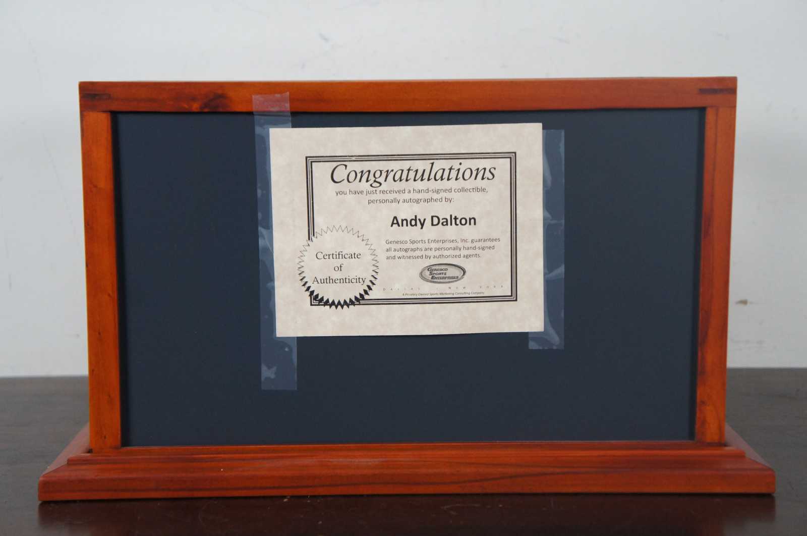 Collectible NFL football in shadowbox display autographed by Andy Dalton; includes COA. “Andrew Gregory Dalton (born October 29, 1987) is an American football quarterback for the Chicago Bears of the National Football League (NFL). He played college football at Texas Christian University (TCU), and in his final college game led TCU to a win in the 2011 Rose Bowl. He is the all-time leader in wins at Texas Christian University.[1]