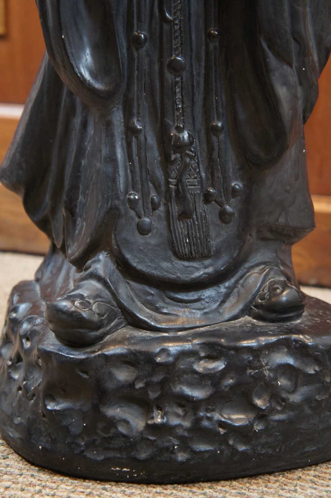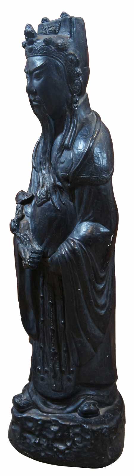 Black ceramic sculpture of the Chinese diety Lu Hsing produced by The Museum Company. “Luxing, Wade-Giles romanization Lu Hsing, in Chinese mythology, one of three stellar gods known collectively as Fulushou. He was honoured as a deity who could make people happy through increased salaries or promotions that brought prosperity (lu). In life, Luxing was a scholar who bore the name Shi Fen. In the 2nd century bc he was a favourite of Emperor Jing and was made a high official at the royal court. His family prospered through imperial generosity. Perhaps because the Chinese have many gods of wealth and happiness, Luxing is not nearly so widely honoured as is Shouxing, the god of longevity.”