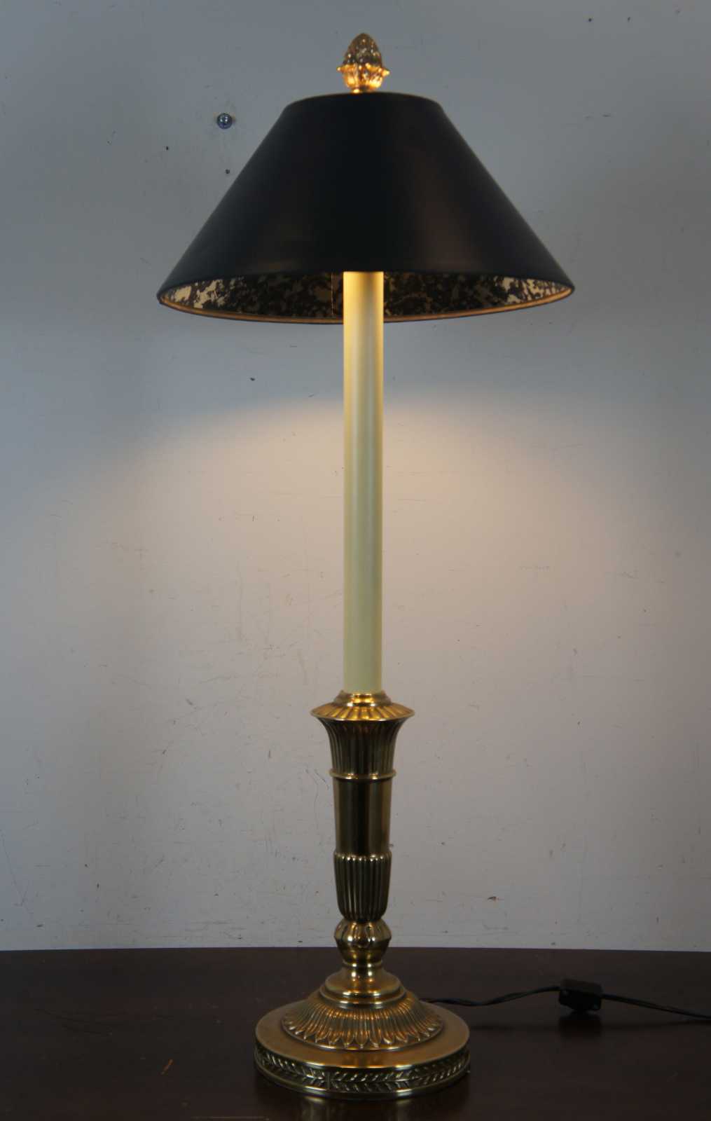 Robert Abbey Inc brass candlestick shaped table lamp with acorn finial and black shade with reflective interior.