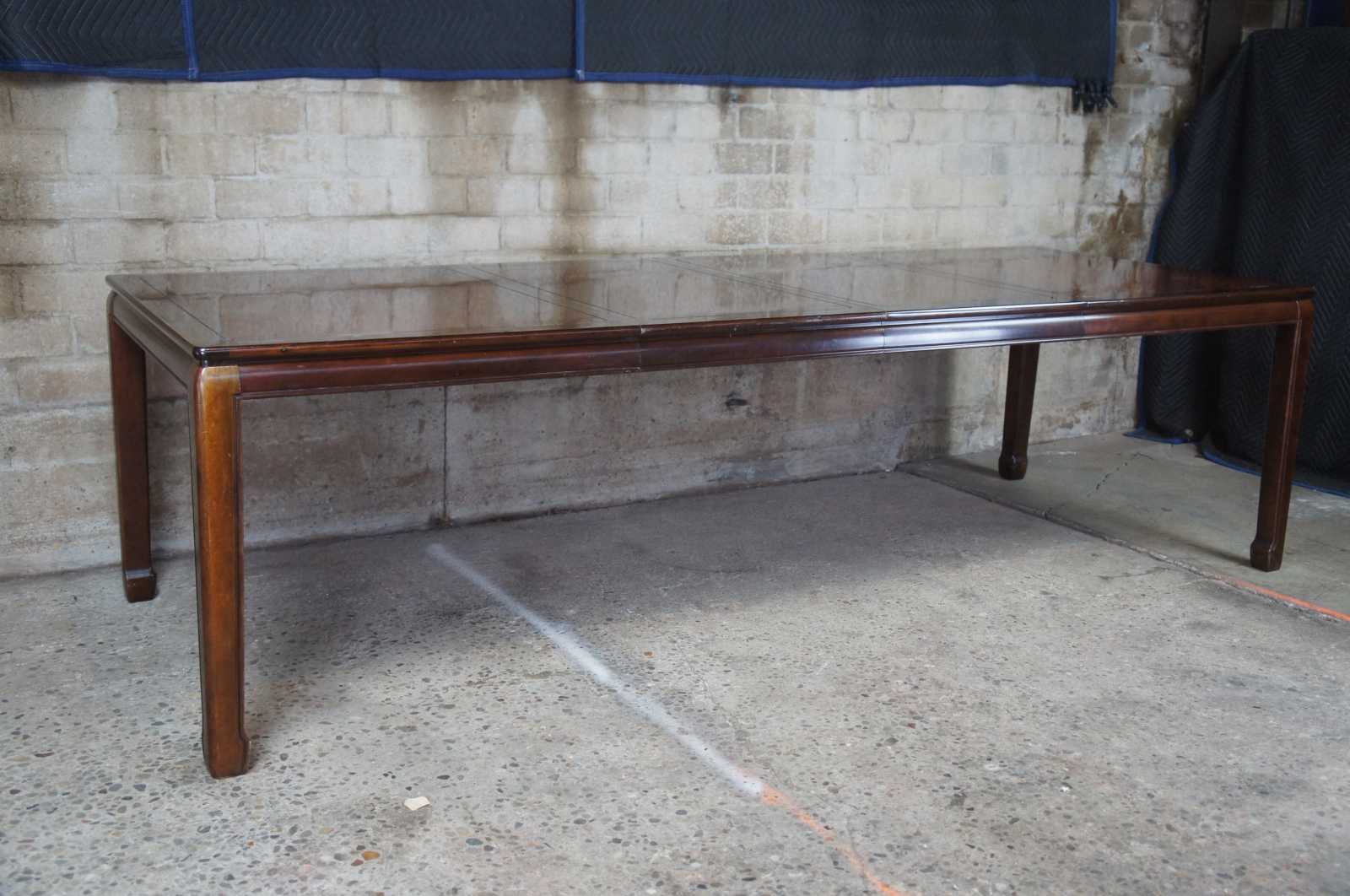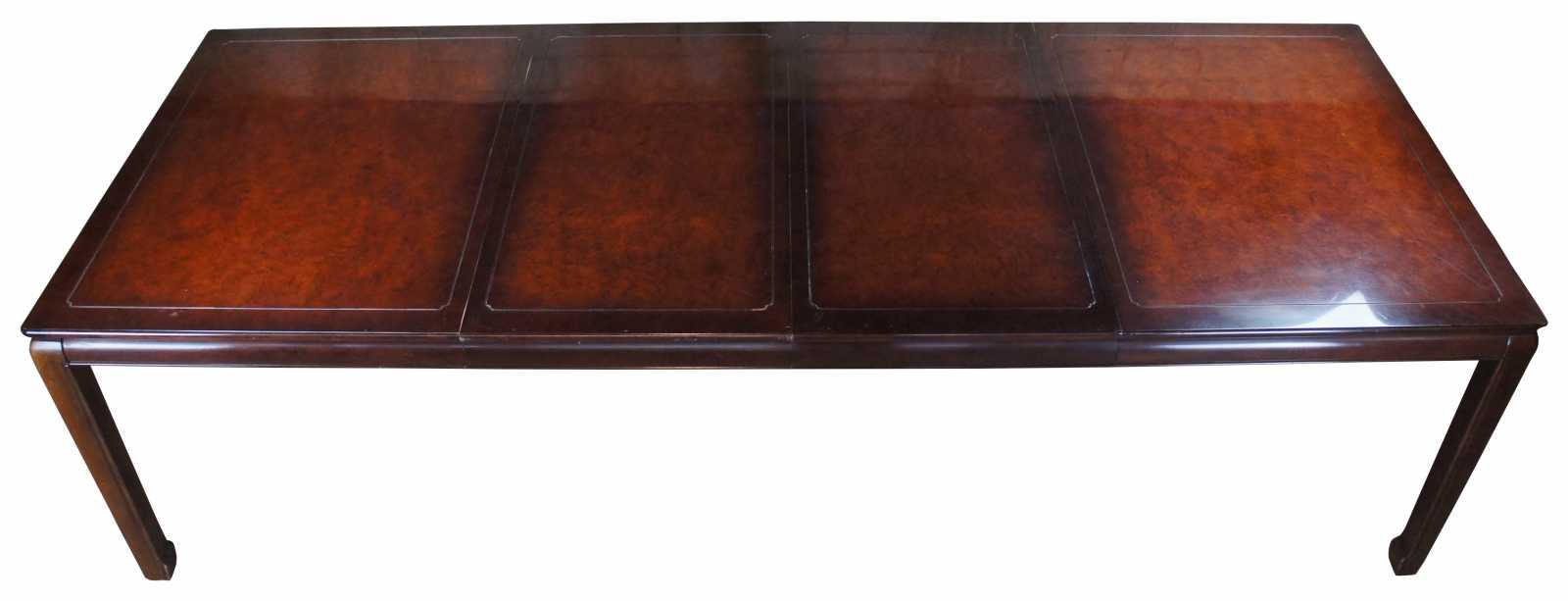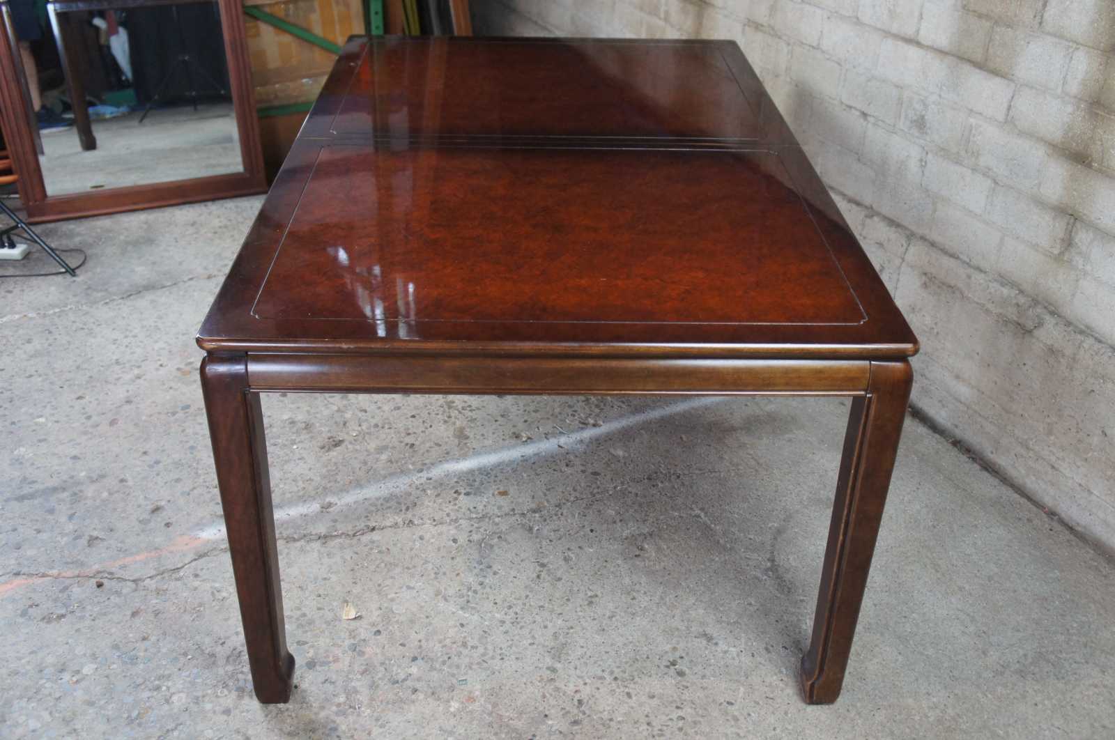 1980s White Furniture Company Mandarin dining table, 330-12. Rectangular form with mahogany and burlwood top. Includes 2 leafs for extensions.