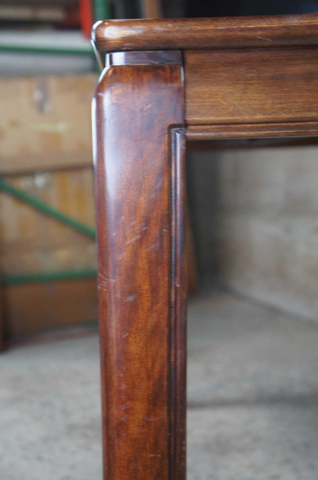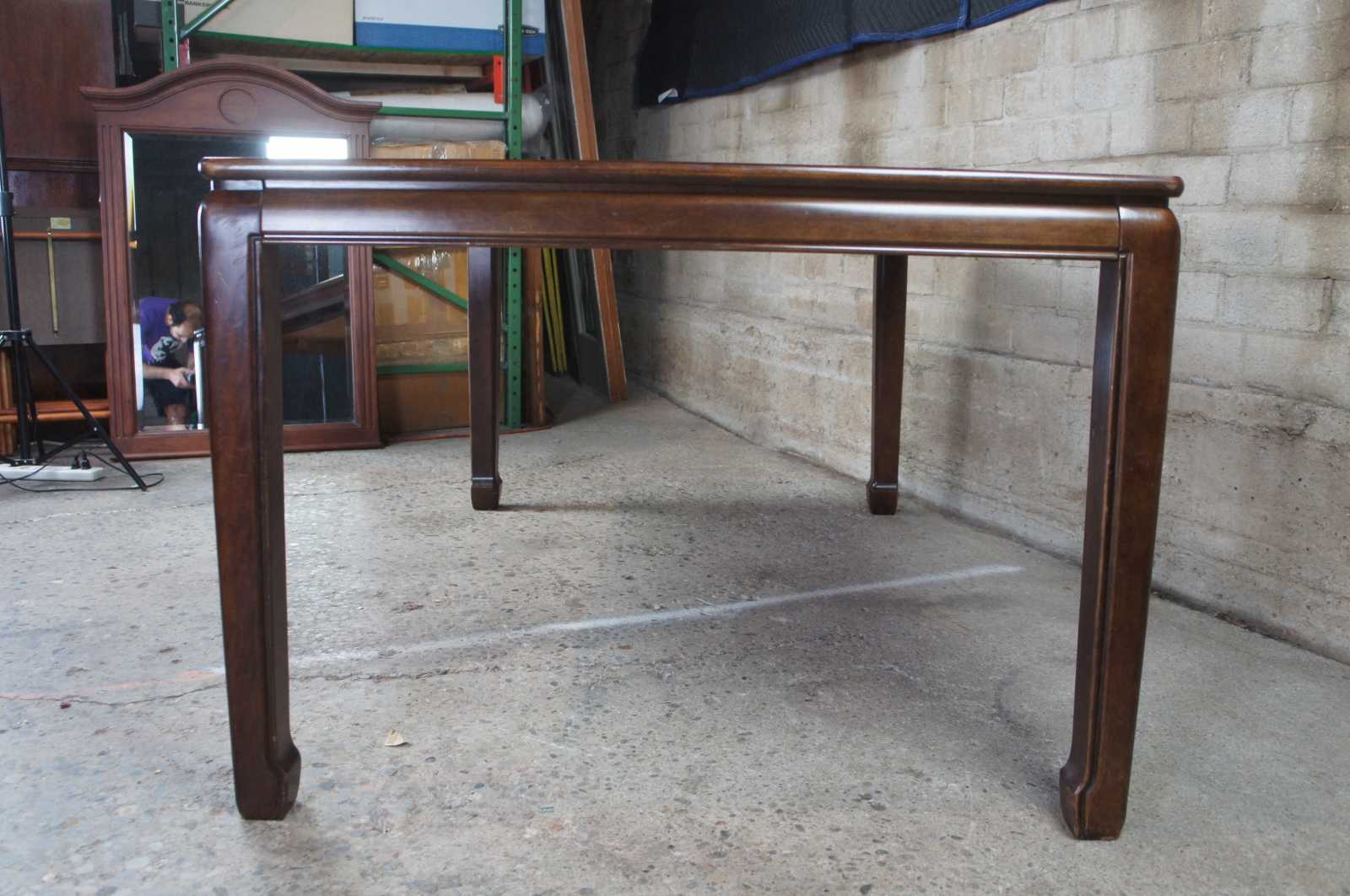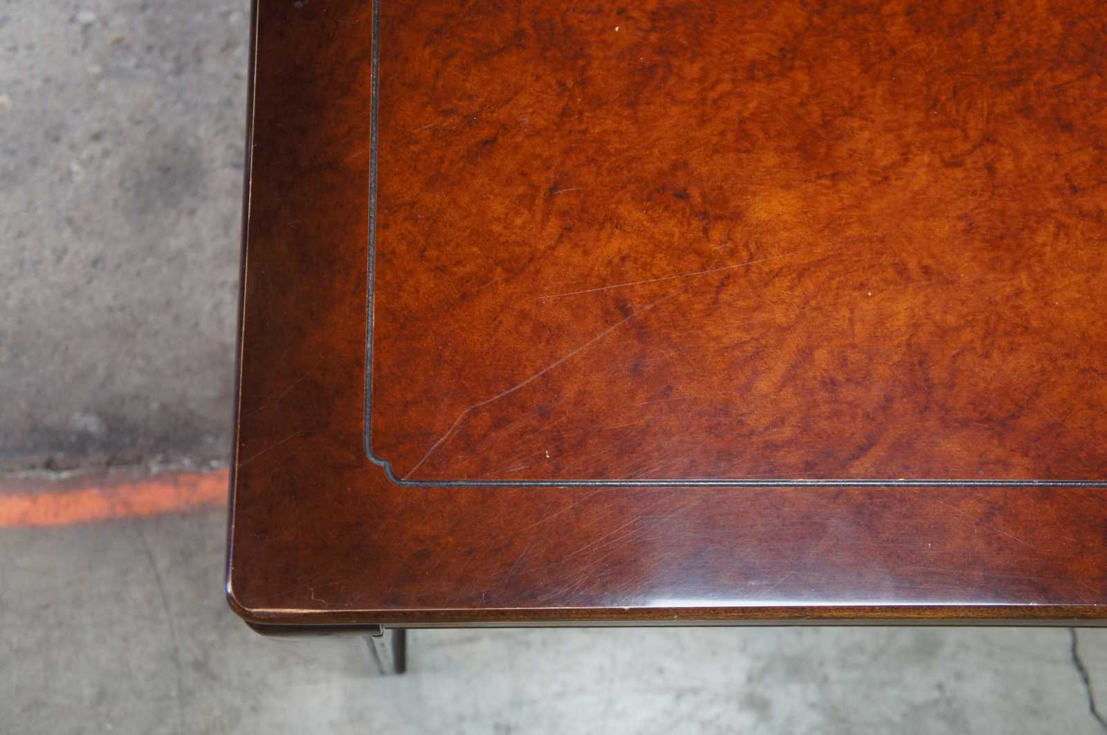 1980s White Furniture Company Mandarin dining table, 330-12. Rectangular form with mahogany and burlwood top. Includes 2 leafs for extensions.