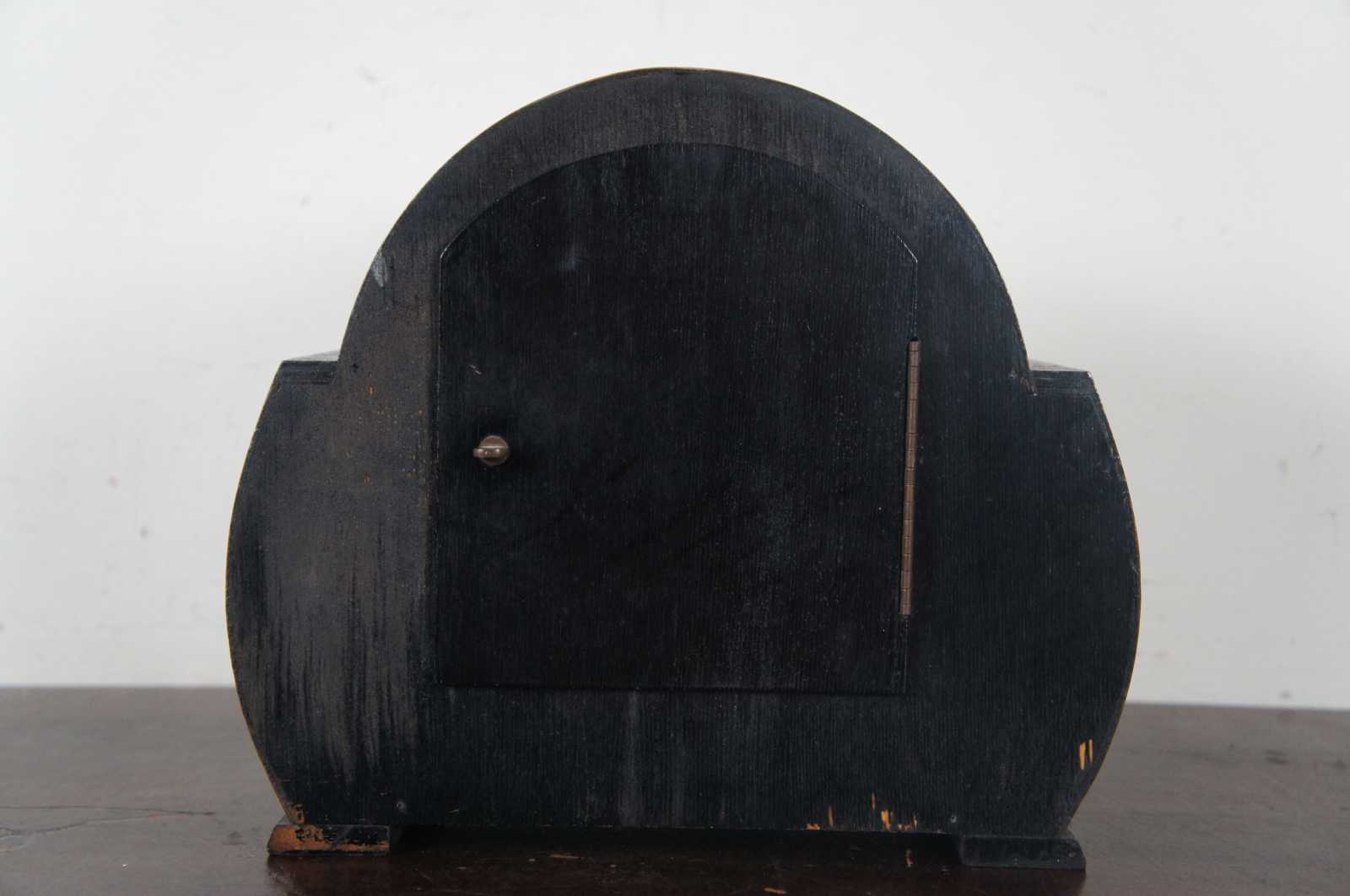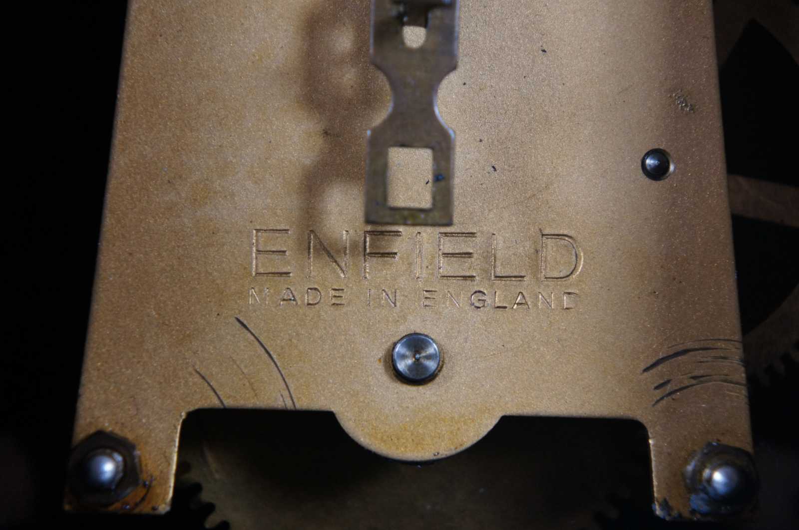 Antique oak mantel clock by Enfield England with art deco styling and pierced brass hands.