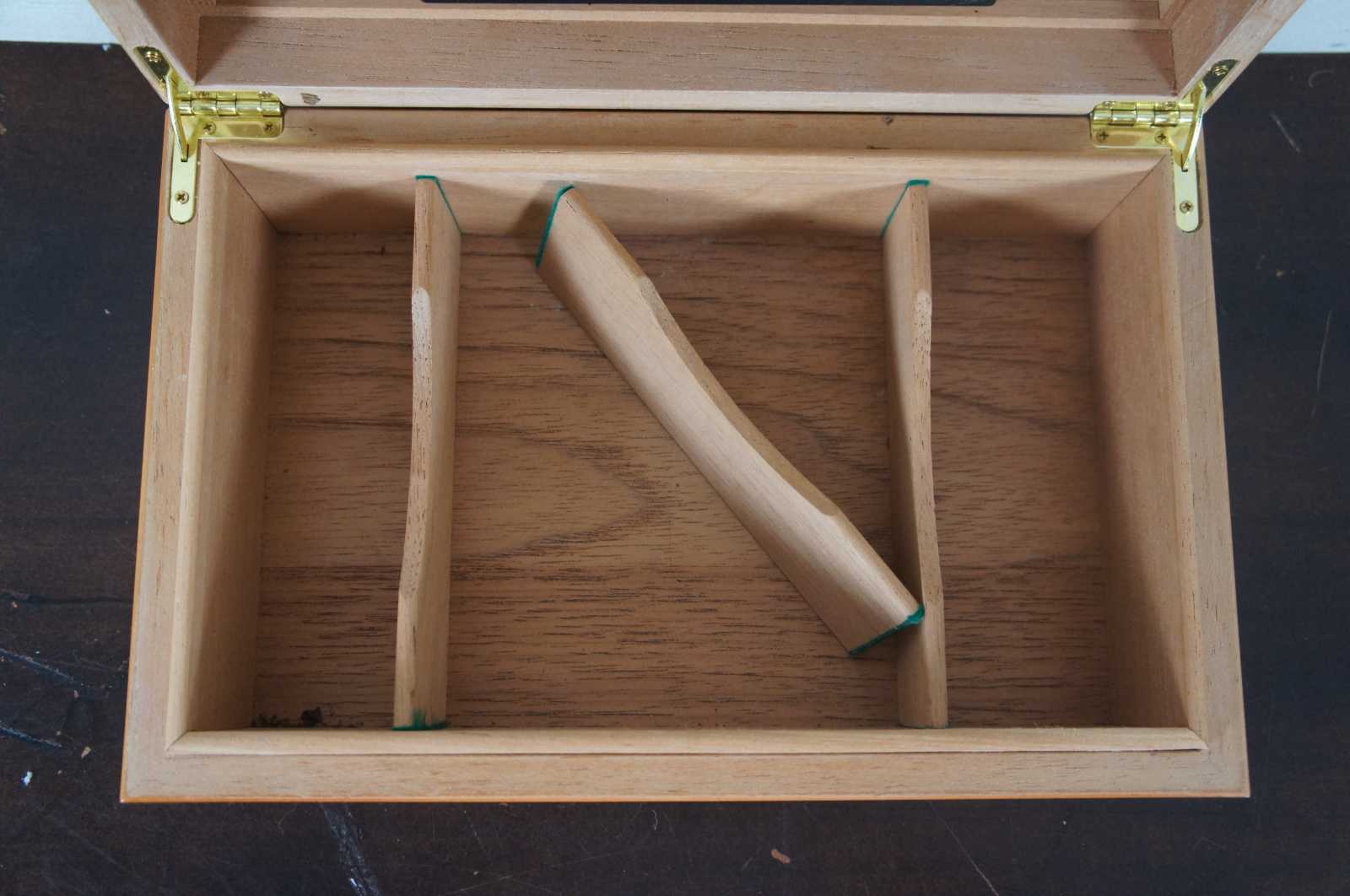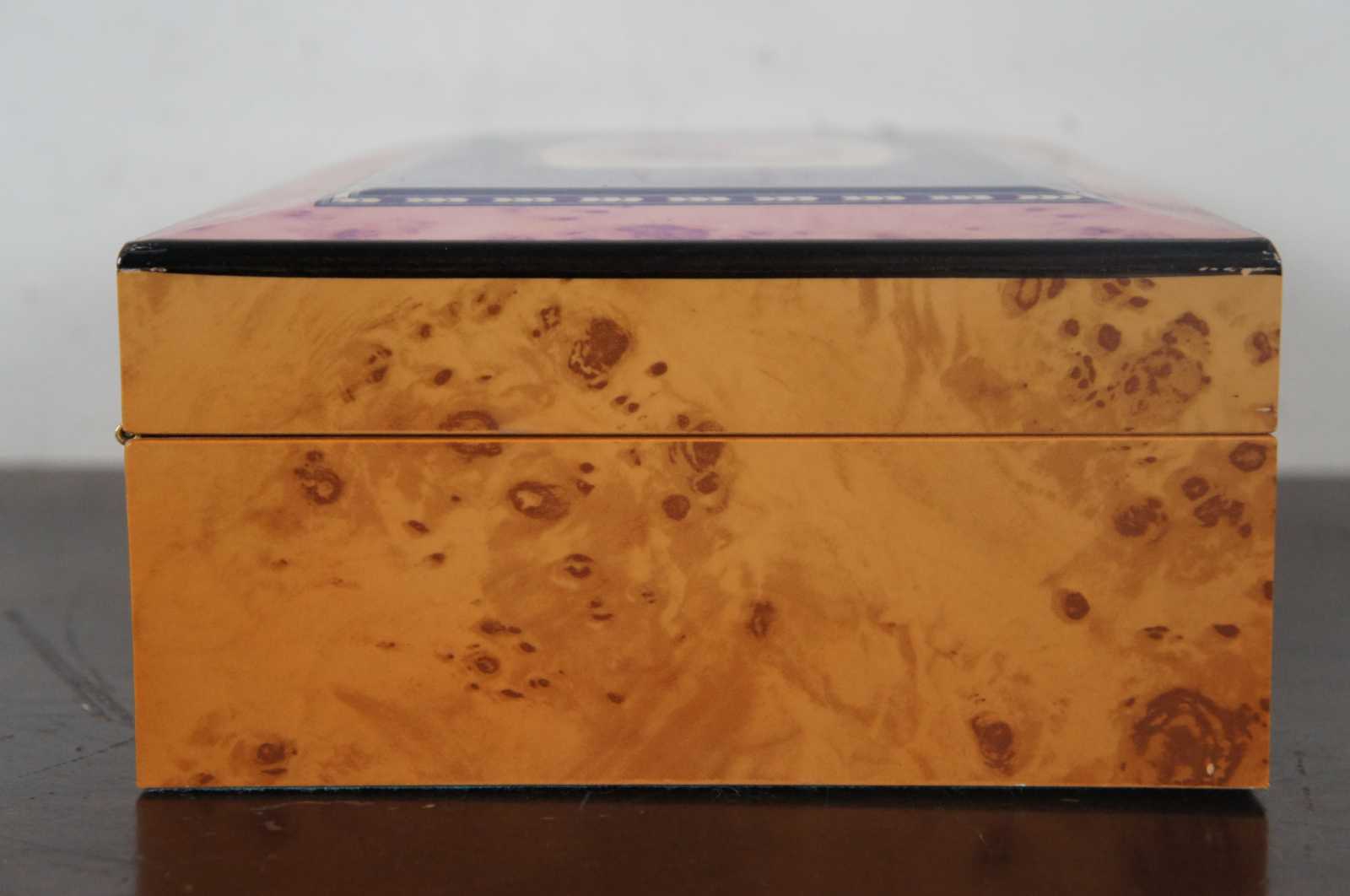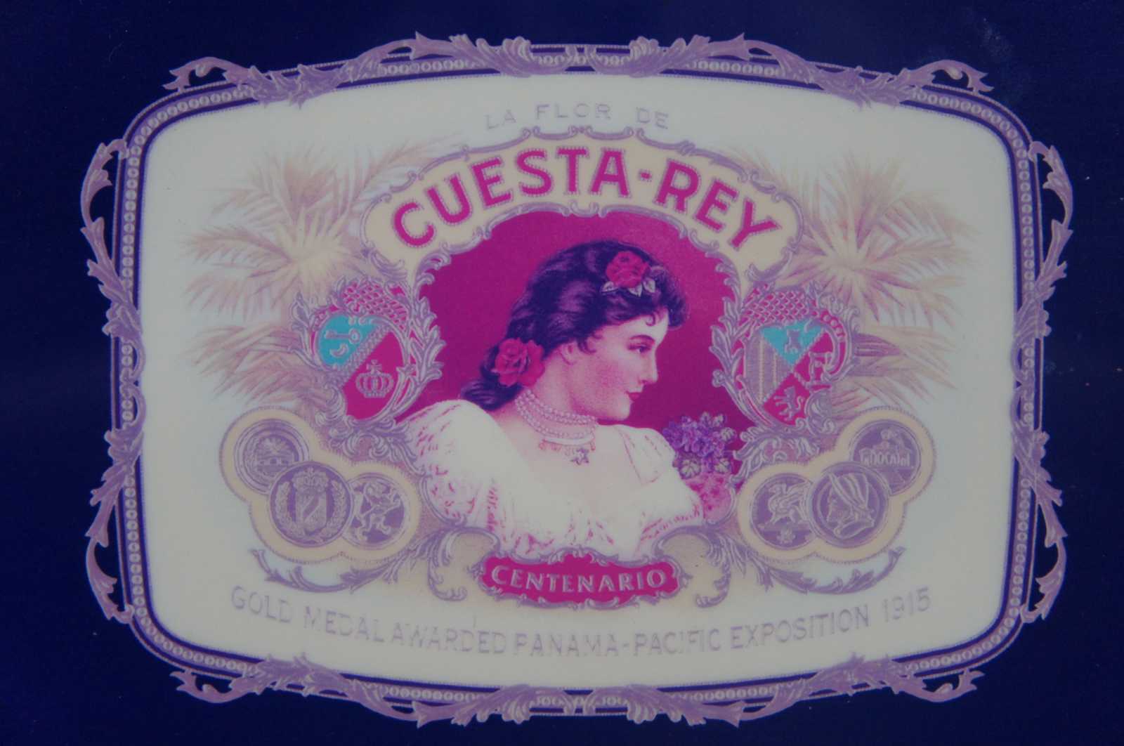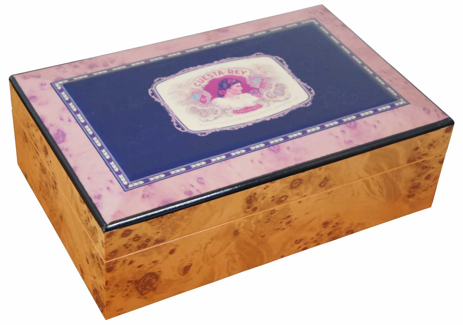 High gloss burl wood cigar box/humidor with three removable dividers and hygrometer with Cuesta-Rey label printed on the colored top.