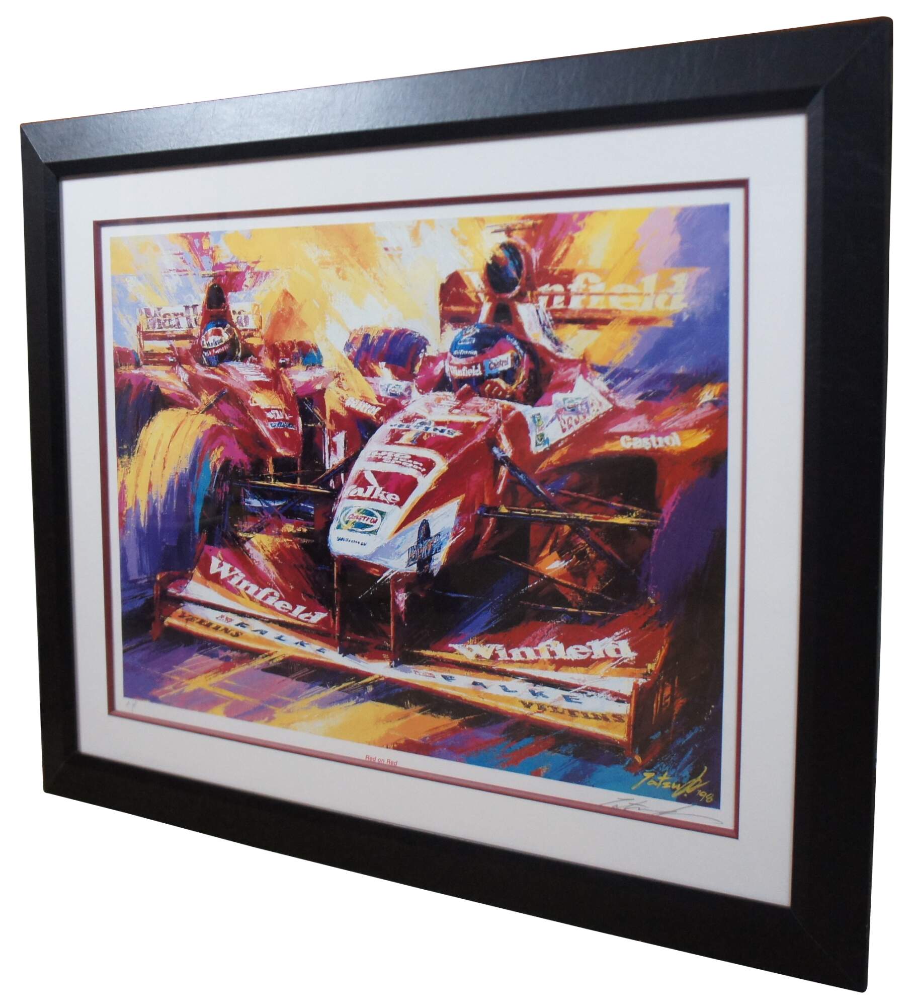 Vintage expressionist Formula One racing lithograph print titled “Red on Red,” by Tatsu Nakatsu, pencil signed and numbered 149/500.
