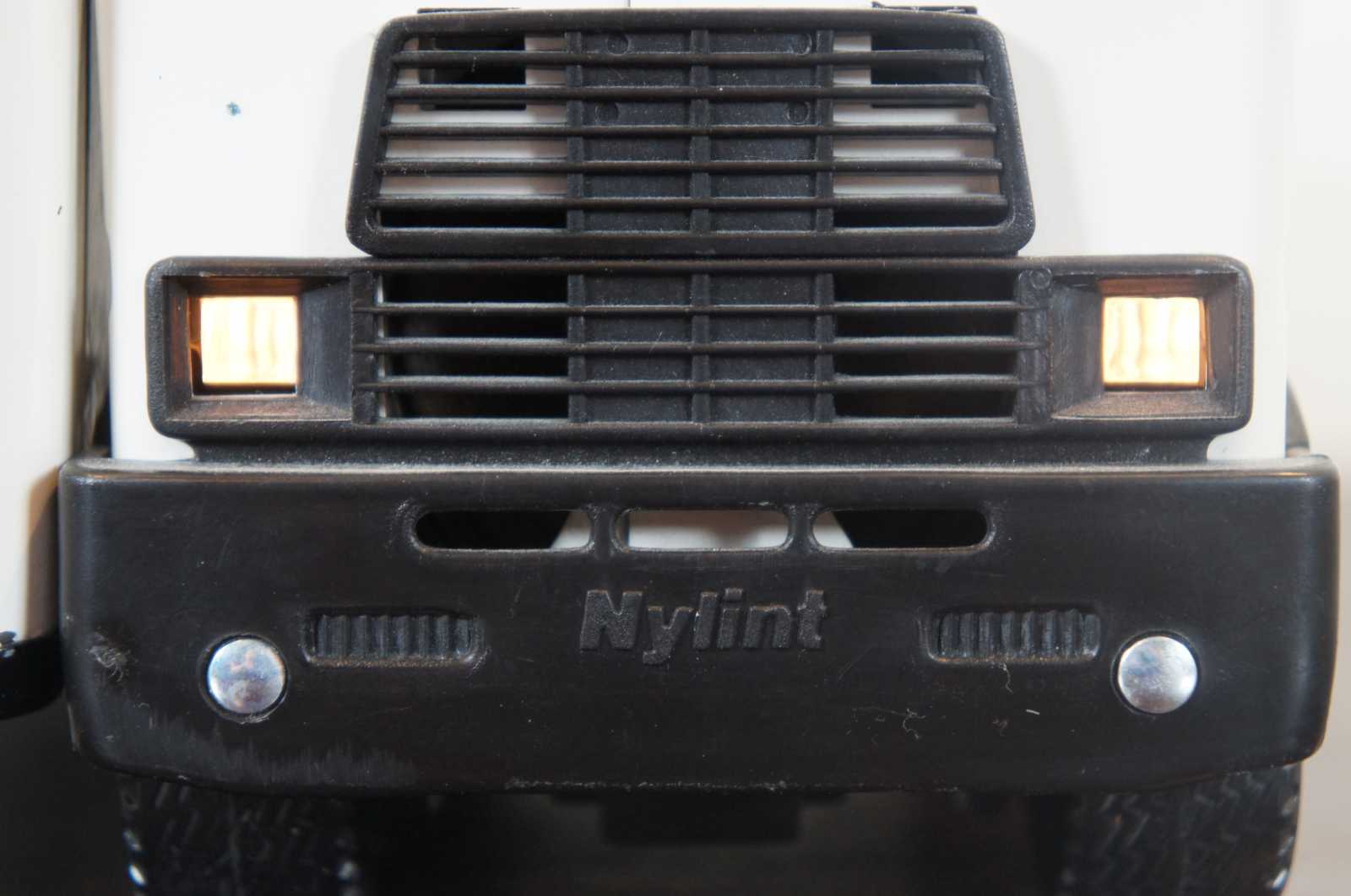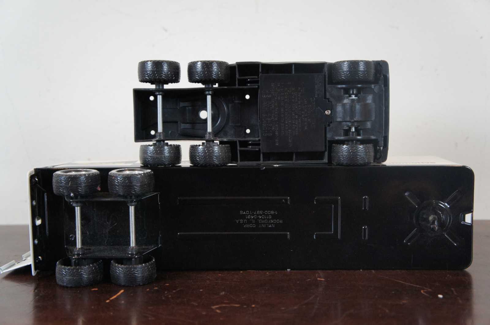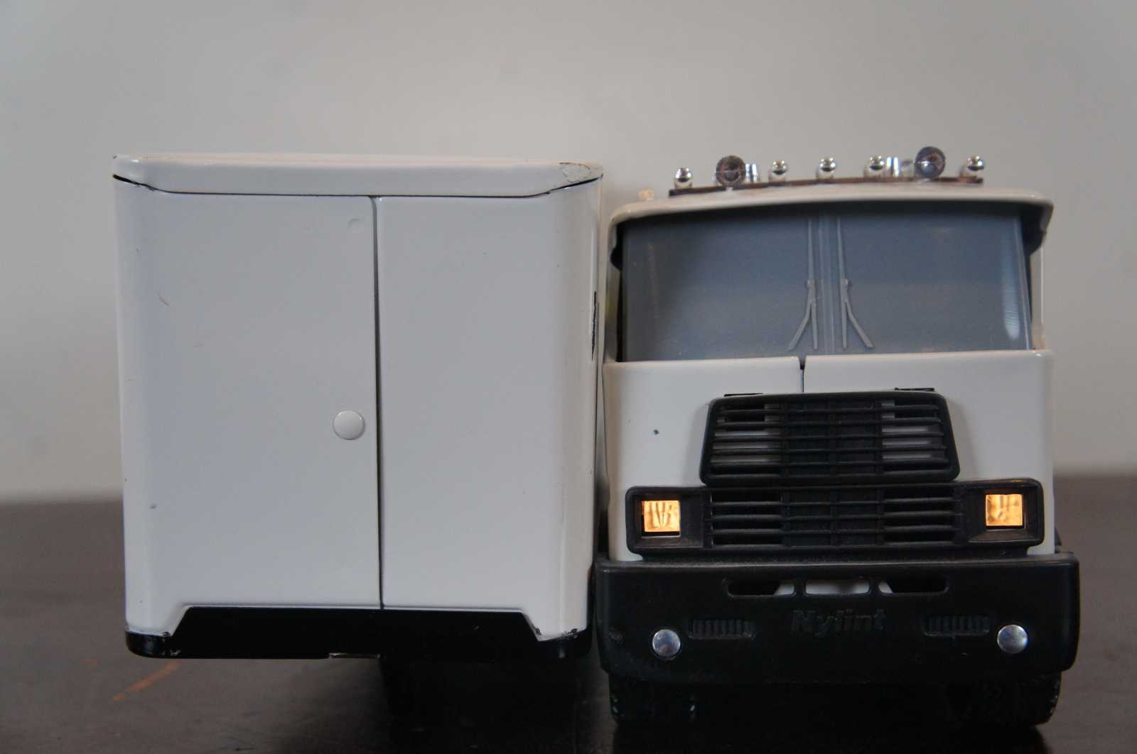 Vintage battery operated Nylint Toys white semi truck or 18 wheeler with working lights and sound. Features Anco Racing, Belden Automotive, Champion, Wagner Lighting, Cooper Automotive.