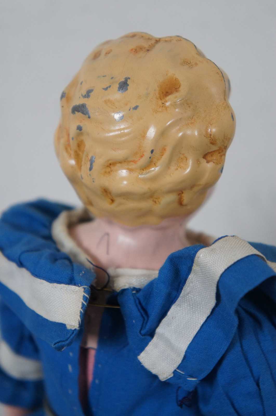 Antique 19th Century German doll with painted tin head, bisque hands and cloth body, dressed in a blue and white dress with leather shoes.