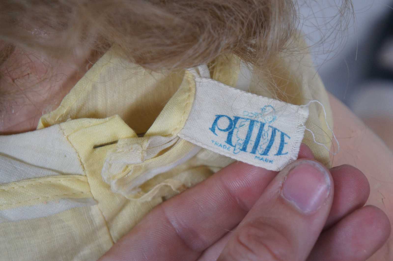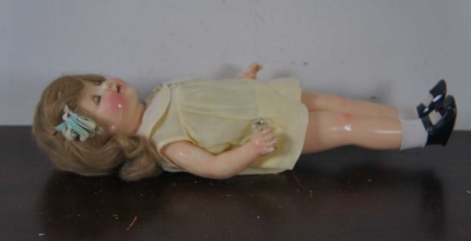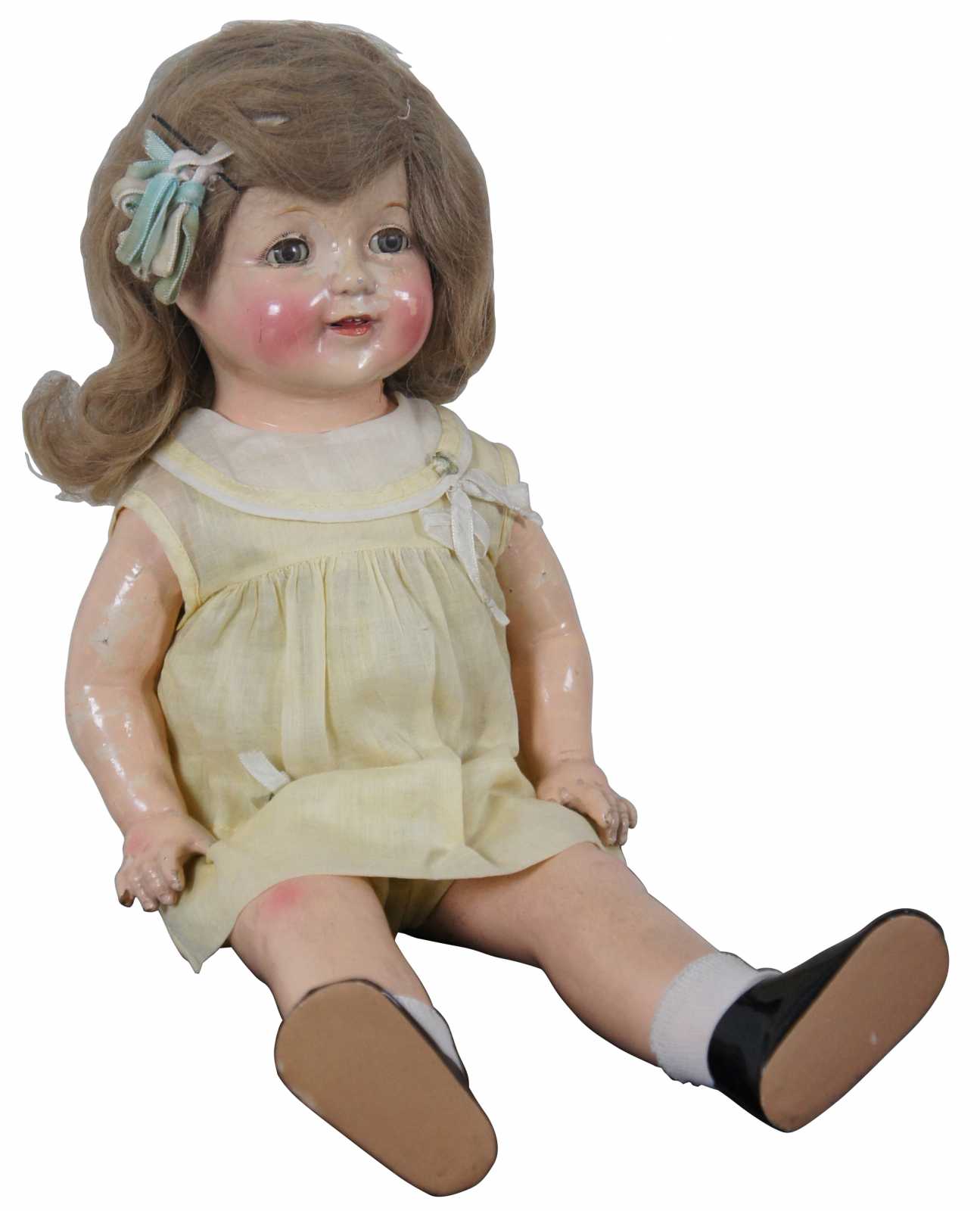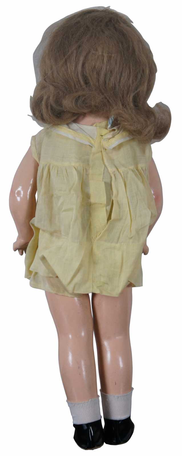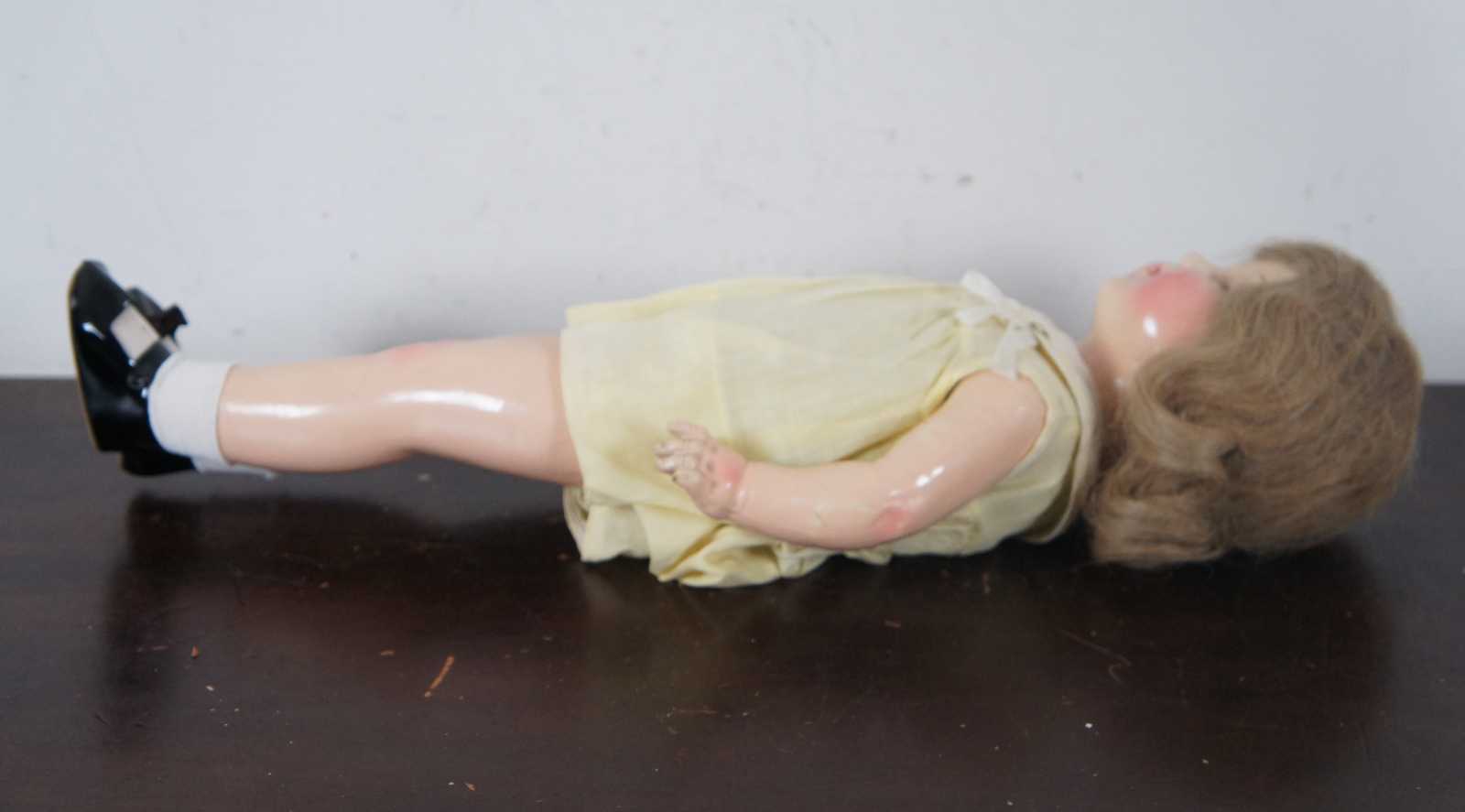 Antique early 20th century Petite American Character composition and cloth body doll with jointed limbs, light brown/dark blonde hair, and sleep eyes, dressed in a yellow dress with black shoes.