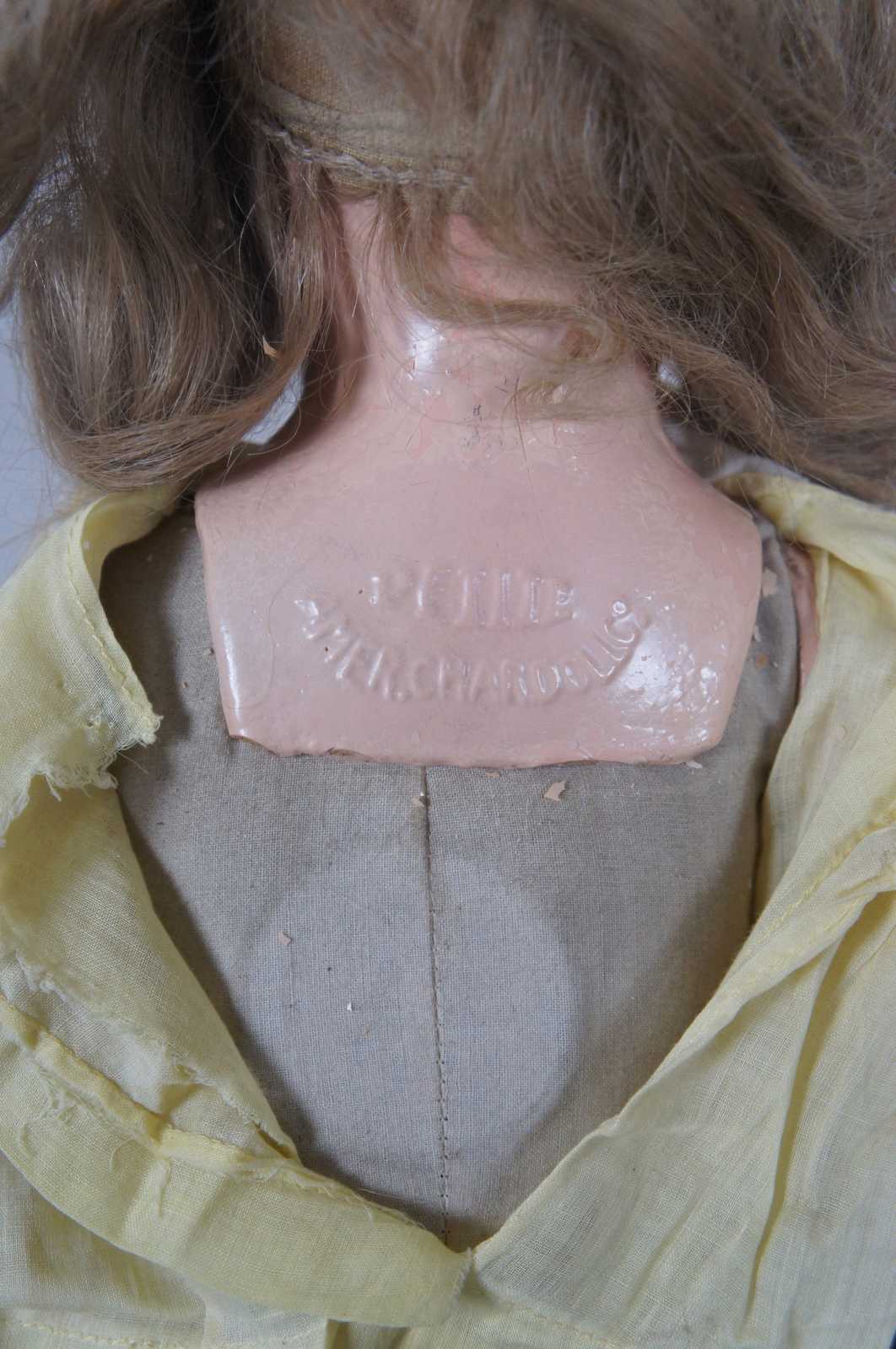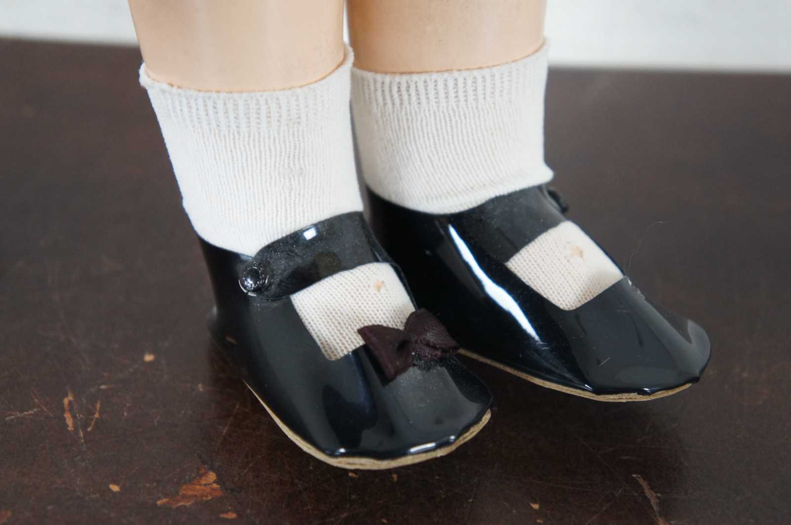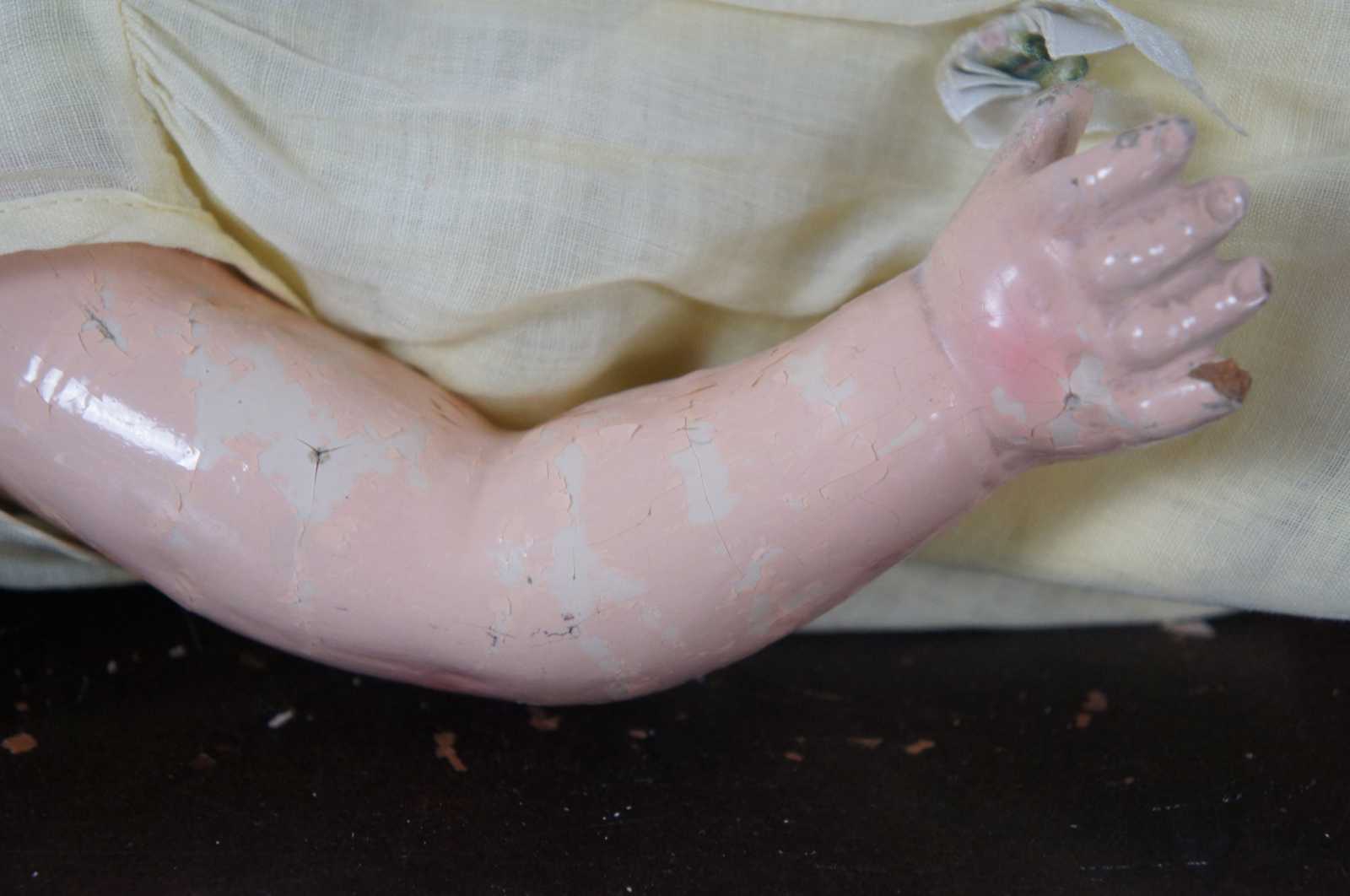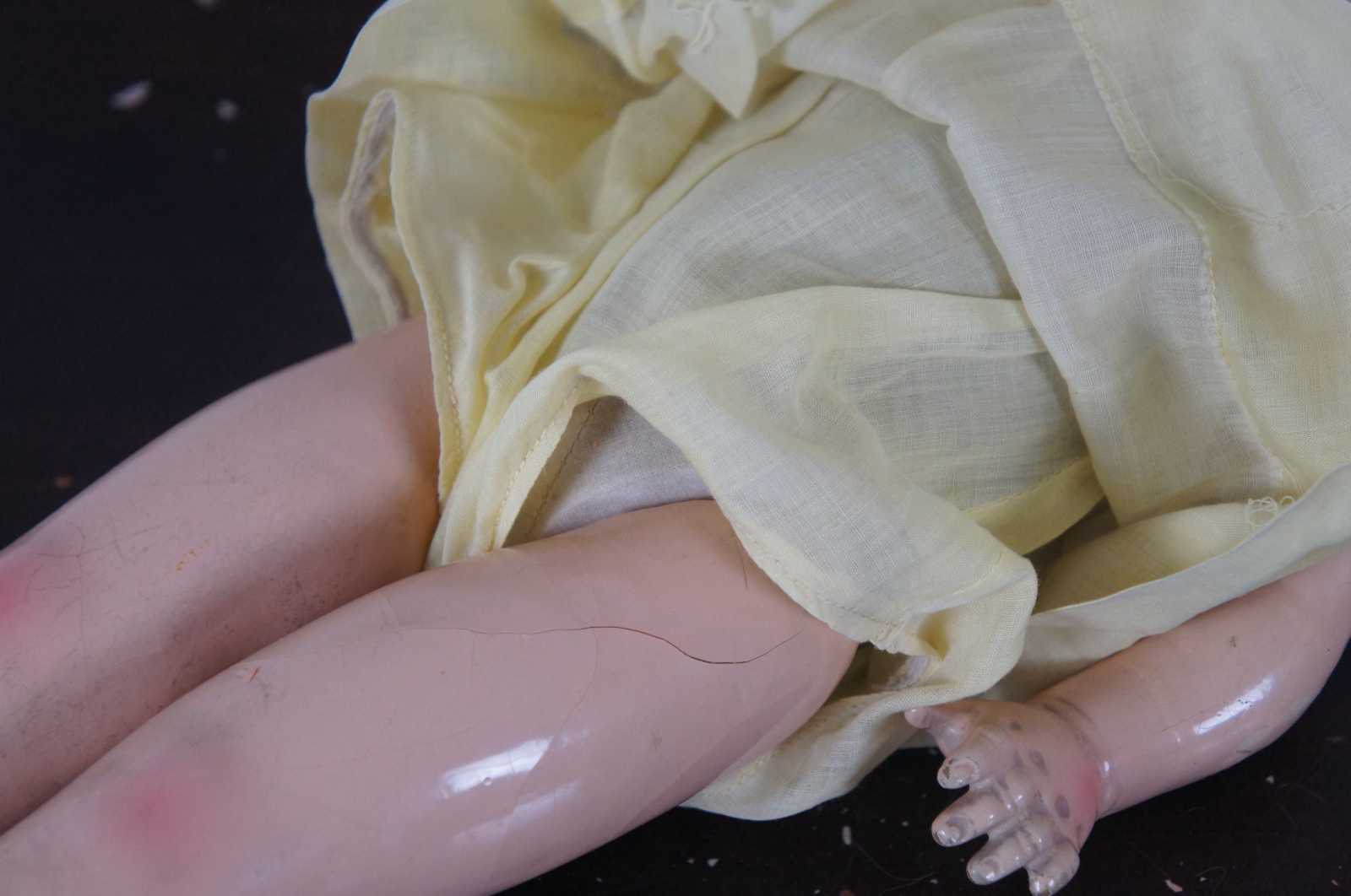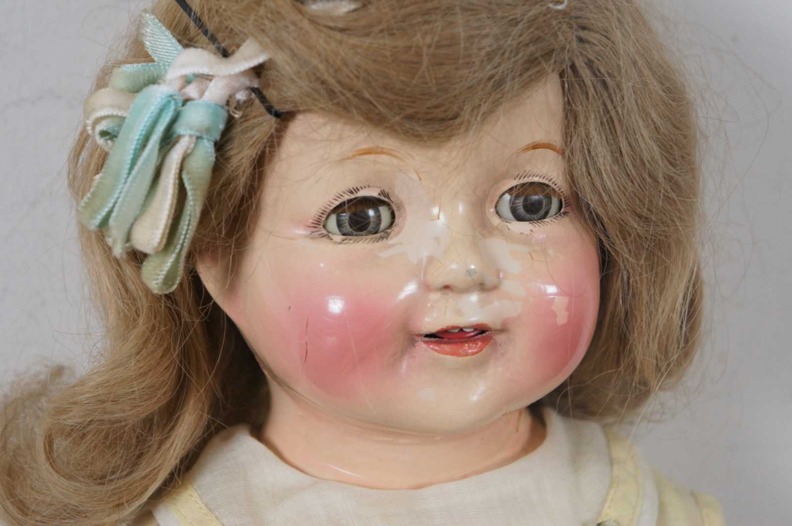 Antique early 20th century Petite American Character composition and cloth body doll with jointed limbs, light brown/dark blonde hair, and sleep eyes, dressed in a yellow dress with black shoes.