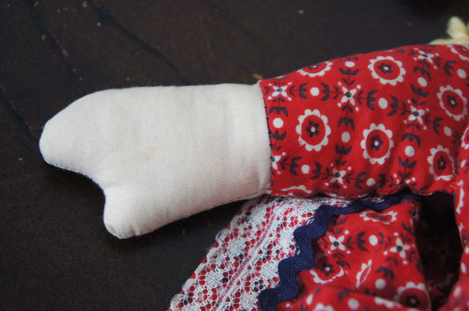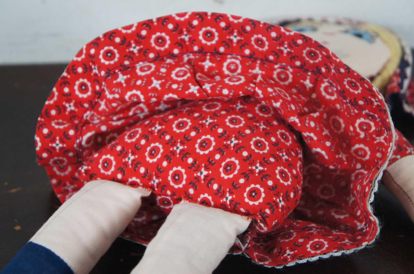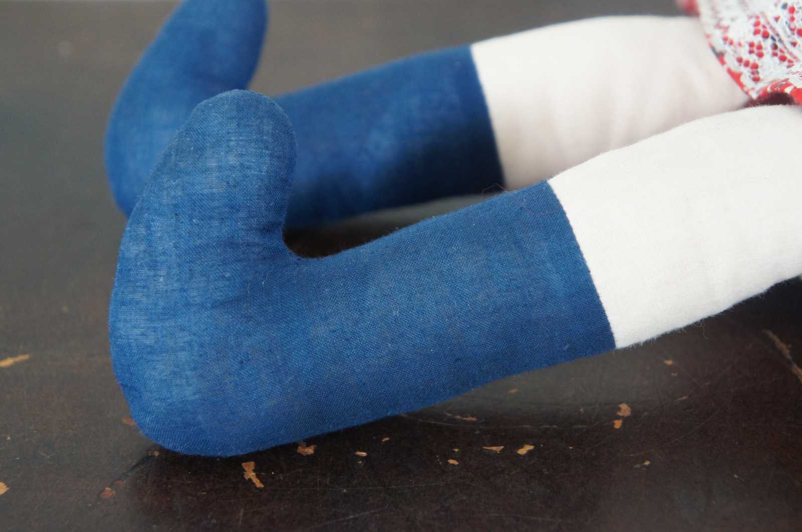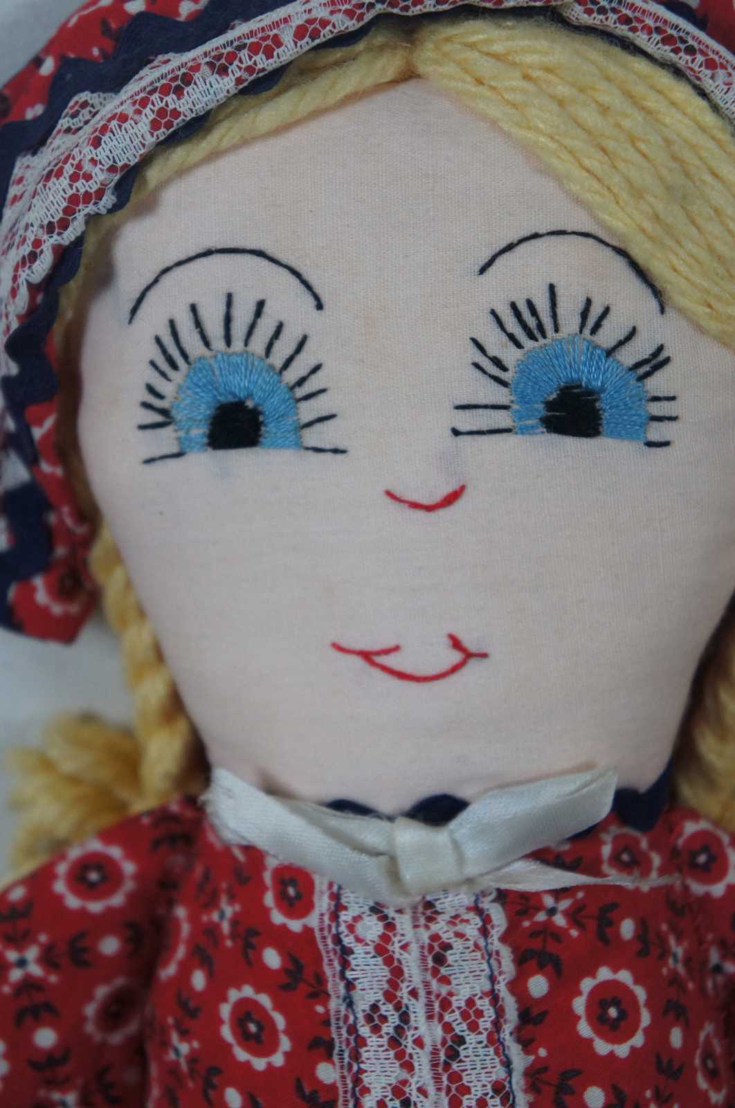 Vintage cloth doll in a Nordic style red and blue floral dress, blue shoes and bonnet over braided yarn hair and embroidered features.