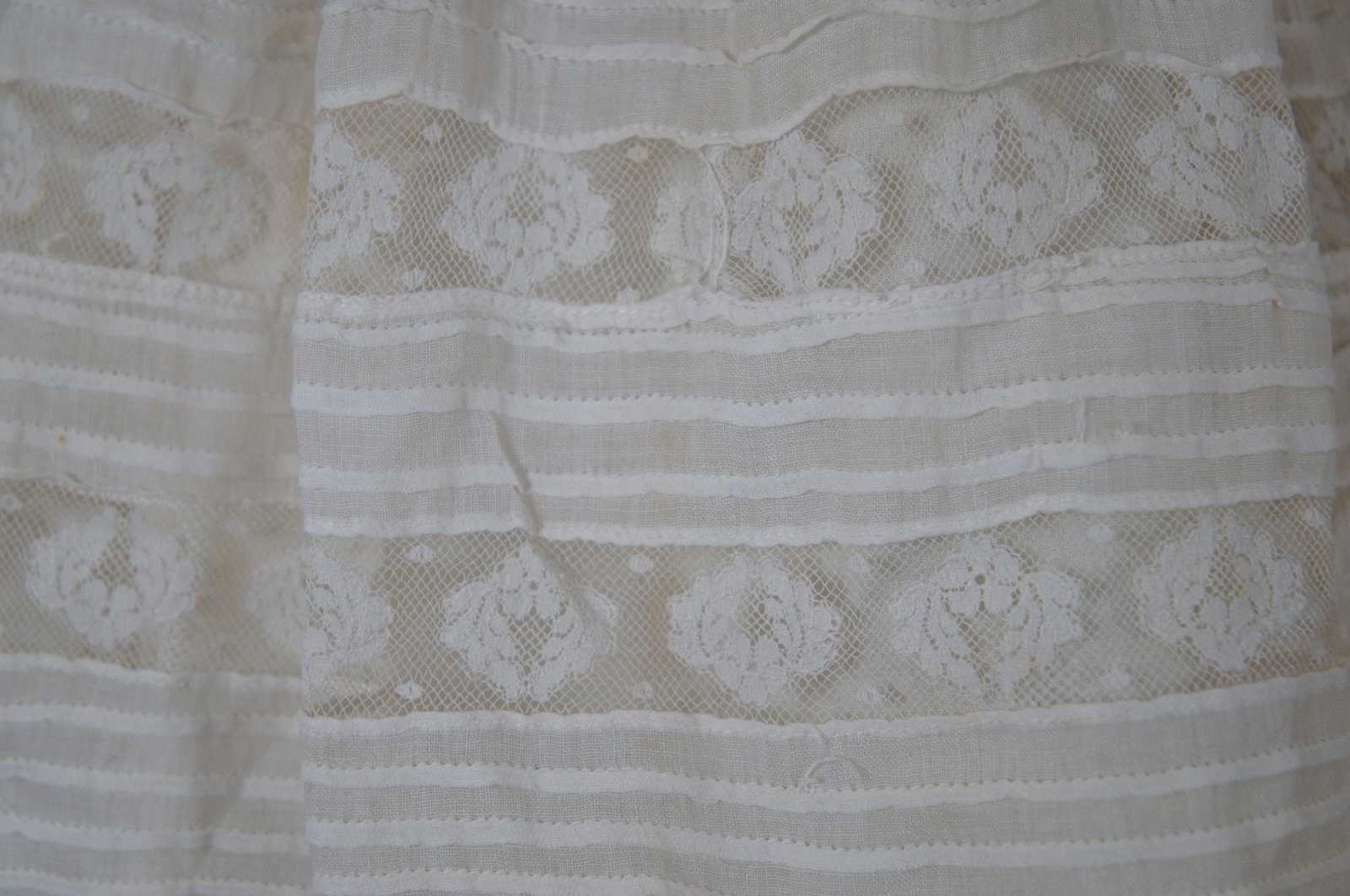Antique 19th century German Armand Marseille” doll with bisque head and hands, cloth body, brown hair, detached glass eyes, and dressed in a white dress and black shoes.