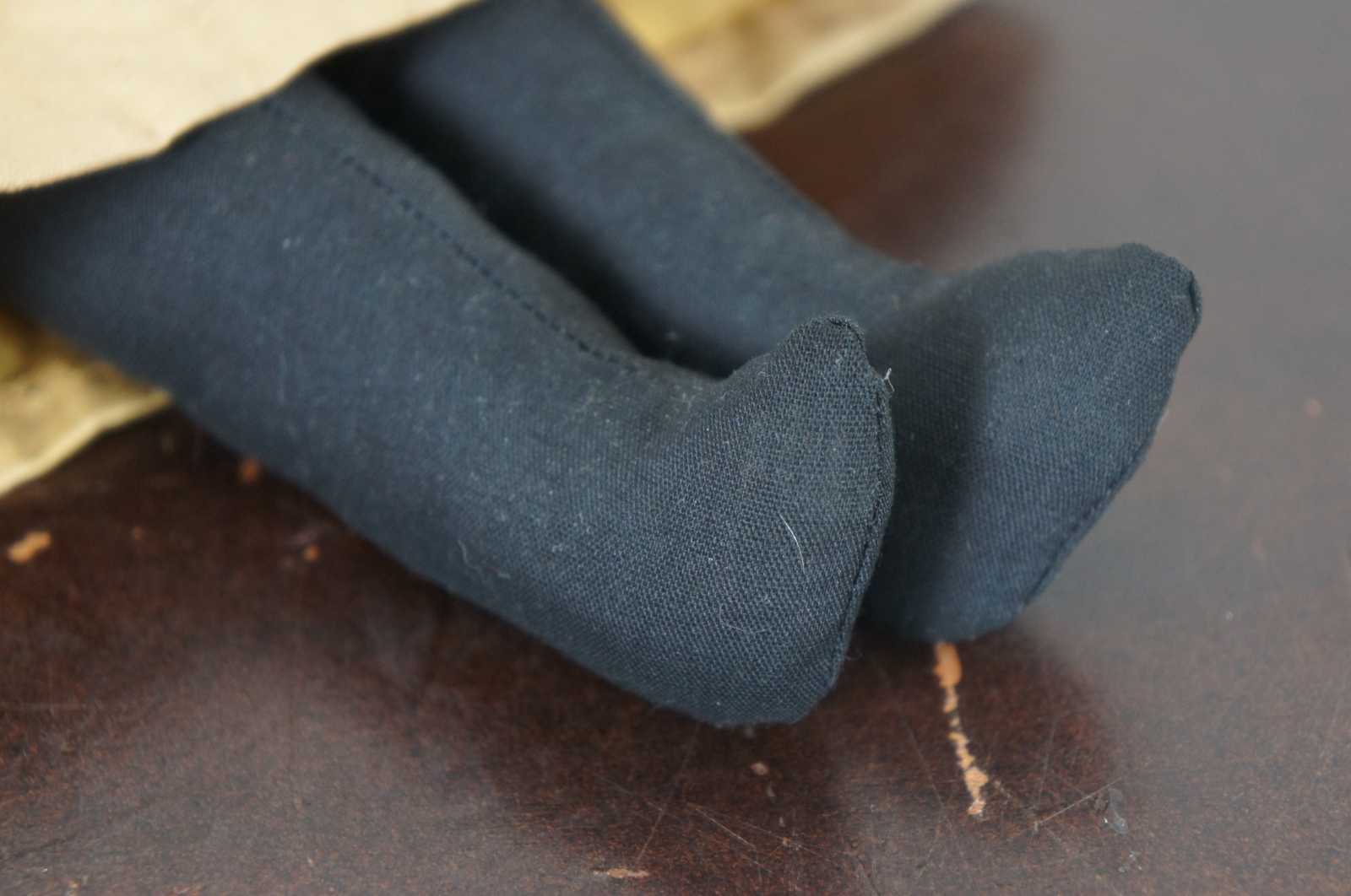 Unique folk art cloth doll dressed in red polka dot kerchief and re-purposed Yellow Kid tunic printed with the phrase “Say! Liz says I’m de sweetest ting dat ever happened.” “The Yellow Kid is an American comic strip character that appeared from 1895 to 1898 in Joseph Pulitzer's New York World, and later William Randolph Hearst's New York Journal. Created and drawn by Richard F. Outcault in the comic strip Hogan's Alley (and later under other names as well), it was one of the first Sunday supplement comic strips in an American newspaper, although its graphical layout had already been thoroughly established in political and other, purely-for-entertainment cartoons.[1] Outcault's use of word balloons in the Yellow Kid influenced the basic appearance and use of balloons in subsequent newspaper comic strips and comic books.”