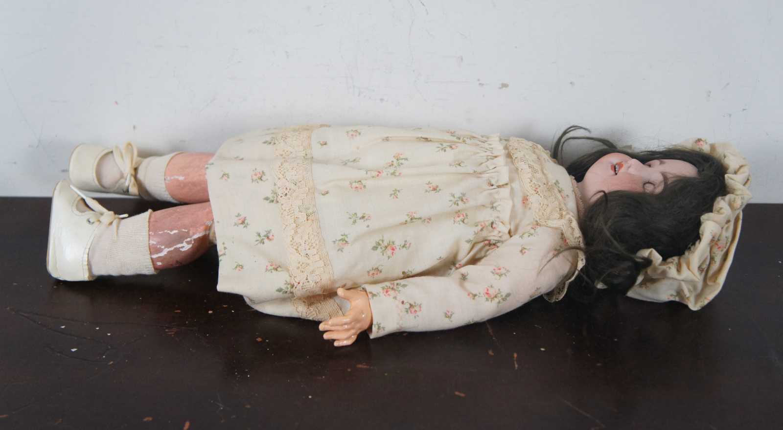 Antique 19th century SFBJ 60 Paris 2 French bisque doll with sleep eyes, brown hair, and articulated jointed limbs, dressed in floral dress and bonnet with leather shoes.
