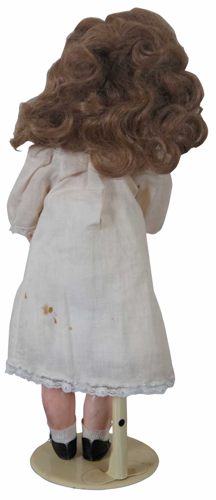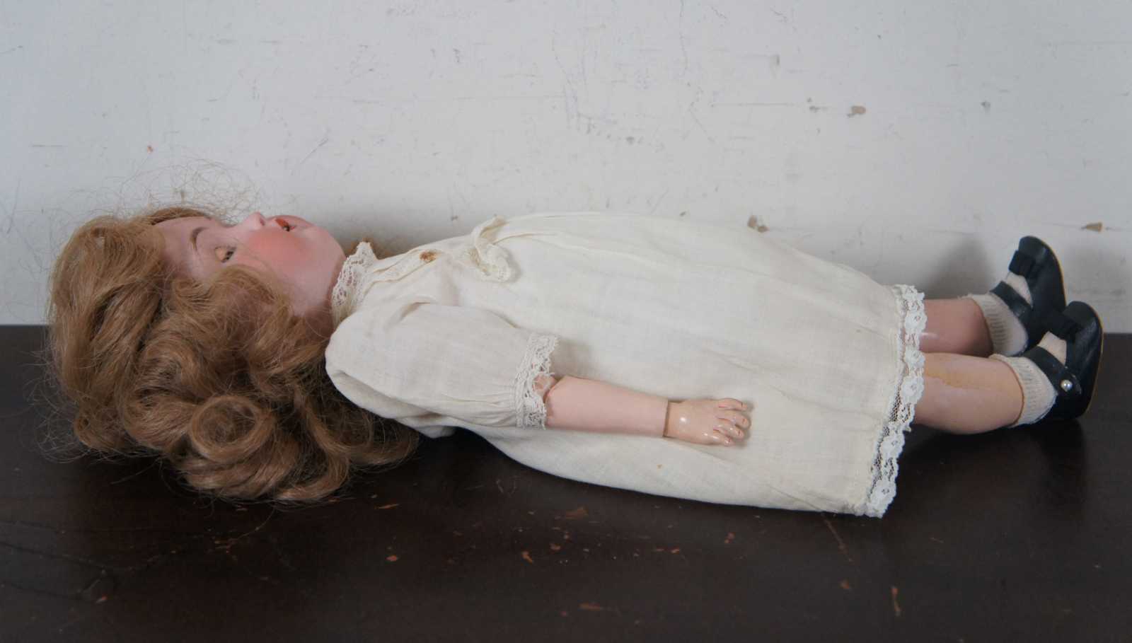 Antique German 171 bisque head doll with composition articulated jointed body, sleep eyes, light brown/dark blonde hair, dressed in a white dress with black shoes.