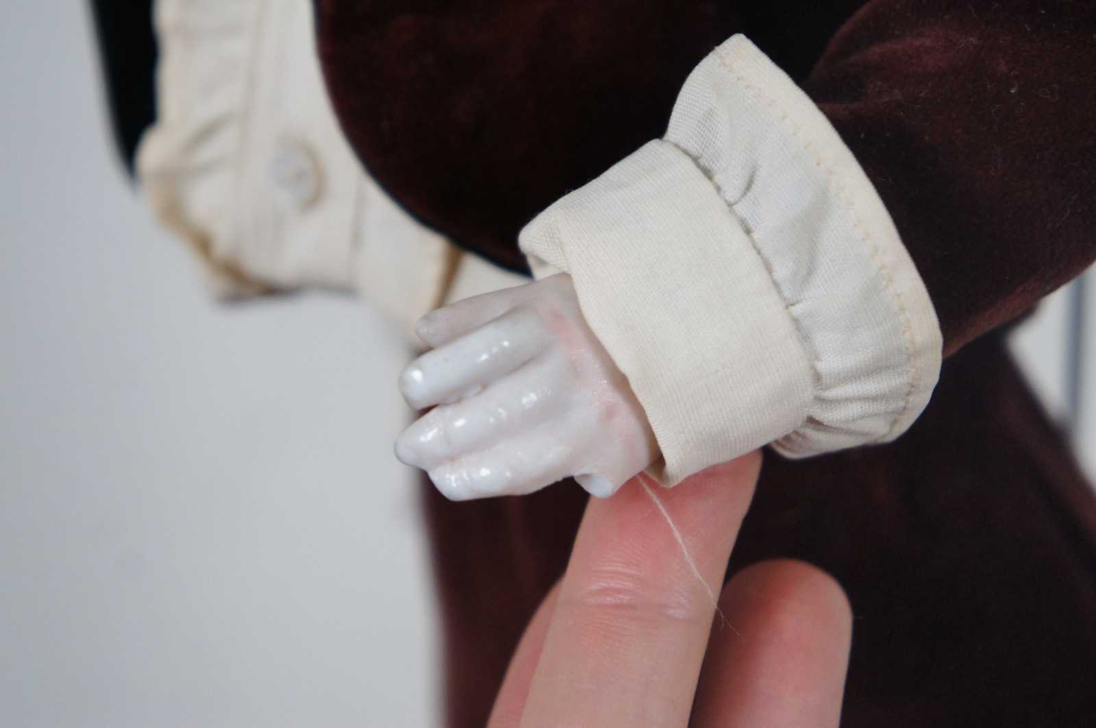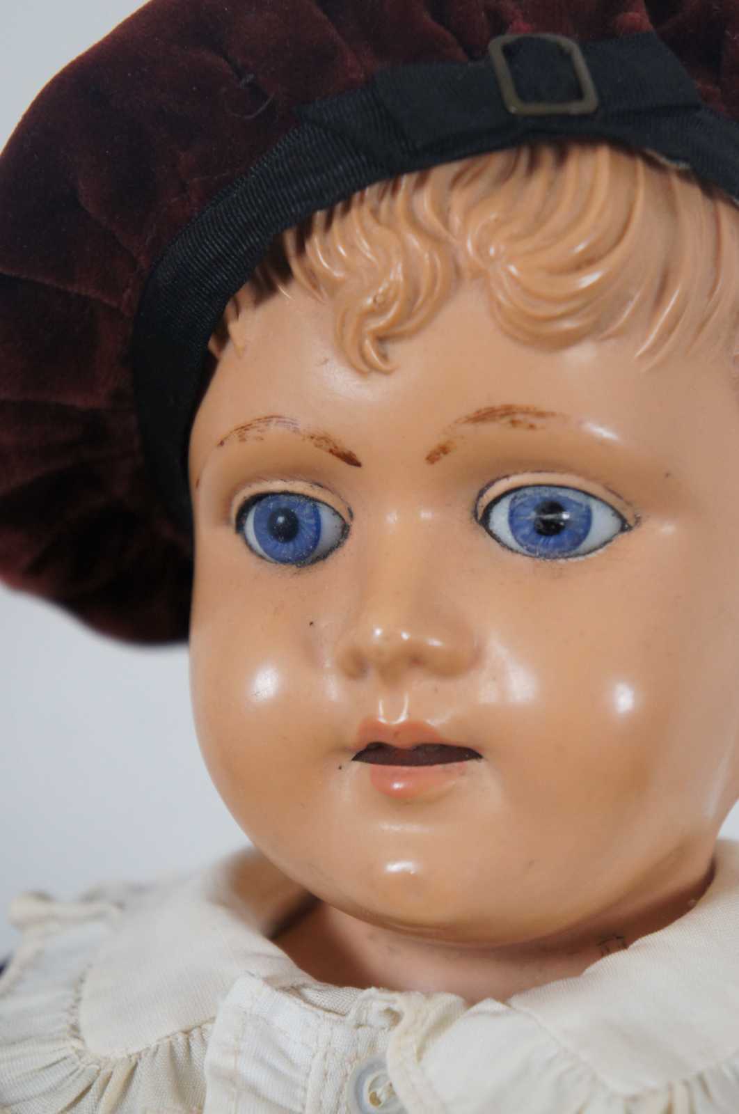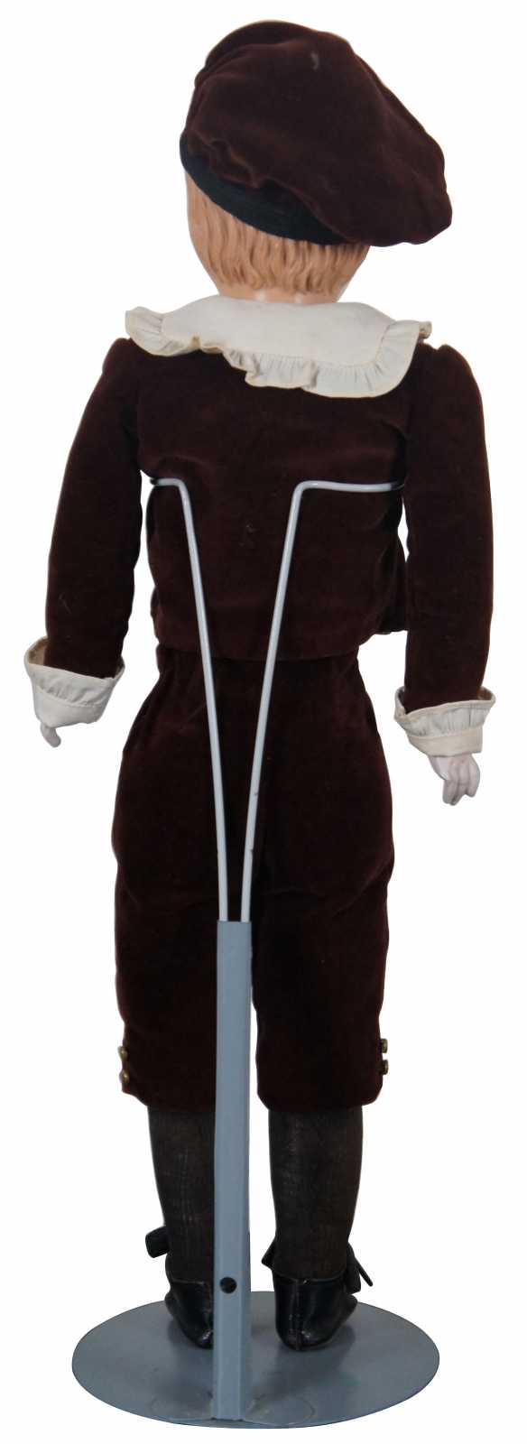 Circa 1903 antique doll by Schutz-Marke Germany with celluloid head and jointed leather body, composite hands and dressed in a burgundy leather suit and Scotch bonnet. “In 1889, a German company had found a way to improve celluloid so it could be used for toys. The required machinery was developed, and soon Schildkröt dolls with the turtle trademark were sent out into the shops. The company was the 'Rheinische Gummi- und Celluloidwarenfabrik' (Rhenish Rubber and Celluloid Works), founded in 1873, but before long it was better known as Schildkrötwerke (Turtle Works)-Schildkröt, of course, meaning turtle in German. Between 1900 and 1910, 'SKoR' was gradually replaced by 'SkiR' (Schildkröte in Raute, or rhombus). The sequence of words now read 'Schutz-Marke / Germany.' The so-called old sign shows a noticeably slender turtle whose feet are curiously oriented to the front, making it look more like a salamander. In 1930, the trademark was changed again, for the last time. The turtle was drawn more compactly, with a rounded shell like a semicircle, and the rhombus fit snugly around it. In 1903, Schildkröt offered the first celluloid socket heads with sleeping eyes. The heads were mounted on jointed bodies of wood, leather, or composition, and these dolls became very desirable worldwide, especially in North America and England.”