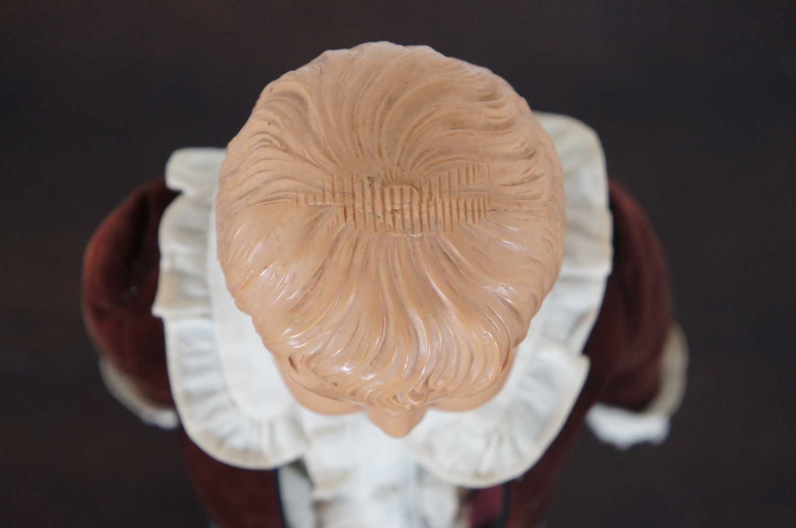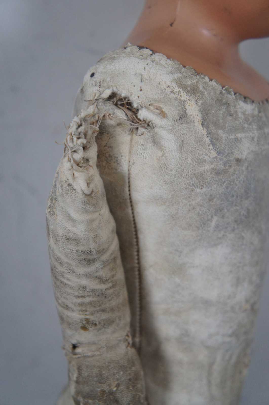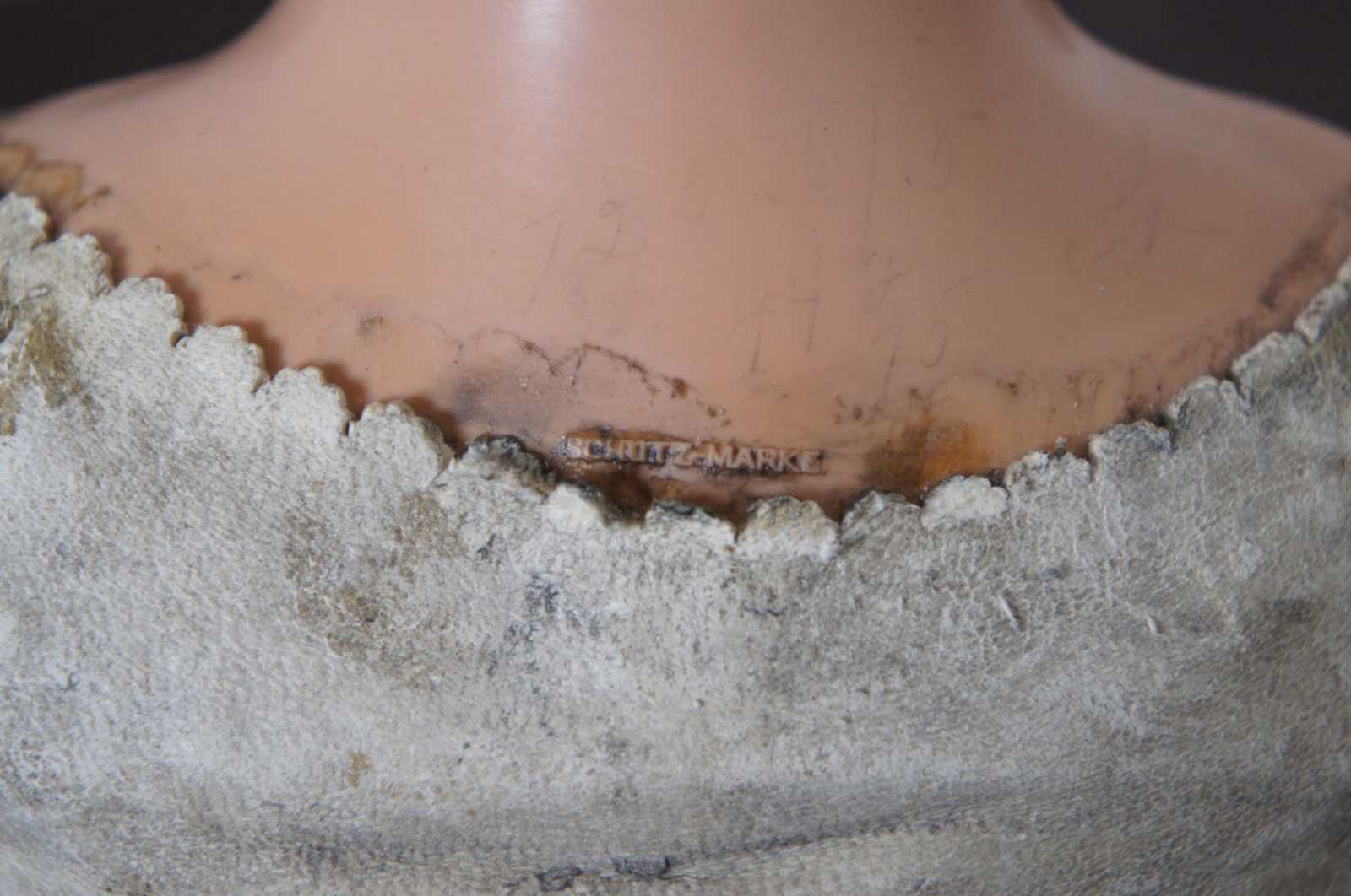Circa 1903 antique doll by Schutz-Marke Germany with celluloid head and jointed leather body, composite hands and dressed in a burgundy leather suit and Scotch bonnet. “In 1889, a German company had found a way to improve celluloid so it could be used for toys. The required machinery was developed, and soon Schildkröt dolls with the turtle trademark were sent out into the shops. The company was the 'Rheinische Gummi- und Celluloidwarenfabrik' (Rhenish Rubber and Celluloid Works), founded in 1873, but before long it was better known as Schildkrötwerke (Turtle Works)-Schildkröt, of course, meaning turtle in German. Between 1900 and 1910, 'SKoR' was gradually replaced by 'SkiR' (Schildkröte in Raute, or rhombus). The sequence of words now read 'Schutz-Marke / Germany.' The so-called old sign shows a noticeably slender turtle whose feet are curiously oriented to the front, making it look more like a salamander. In 1930, the trademark was changed again, for the last time. The turtle was drawn more compactly, with a rounded shell like a semicircle, and the rhombus fit snugly around it. In 1903, Schildkröt offered the first celluloid socket heads with sleeping eyes. The heads were mounted on jointed bodies of wood, leather, or composition, and these dolls became very desirable worldwide, especially in North America and England.”