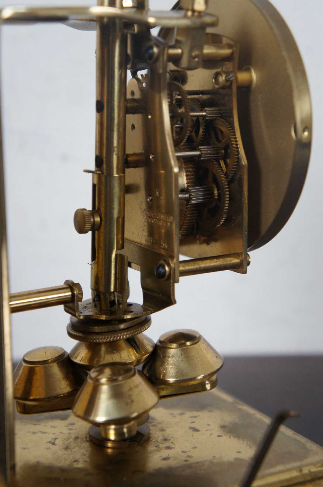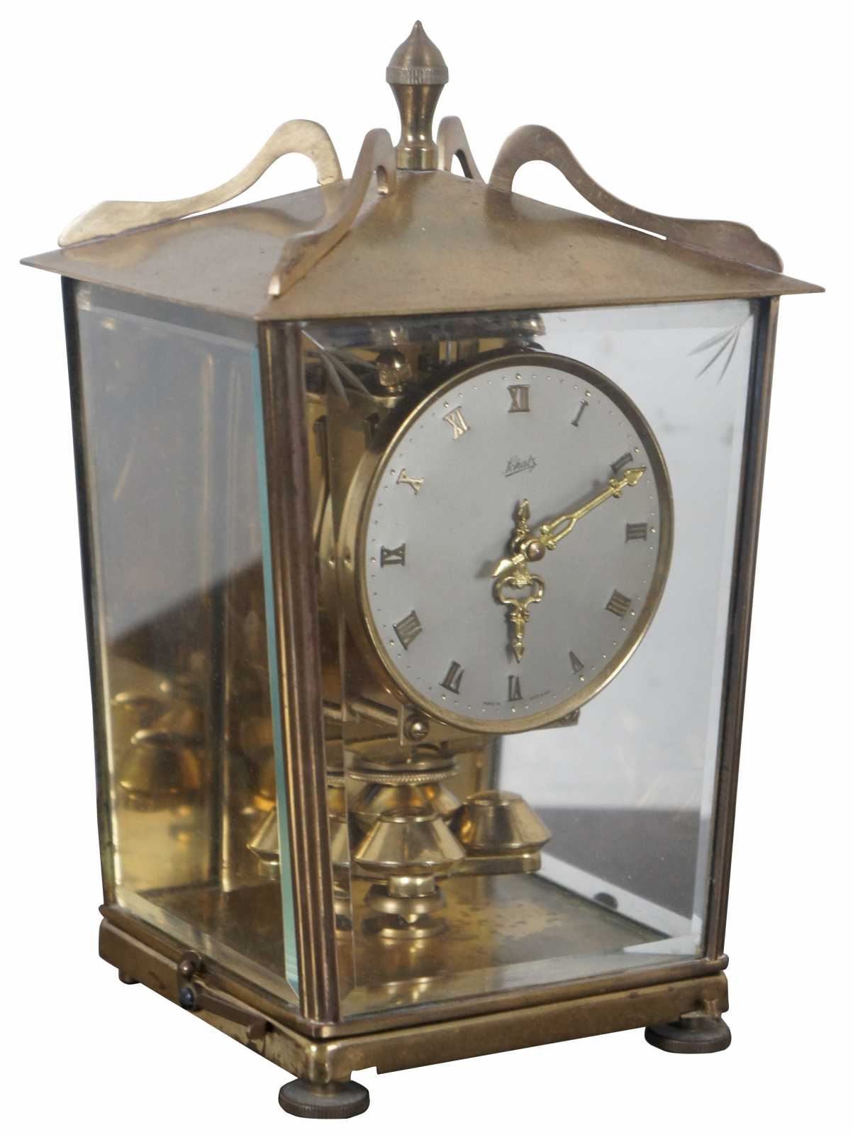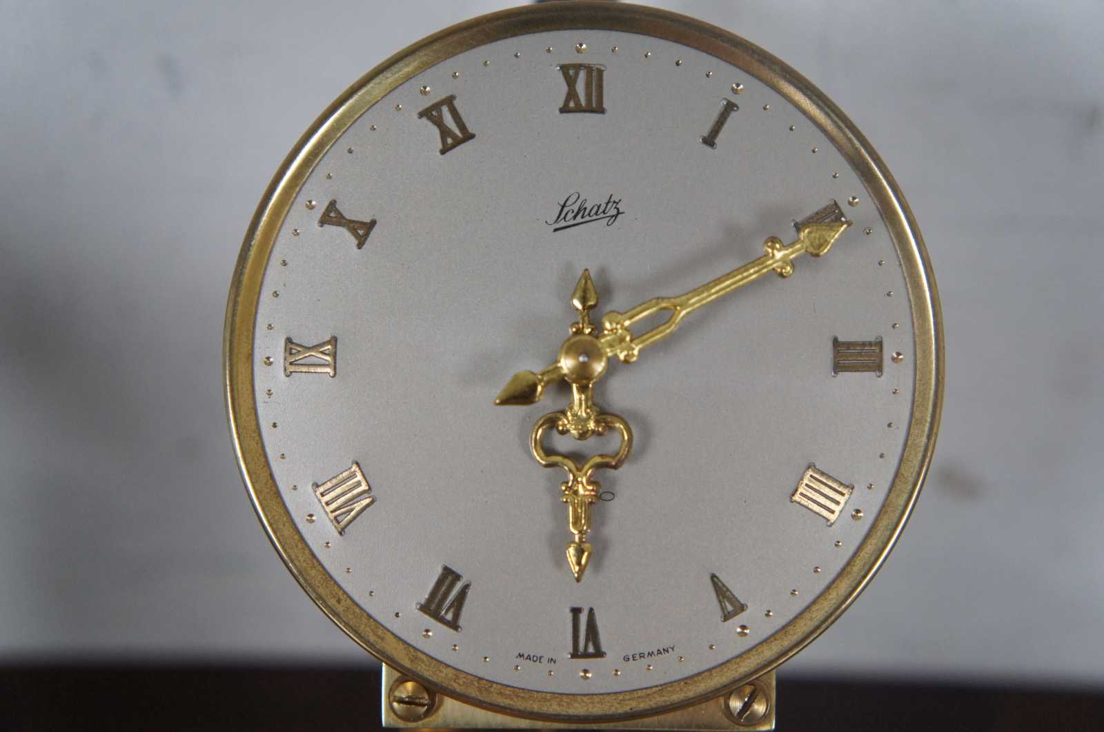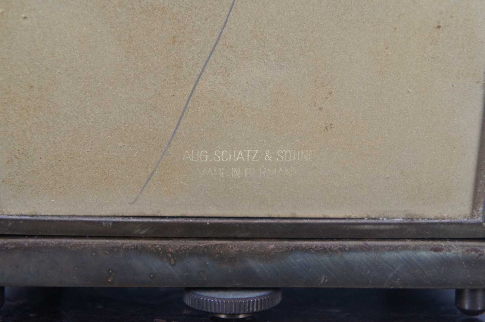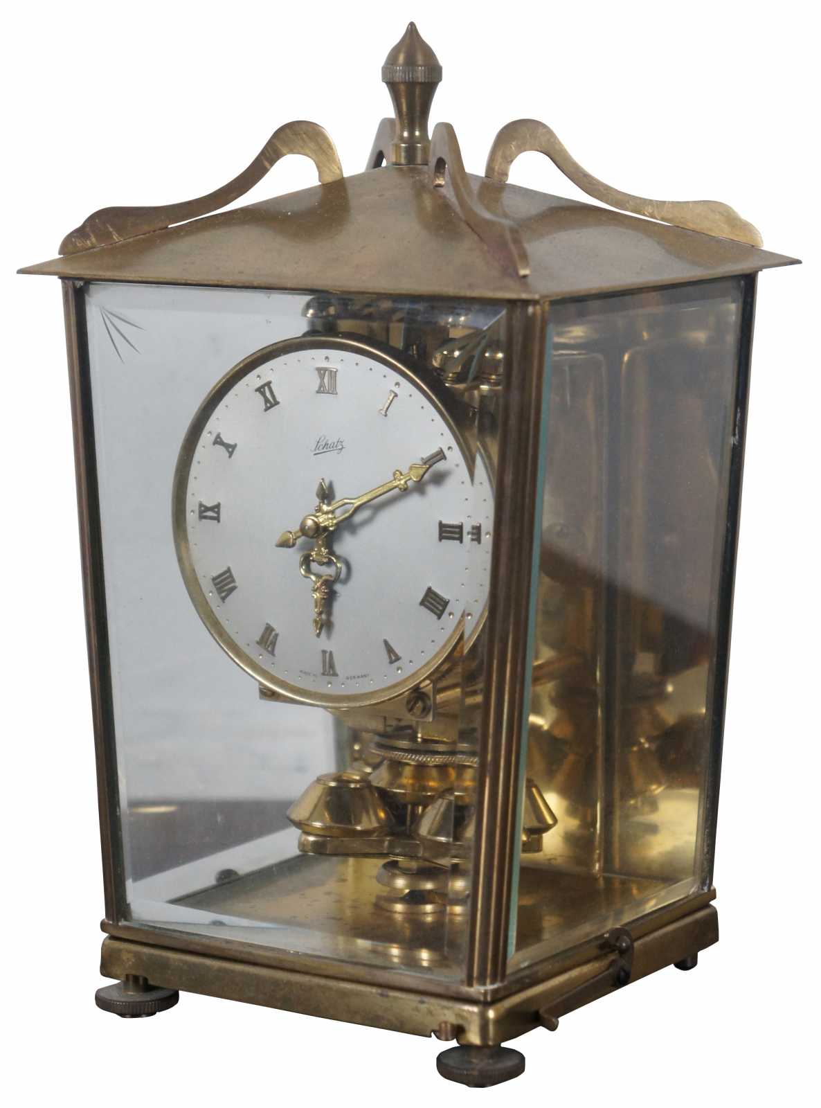 Antique Schtaz & Sohne 400 day anniversary mantel clock in brass and glass case. Includes key. “The company known as Schatz was first known as Jahresuhrenfabrik. The company was founded by August Schatz in the mid-1850s in the Black Forest region of Triburg, Germany. It was registered in 1881 as Schatz & Wintermantel, and was re-structured in 1884 as Jahresuhrenfabrik A.G. It was registered again in1897 as Jahresuhrenfabrik GmbH, and finally in 1923 as Jahresuhrenfabrik August Schatz & Sohne. They produced cuckoo clocks, barometers, and 400- day clocks. In later years, they produced electric clocks and battery- operated quartz clocks. The company struggled to compete in the early 1980s, and finally closed down in 1985.”