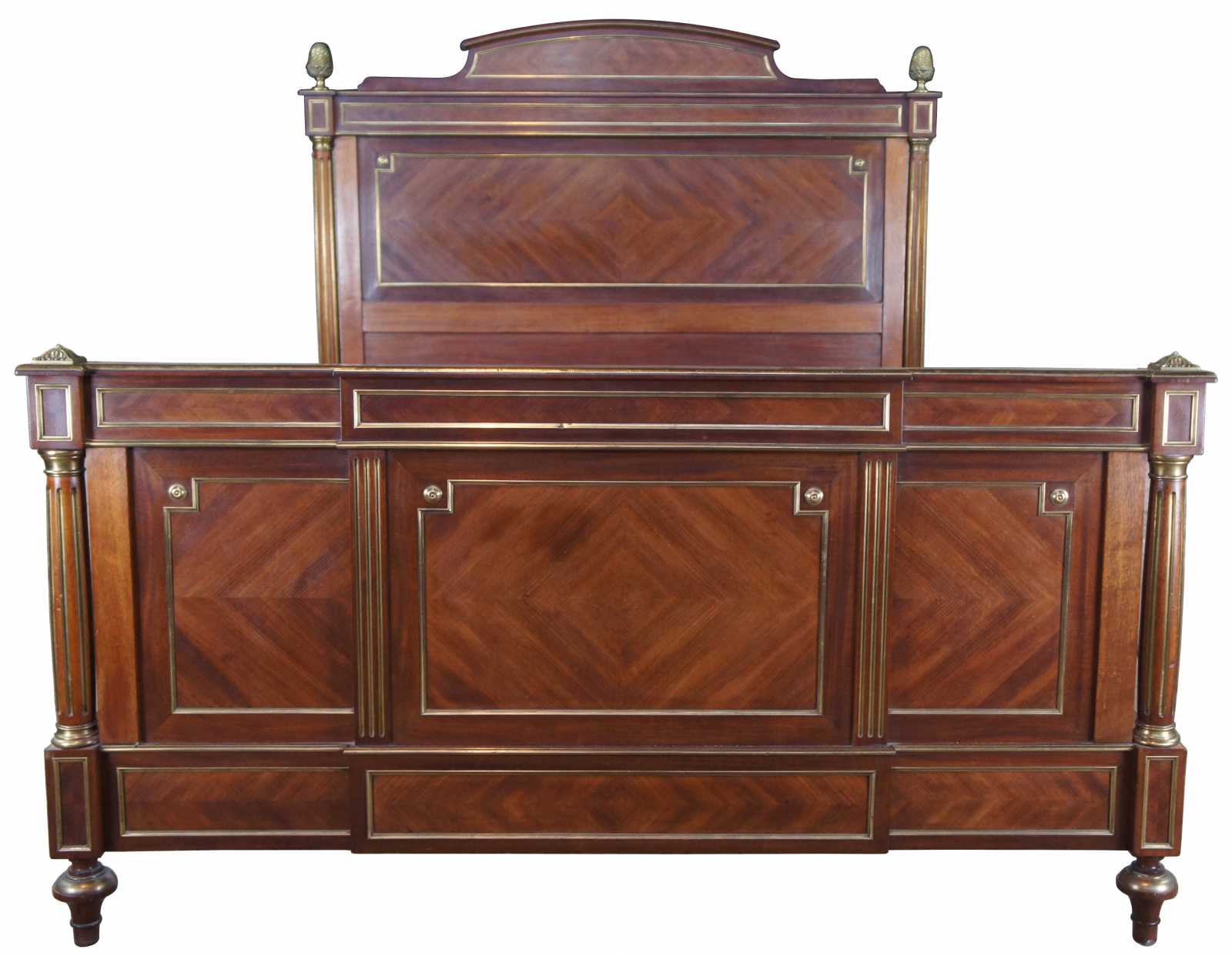 Antique 19th century French Empire bed. Made of mahogany with inalid brass and large arctichoke or pineapple shaped finials.