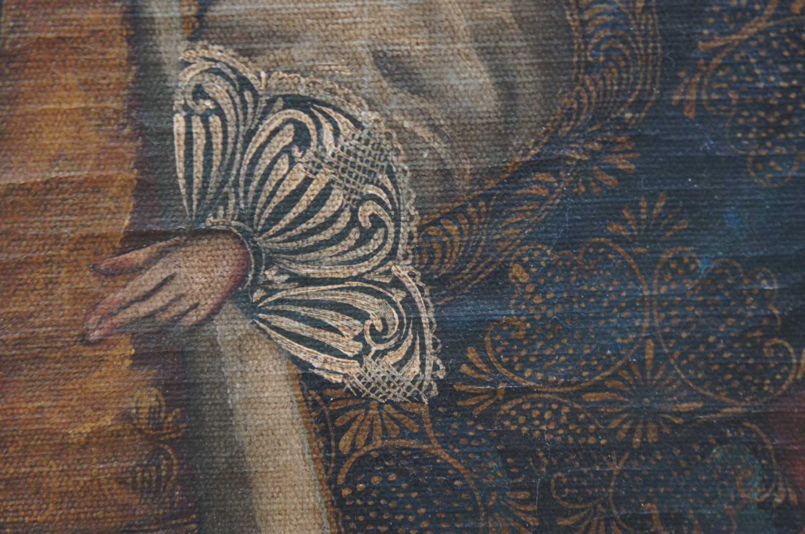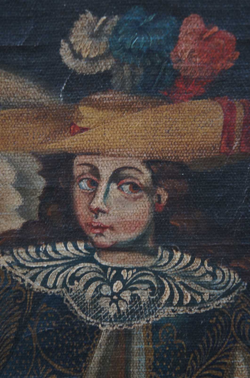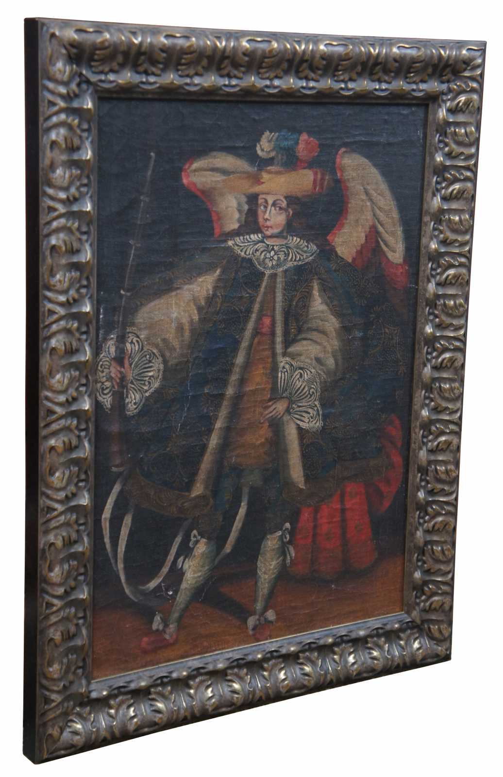 Antique Spanish Colonial or Peruvian portrait oil painting of Angel Arcabucero on canvas.