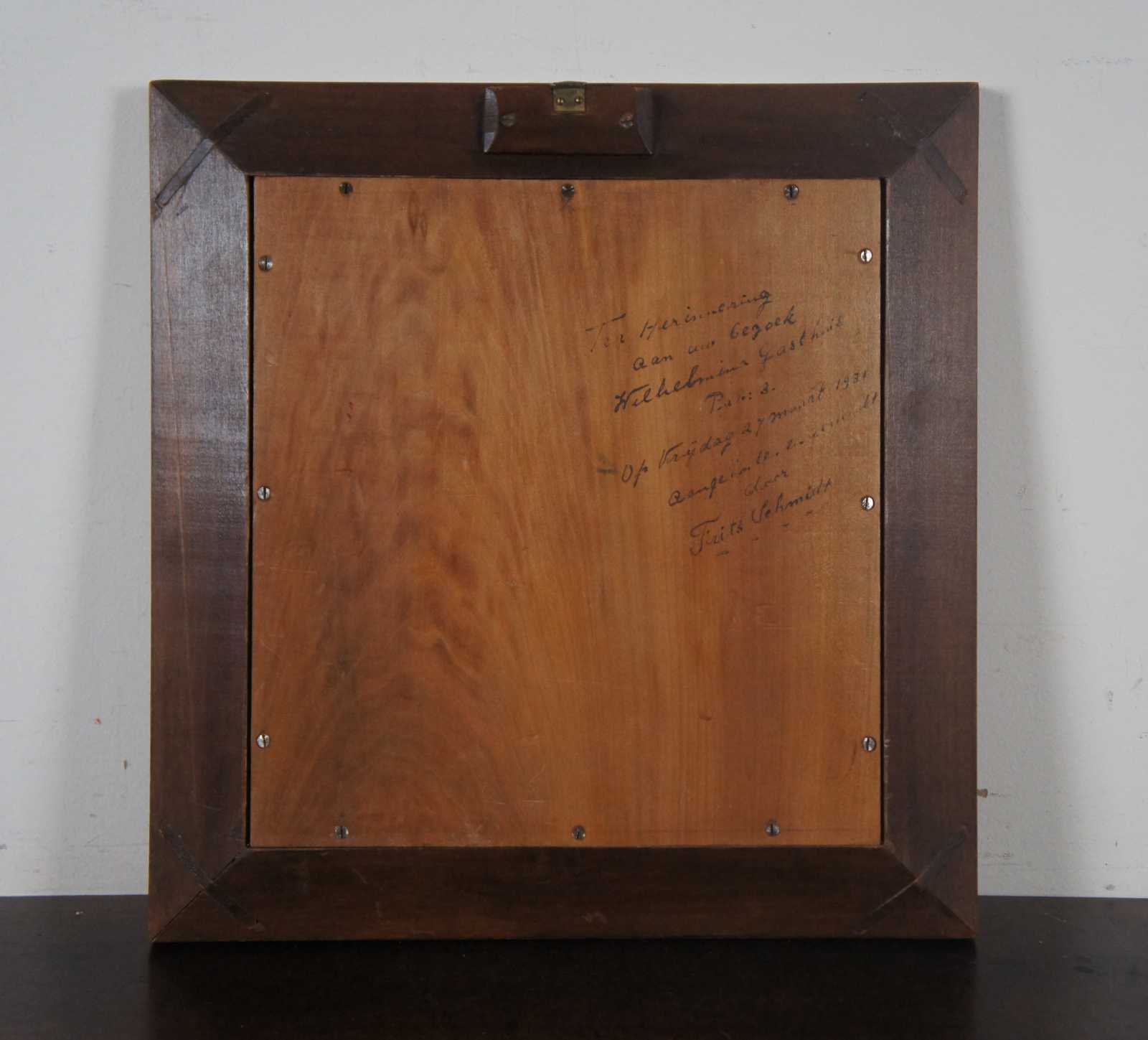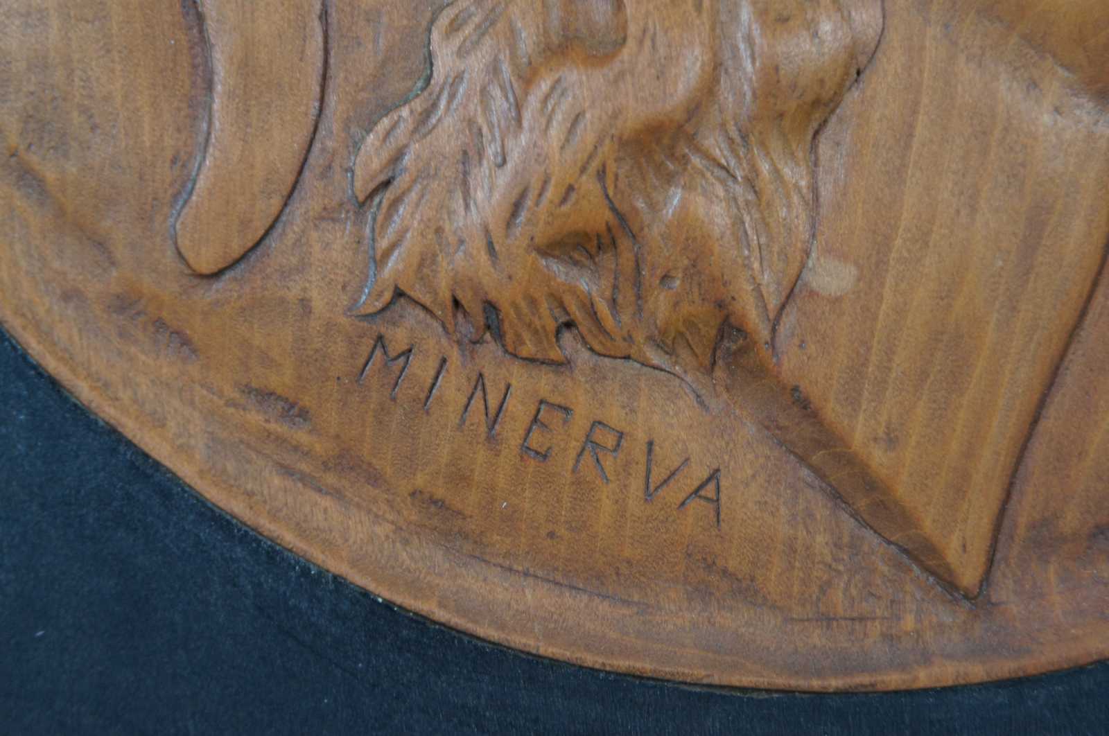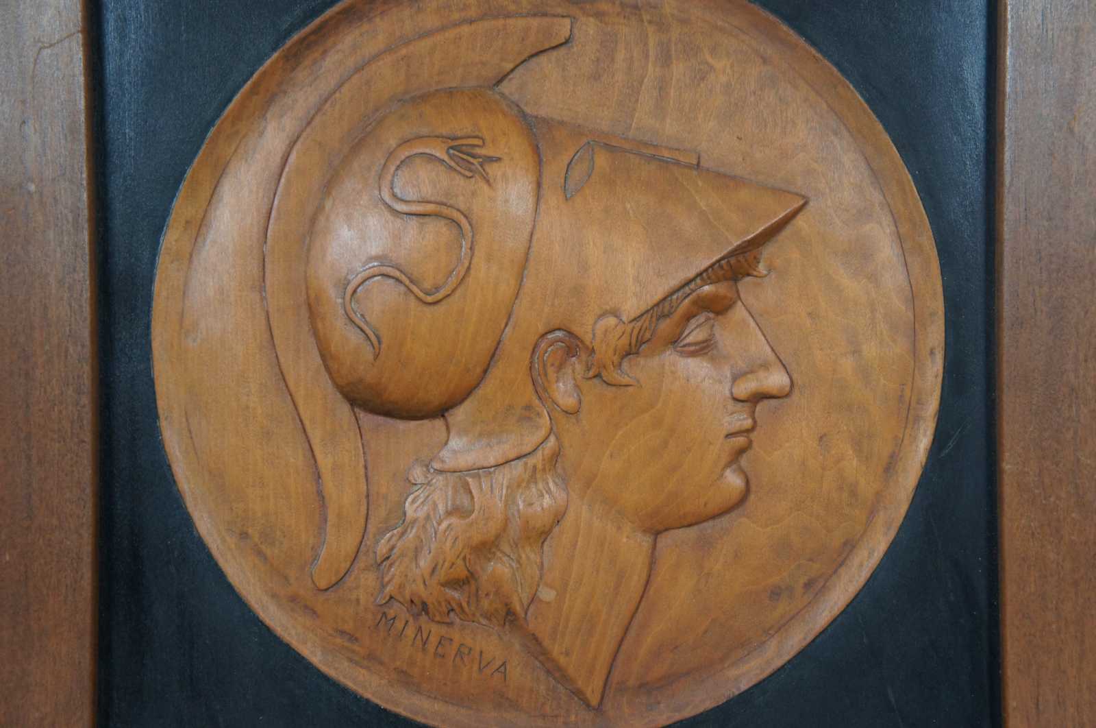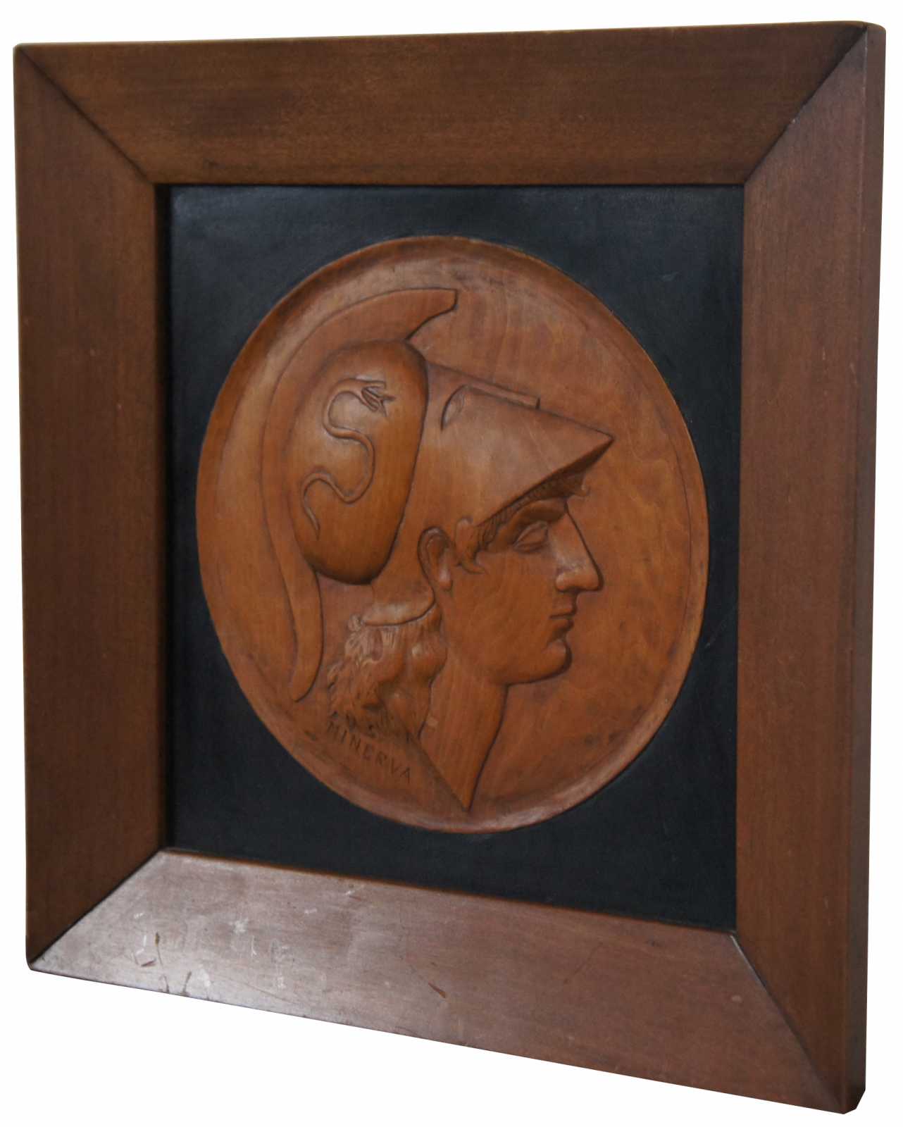 Antique 1931 hand carved wood medallion plaque showing the head of the Greek Goddess Minerva with her helmet decorated with a snake.