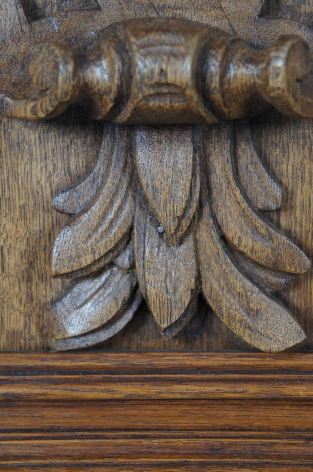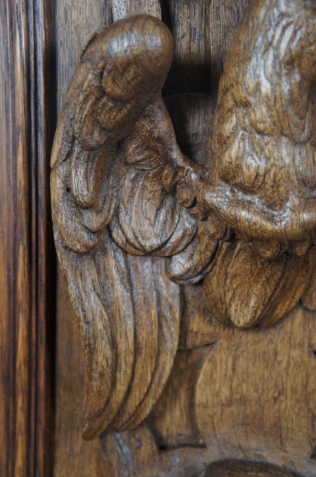 Antique carved oak plaque in beveled frame of an eagle in high relief.