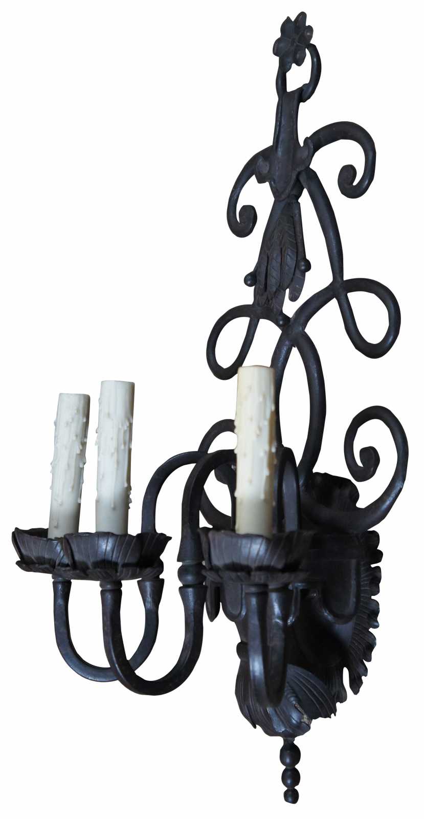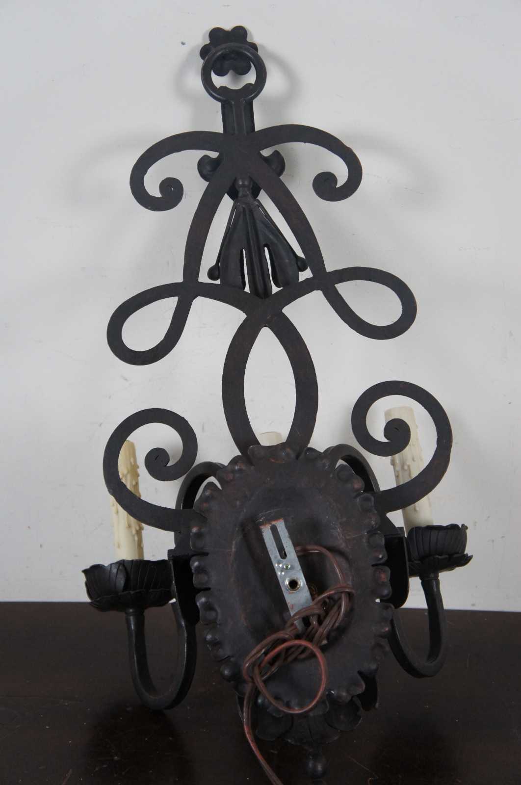 Vintage heavy iron Spanish Revival three arm candlestick wall sconce featuring ornate scrolled details.