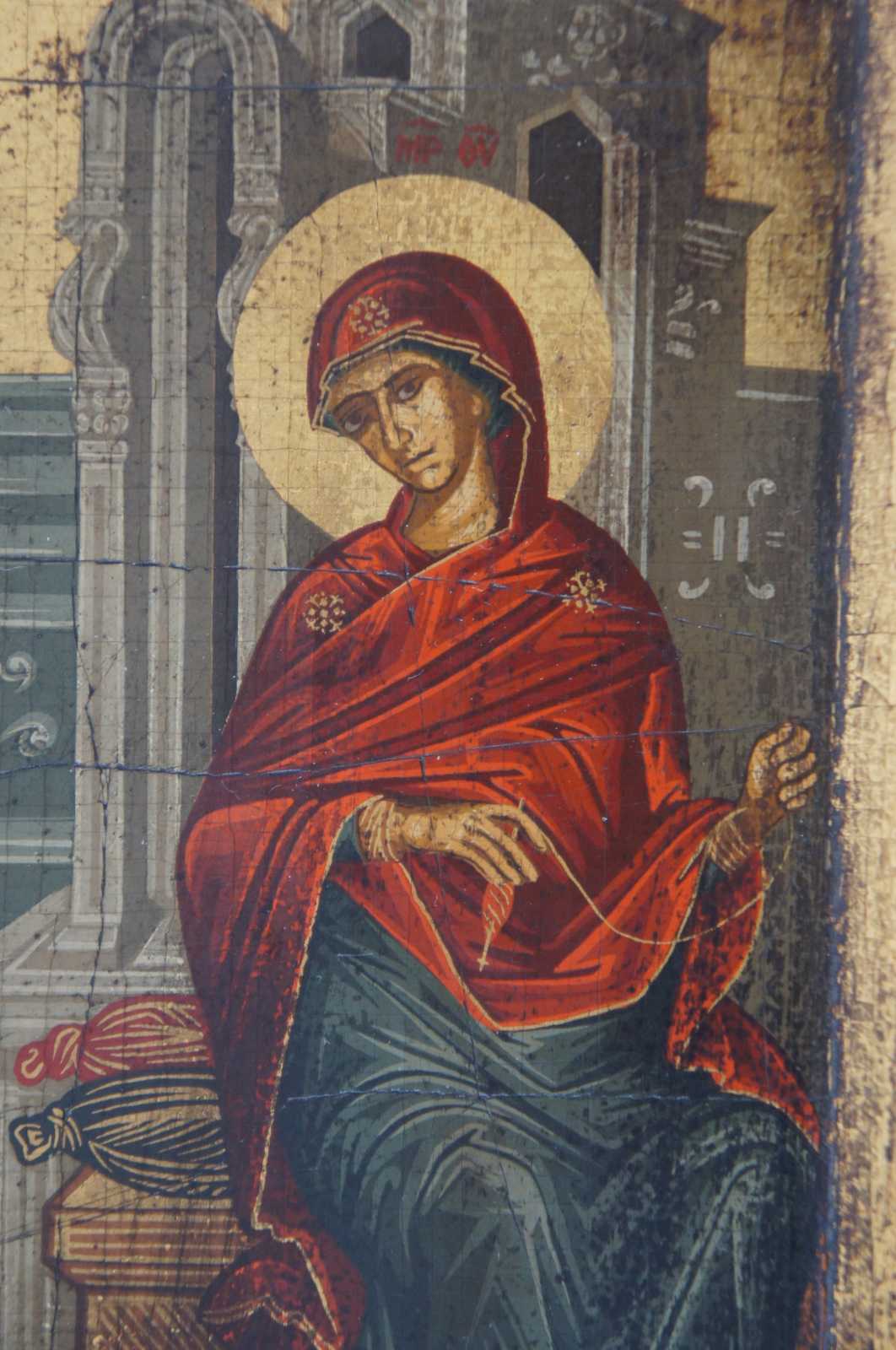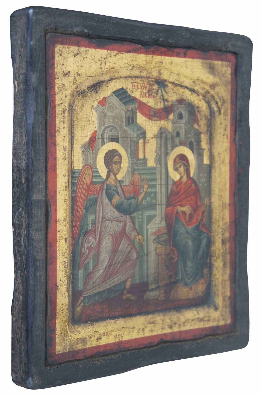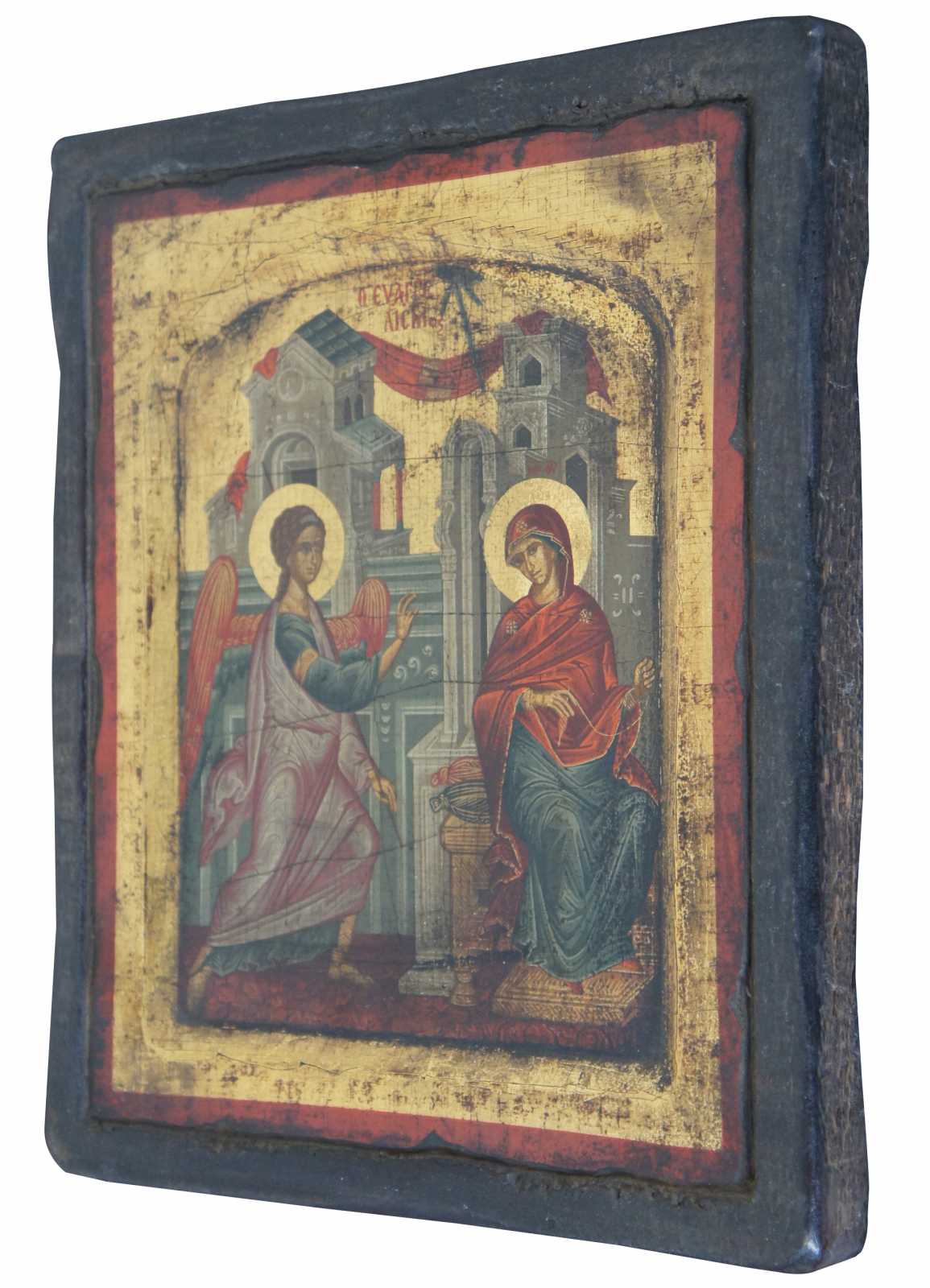 Vintage hand painted Greek Orthodox Byzantine icon on wood panel showing the Annunciation of the Archangel Gabriel to the Virgin Mary.