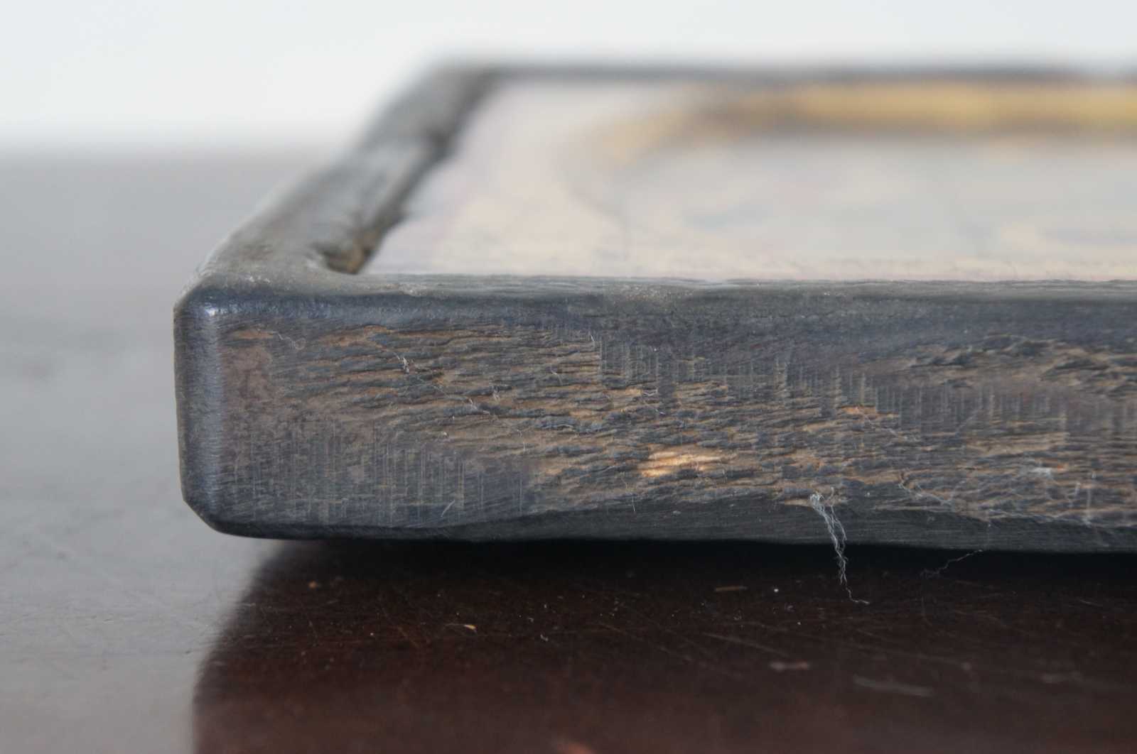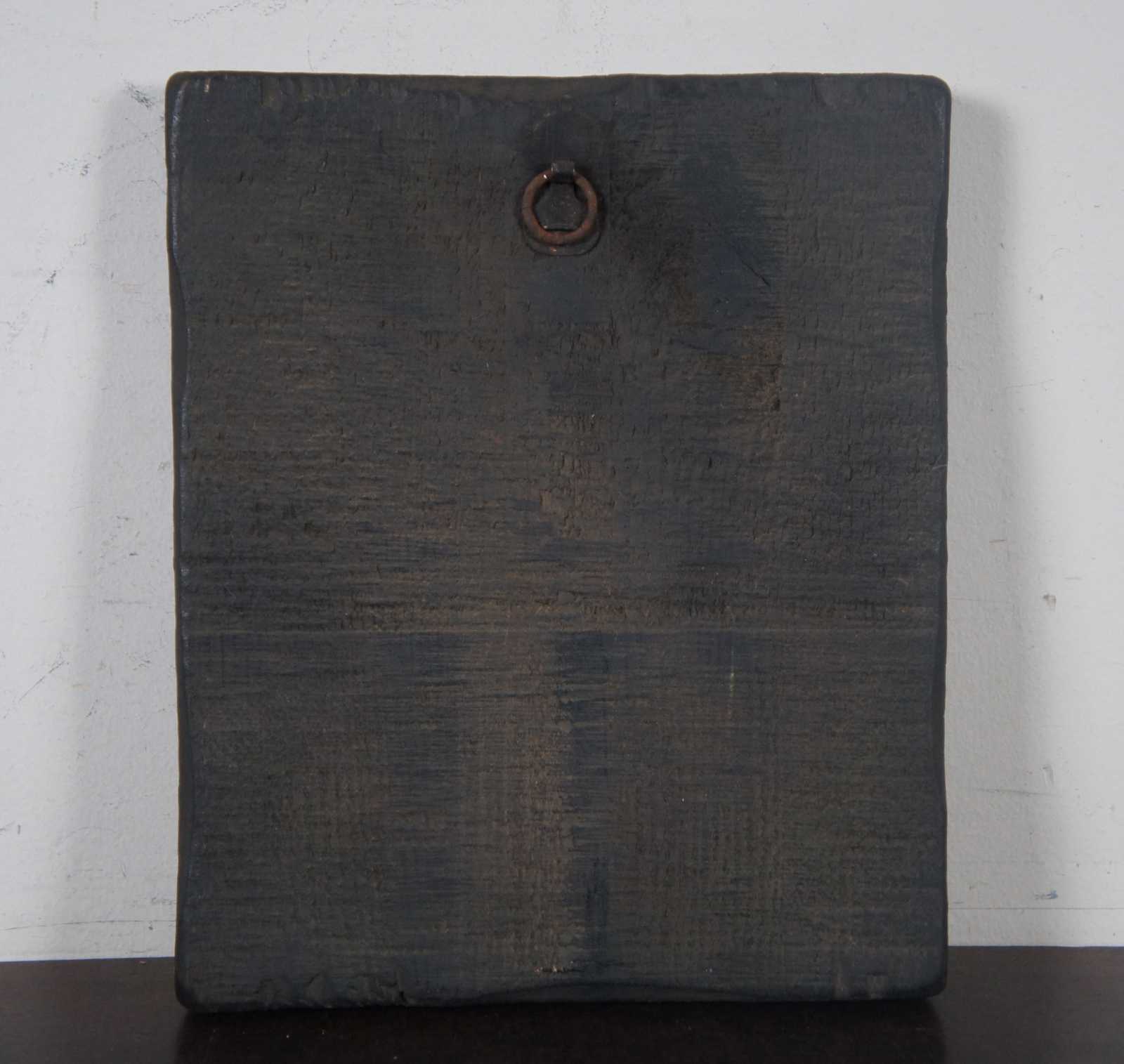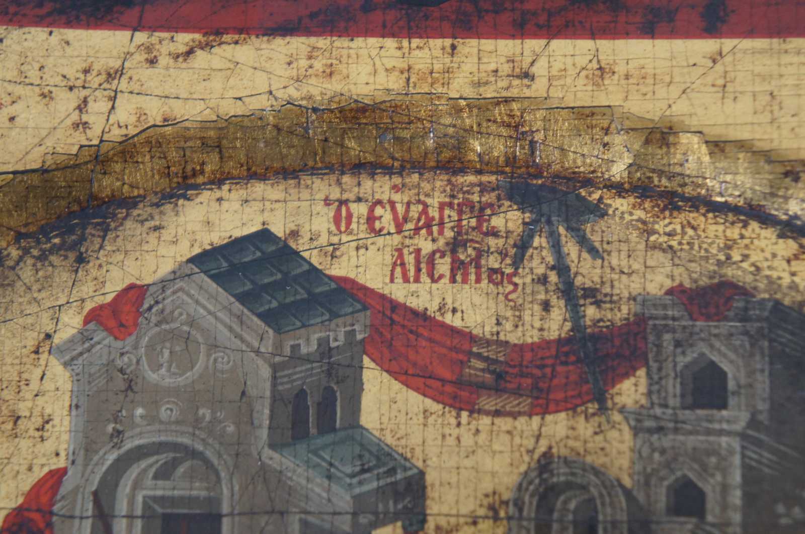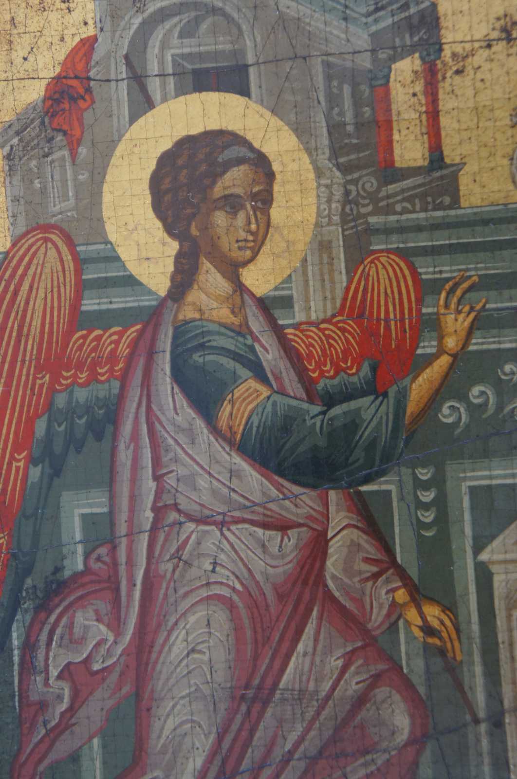 Vintage hand painted Greek Orthodox Byzantine icon on wood panel showing the Annunciation of the Archangel Gabriel to the Virgin Mary.