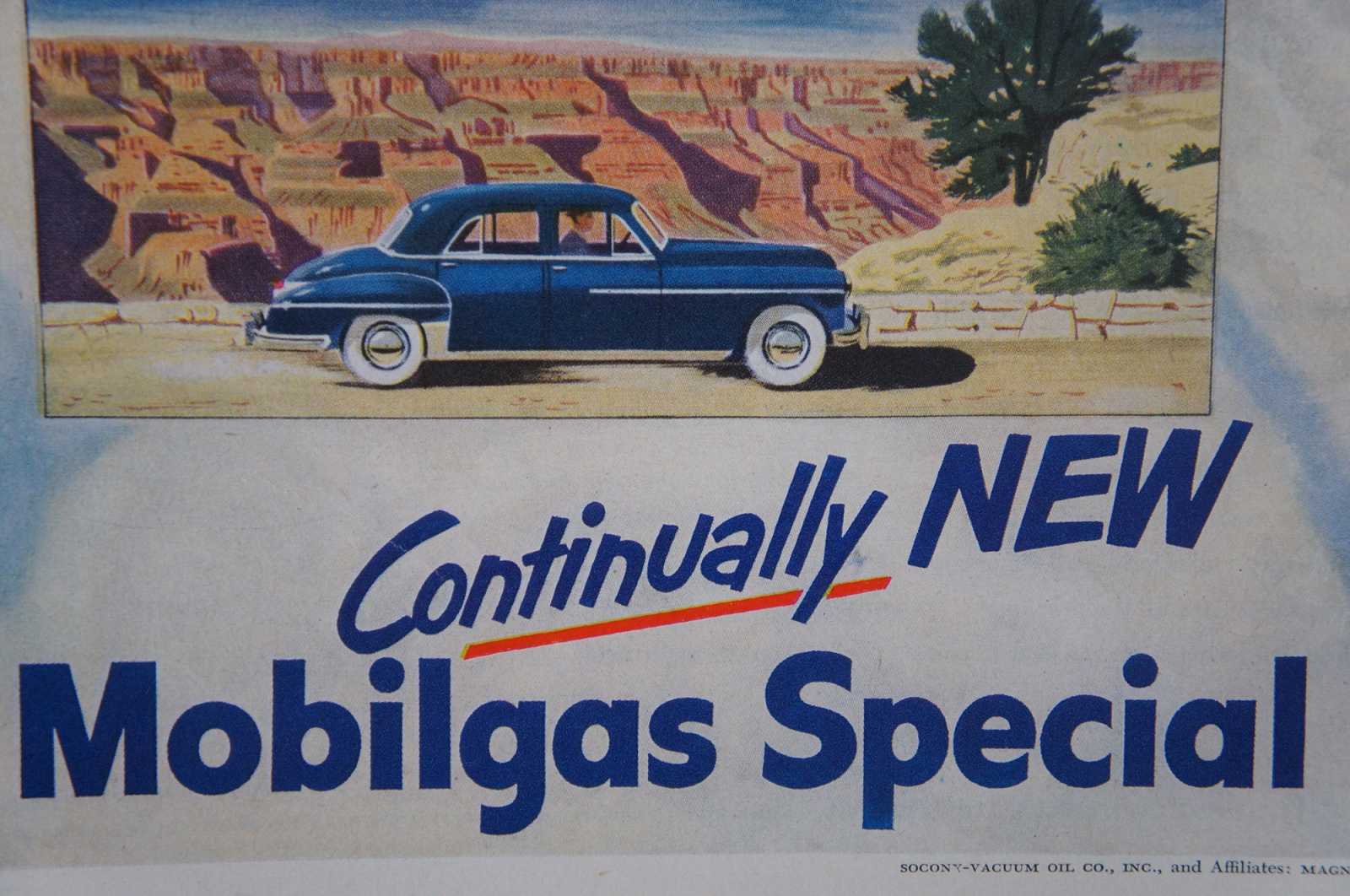 Vintage 1950 magazine page advertisement for Mobilgas featuring a red pegasus. Socony Vacuum Magnolia Petroleum.