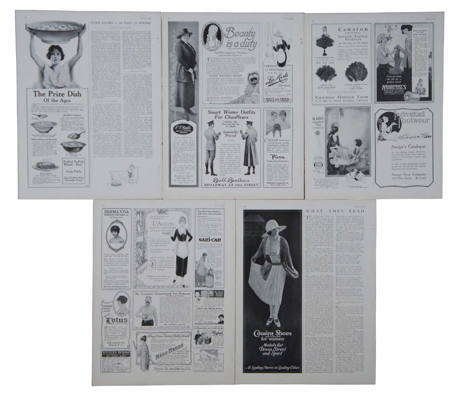 Set of five ad pages from the March 1920 issue of the Vogue fashion magazine.