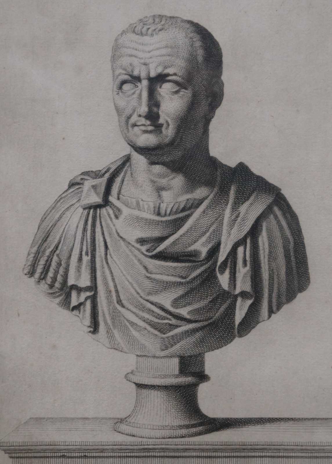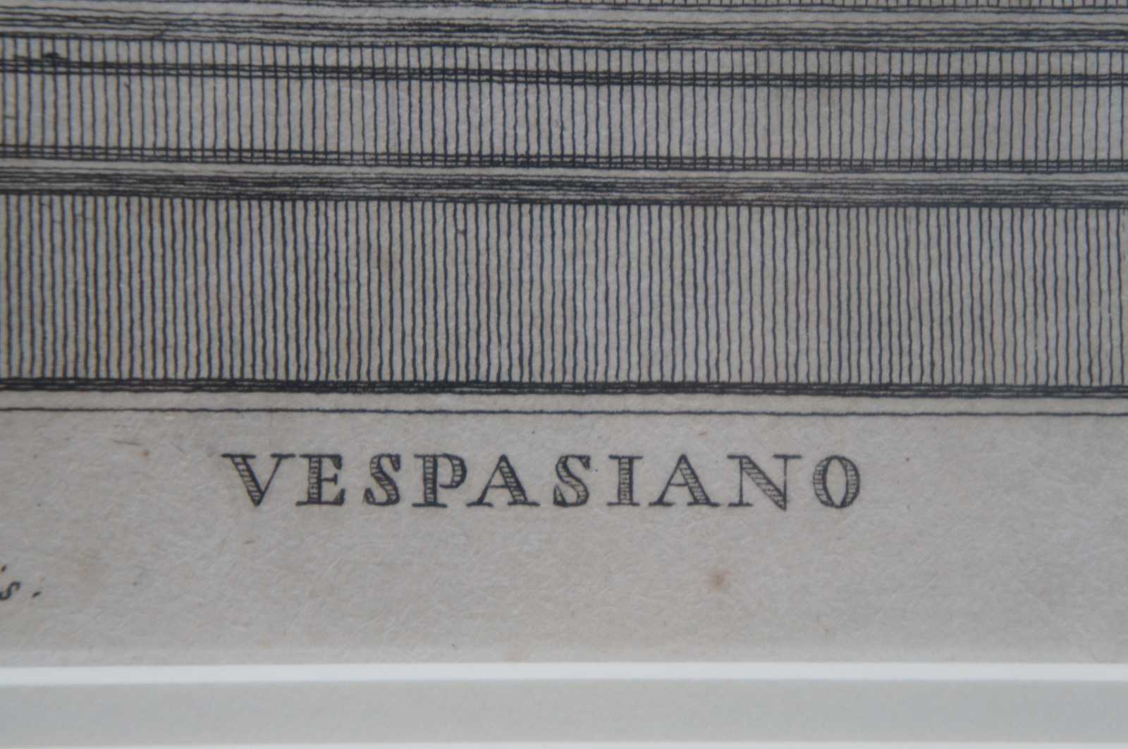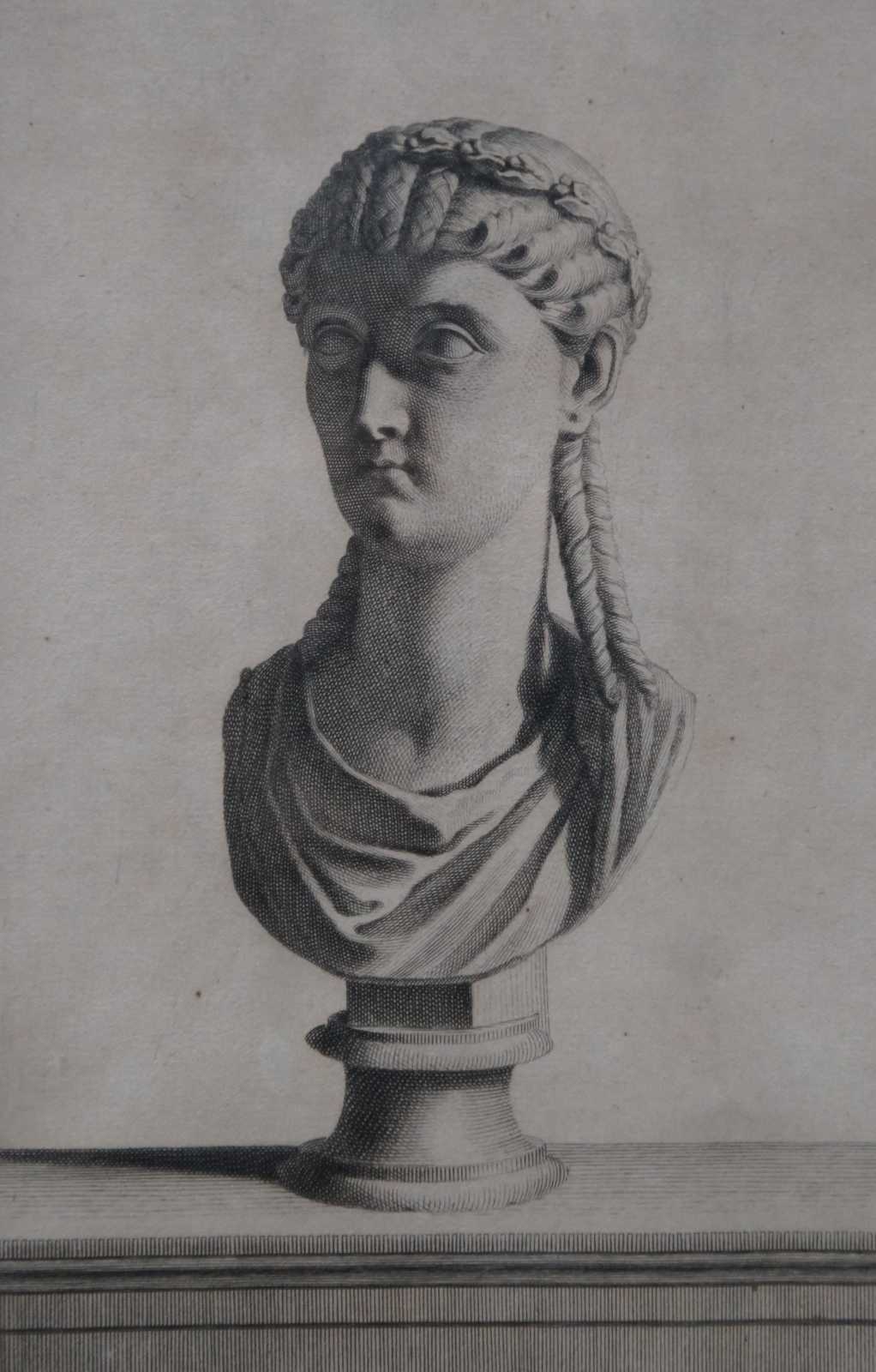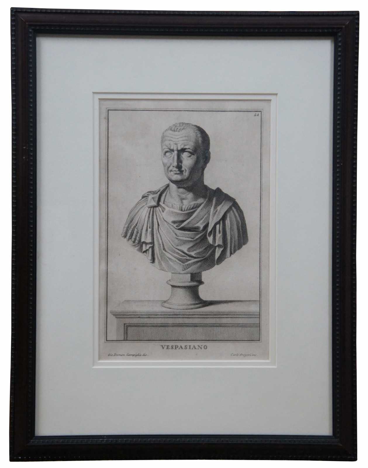 Antique Italian copper-line engraving of the bust of Roman Emperor Vespasian and his consort Antonia by Carlo Gregori after Giovanni Domenica Campiglia’s series “Musei Capitolini,” a series of work inspired by the sculptures of the Capitoline Museum in Rome. “Vespasian was Roman emperor from 69 to 79. The fourth and last in the Year of the Four Emperors, he founded the Flavian dynasty that ruled the Empire for 27 years. He reformed the financial system of Rome after the campaign against Judaea ended successfully, and initiated several ambitious construction projects, including the building of the Flavian Amphitheatre, better known today as the Roman Colosseum. After the death of his wife, Vespasian's long-standing mistress, Antonia Caenis, became his wife in all but formal status, a relationship that continued until she died in 75.” “Carlo Gregori was an Engraver and etcher from an Italian family of engravers; born 1702 in Lucca, active in, and died 1759 in Florence; studied with Johann Jakob Frey in Rome before pursuing his career in Florence. He made prints after Old Master paintings by, for example, Titian, Rubens and Correggio and also reproduced artists' portraits. His engravings illustrated some important 18th century publications, including Ignazio Enrico Hugford's work (1762) on Anton Domenico Gabbiani. He primarily signed with his name in full, but also used an interwoven monogram of c and g.” “Giovanni Domenico Campiglia (1692–1768) was an Italian painter and engraver from Florence, active under the patronage of the House of Medici.