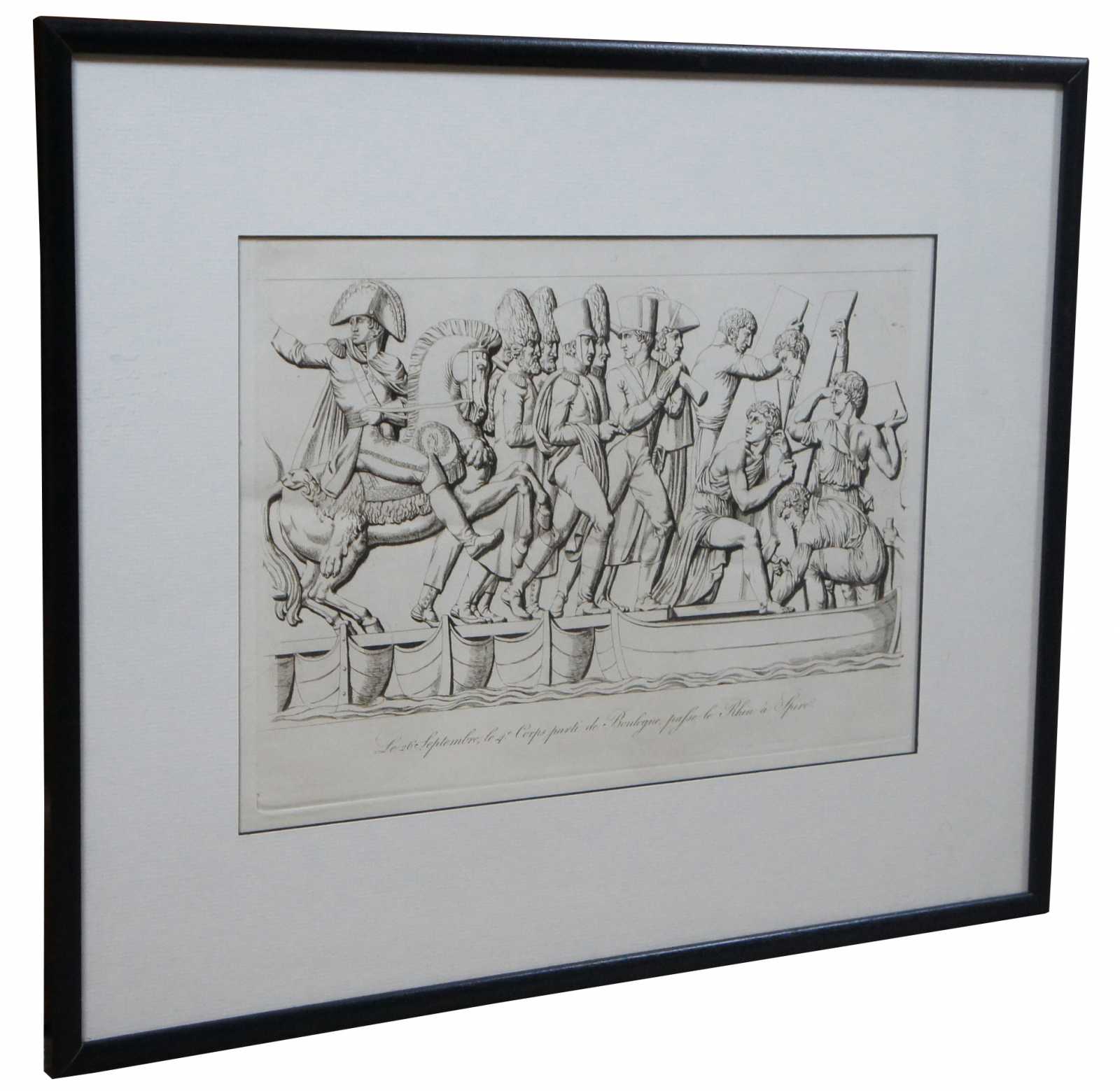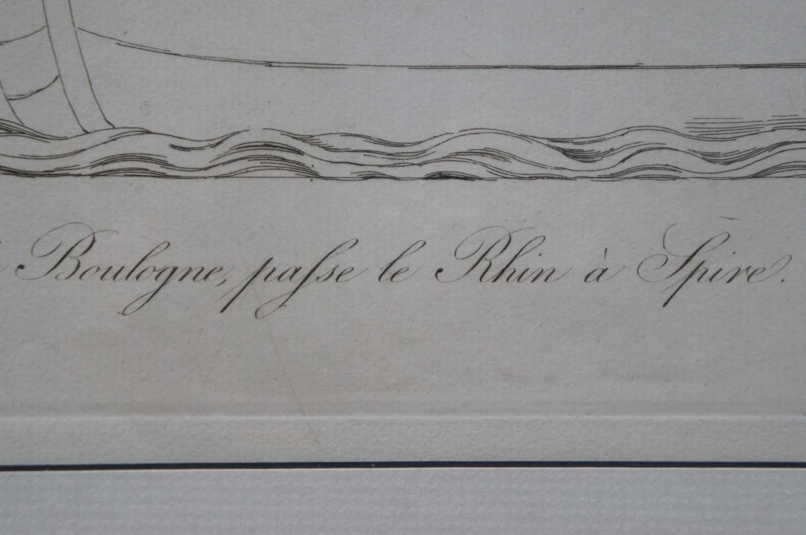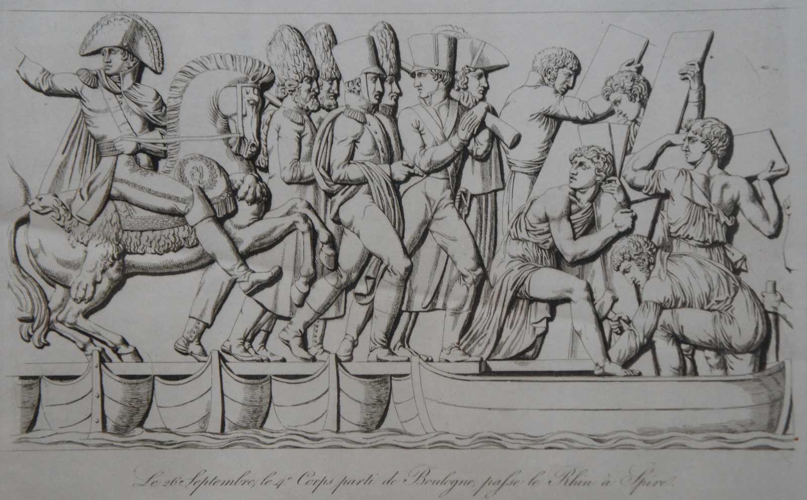 Antique engraving with the phrase “On September 26, the 4th Corps left from Boulogne, Crossed the Rhine to Spire” along the bottom, showing a troop of French naval soldiers crossing a floating bridge as it’s being built by workmen in roman style togas.