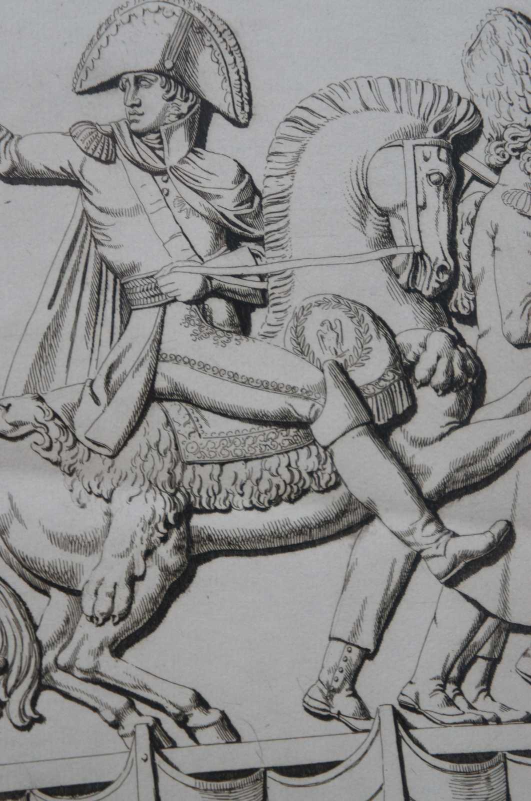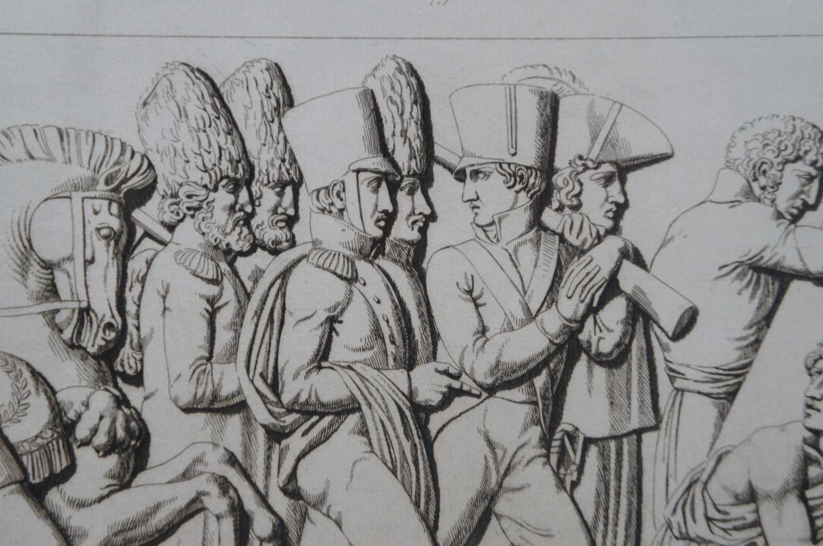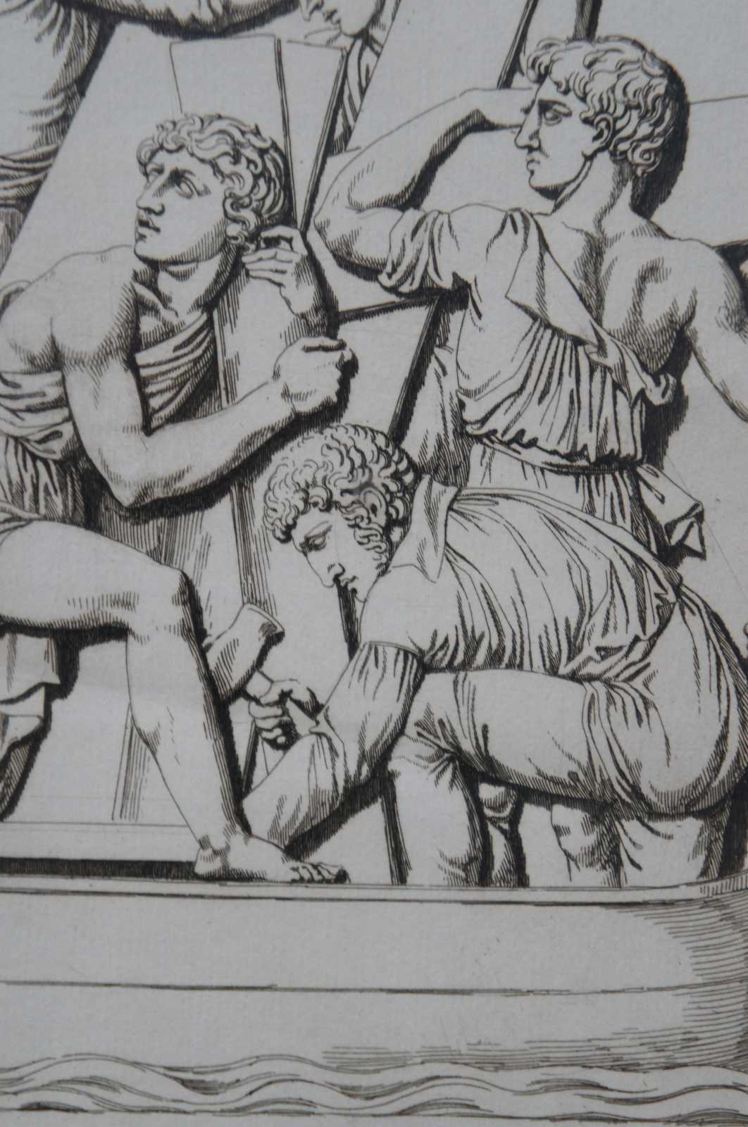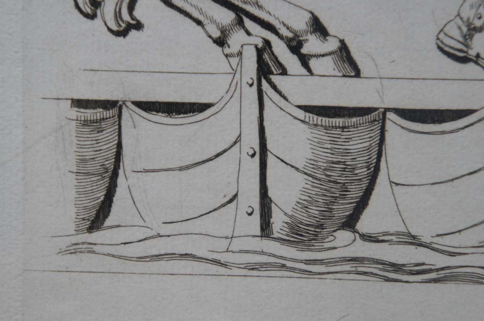 Antique engraving with the phrase “On September 26, the 4th Corps left from Boulogne, Crossed the Rhine to Spire” along the bottom, showing a troop of French naval soldiers crossing a floating bridge as it’s being built by workmen in roman style togas.
