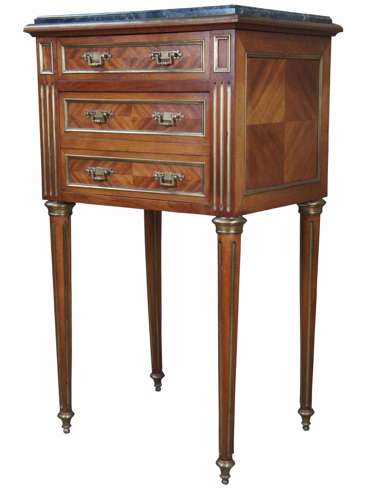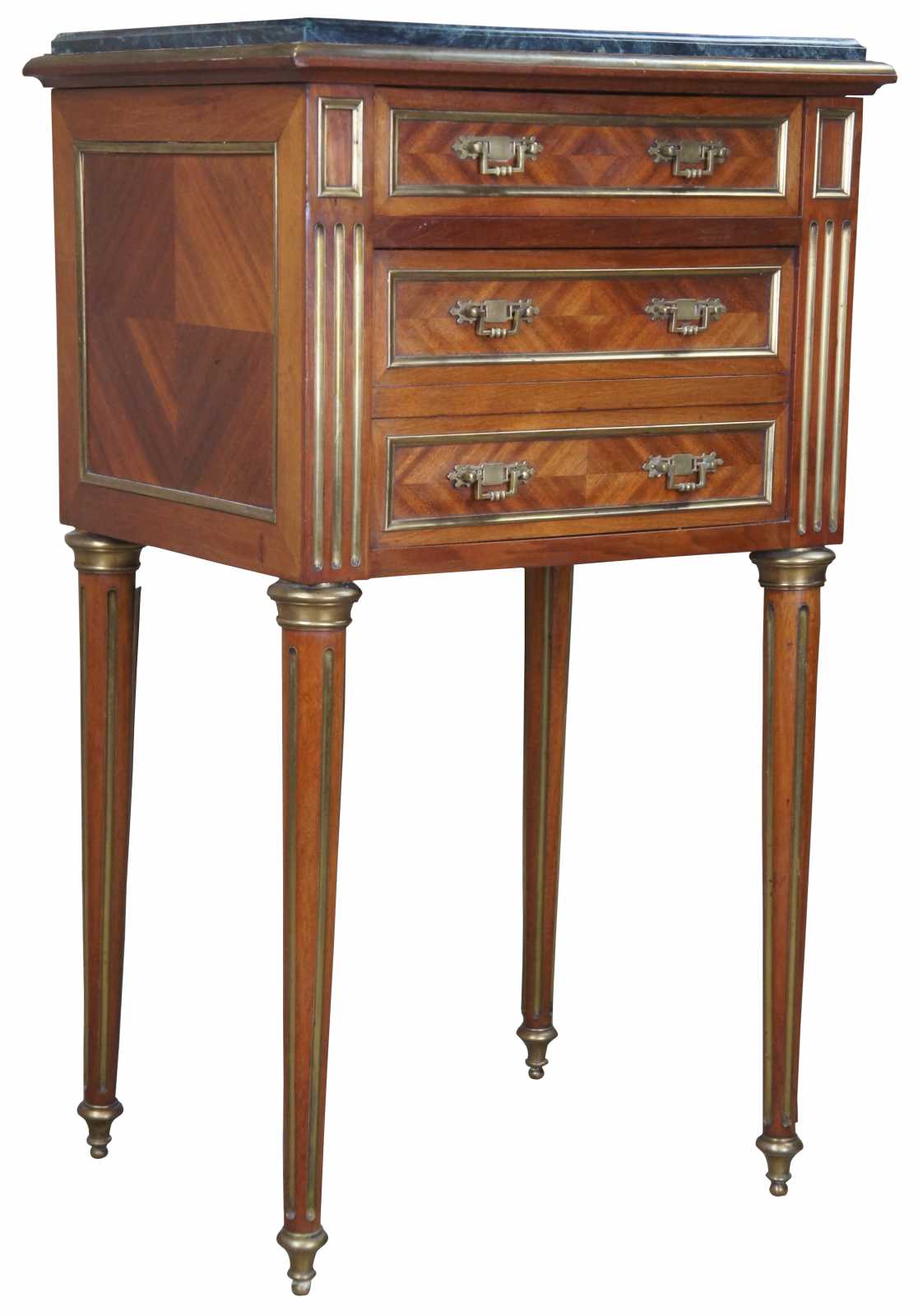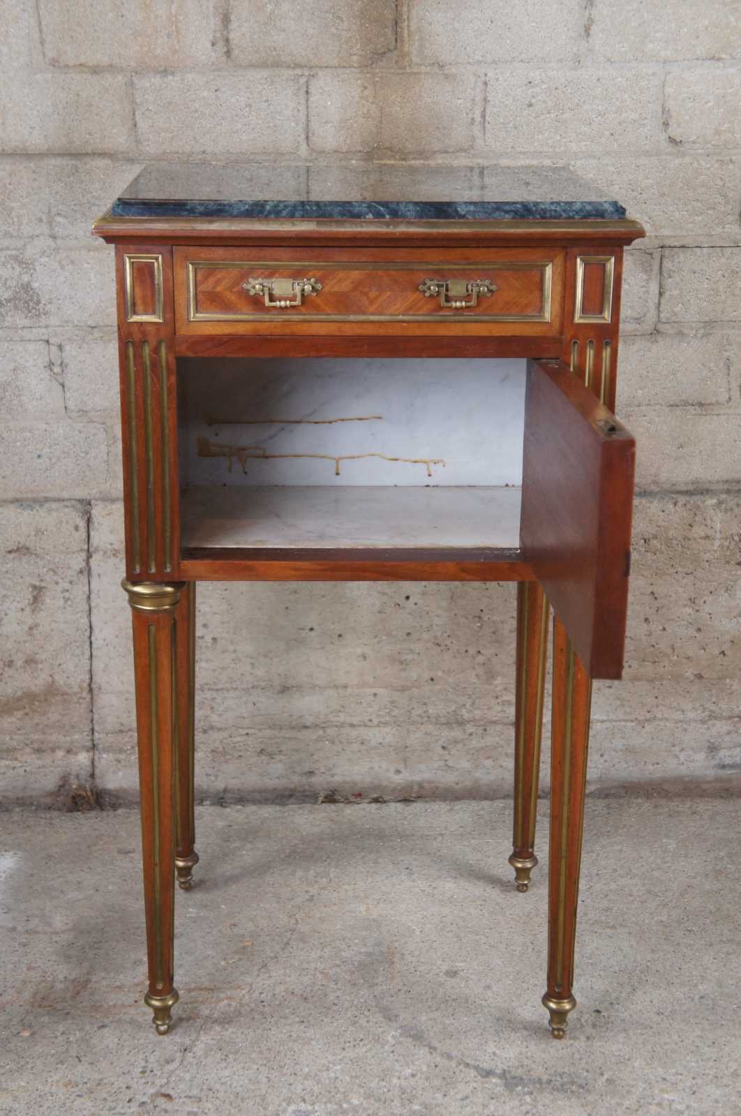 Antique 19th century Louis XV French humidor or side table. Made of walnut with matchbook parquetry veneer featuring brass inlaid accents and hardware, green marble top and tapered fluted legs. Interior humior compartment is lined with white marble and has a neat upper clasp mechanism for opening and closing the door.