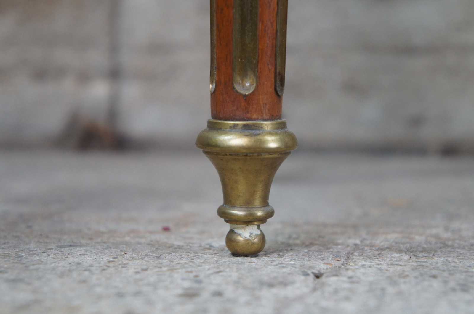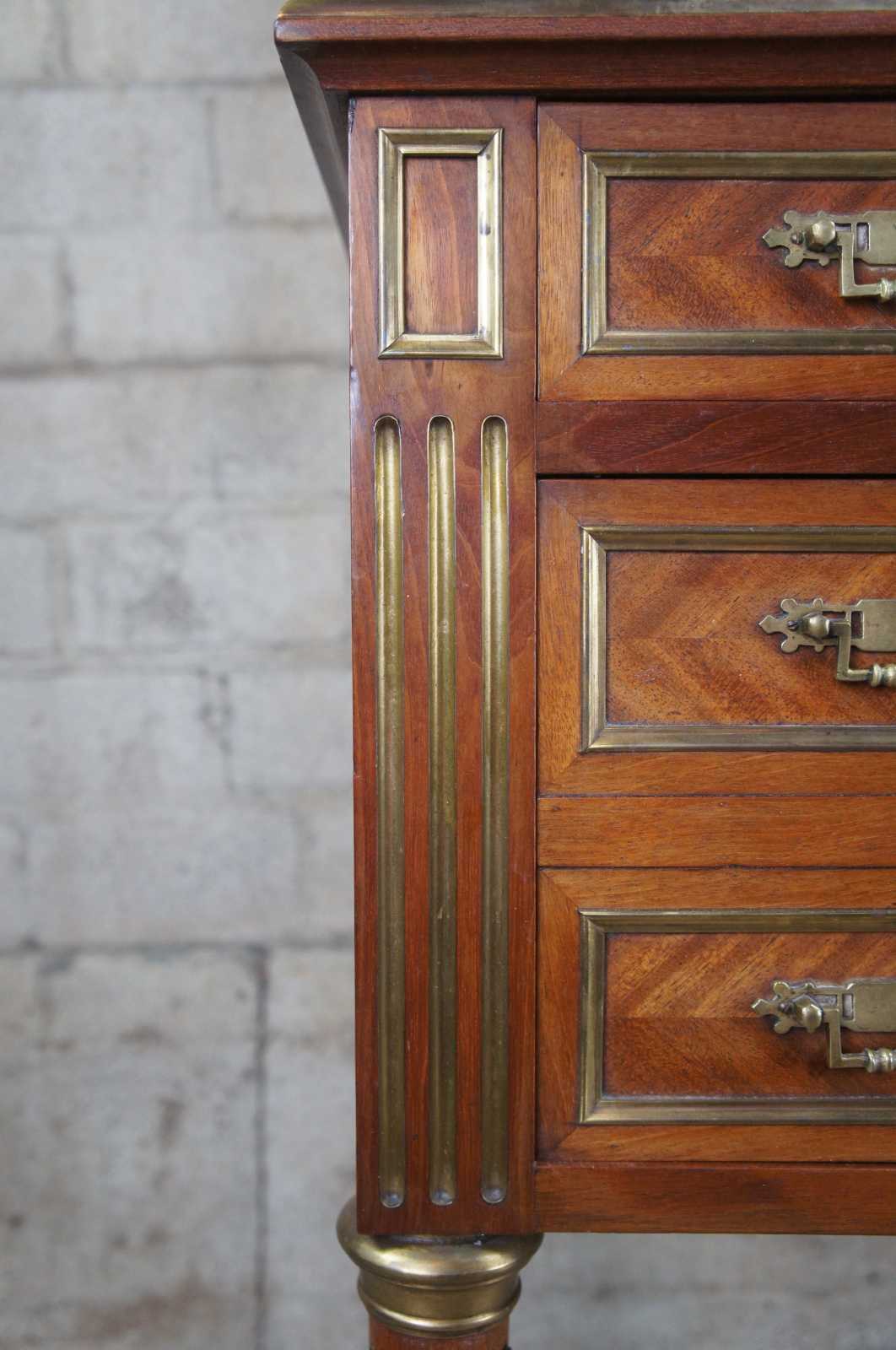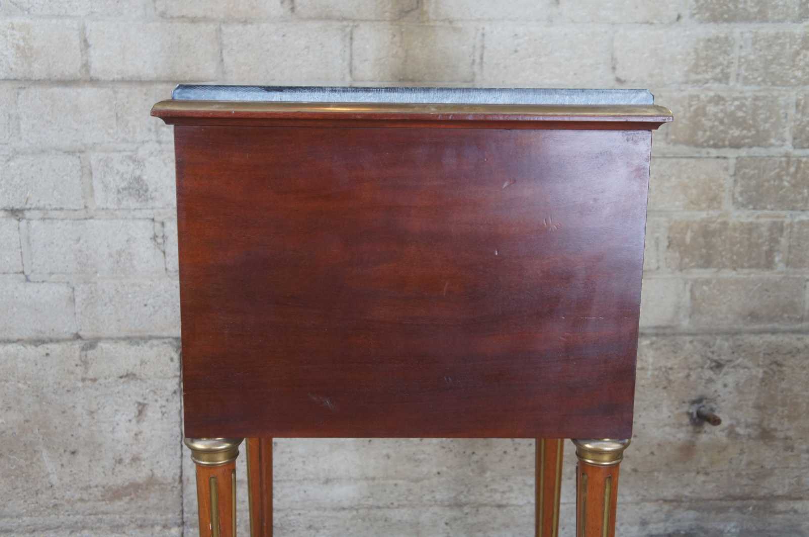 Antique 19th century Louis XV French humidor or side table. Made of walnut with matchbook parquetry veneer featuring brass inlaid accents and hardware, green marble top and tapered fluted legs. Interior humior compartment is lined with white marble and has a neat upper clasp mechanism for opening and closing the door.