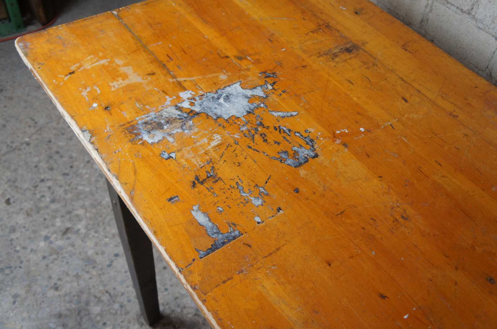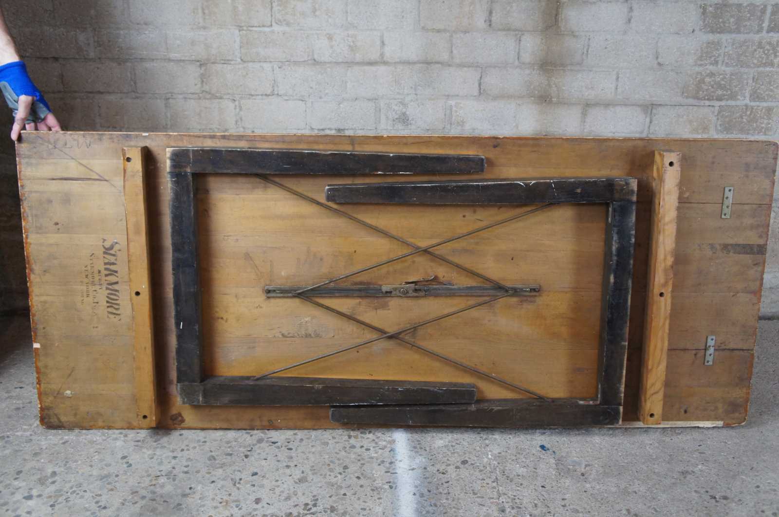 Vintage mid century Stakmore folding table. Made of wood with unique folding mechanism. Made by the Stakmore Company of New York.
