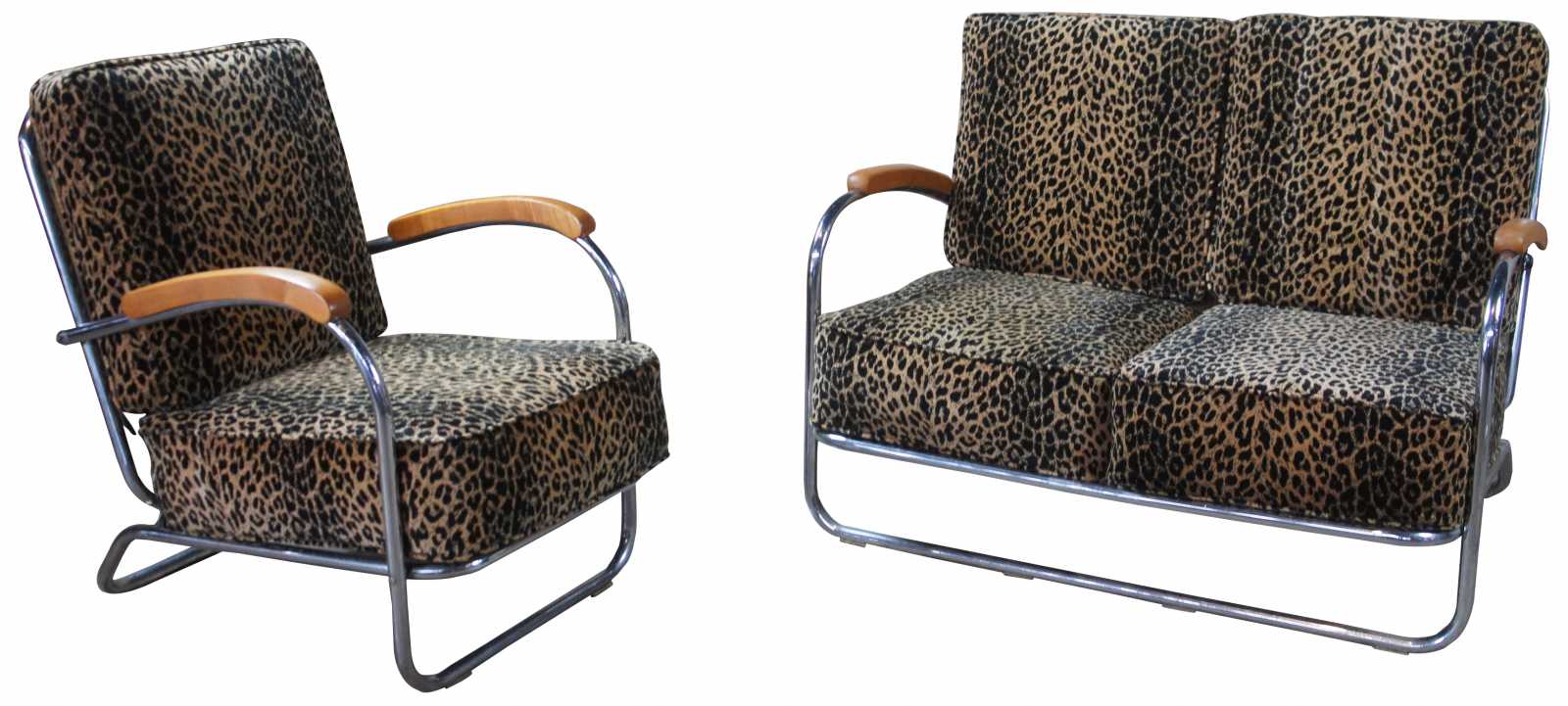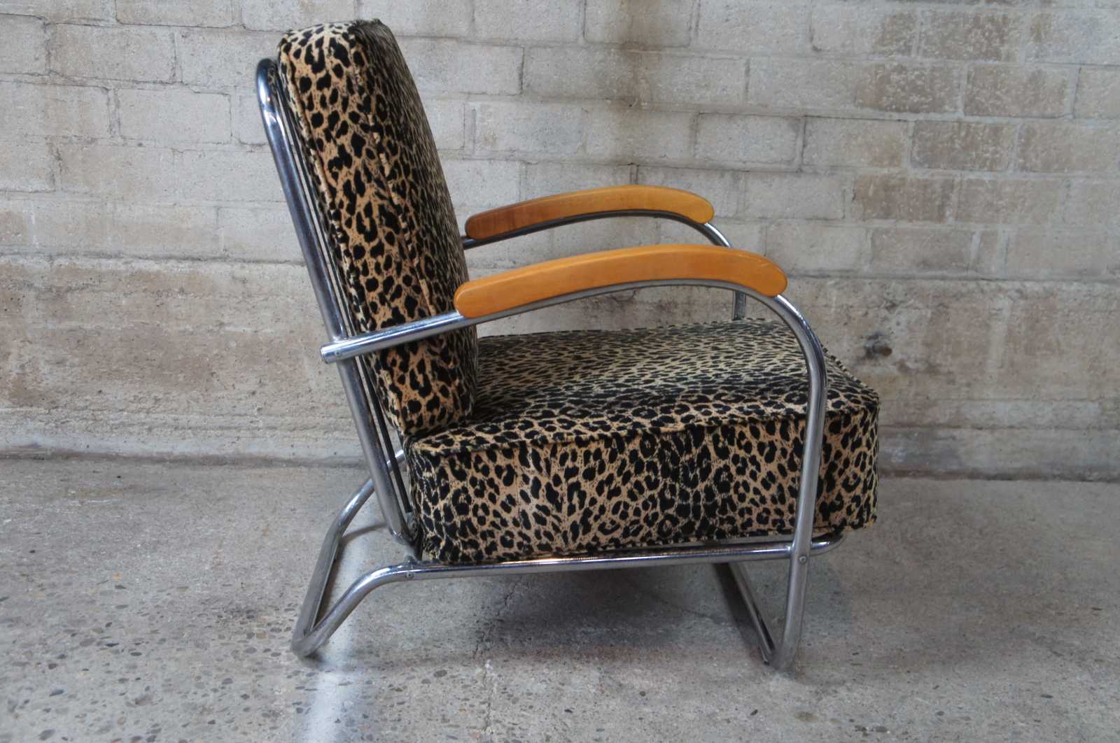 Mid century modern tubular chrome and leopard upholstered chair and love seat. Features wood arms and tubular serpentine chrome frame. Very similar to the art deco style that Wolfgang Hoffmann designed for Howell Furniture.