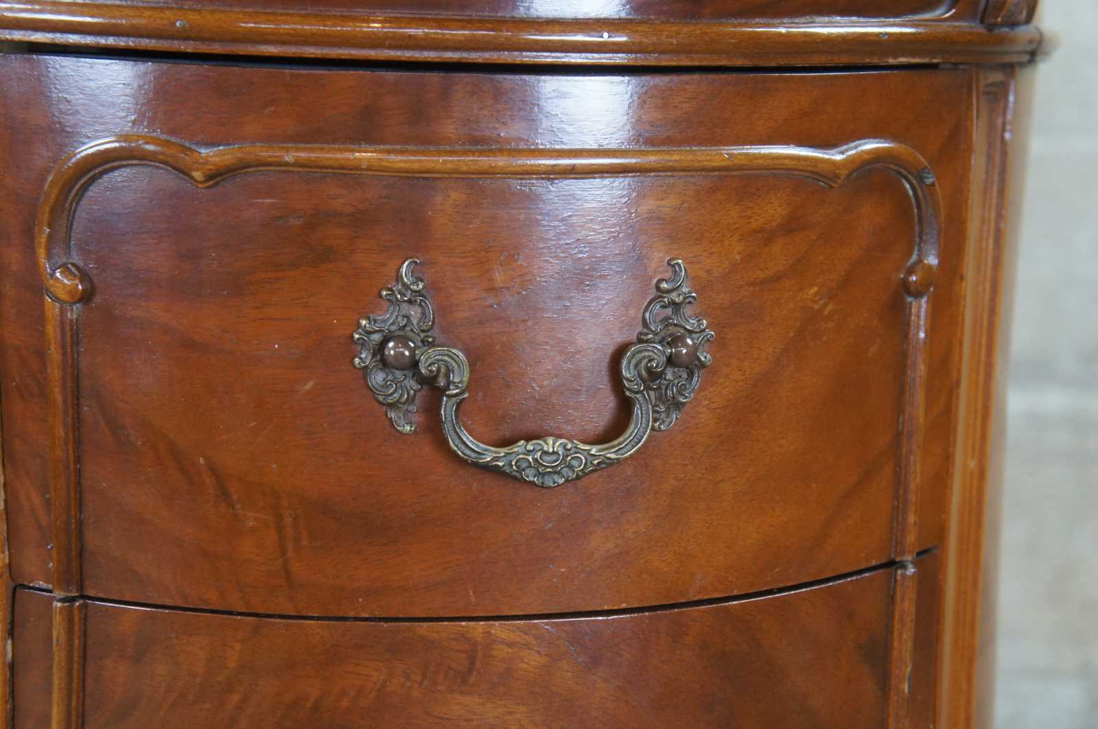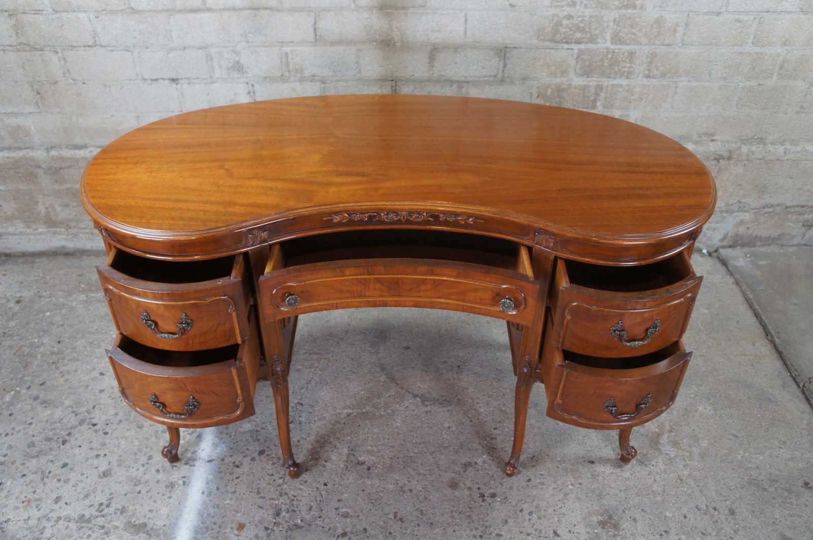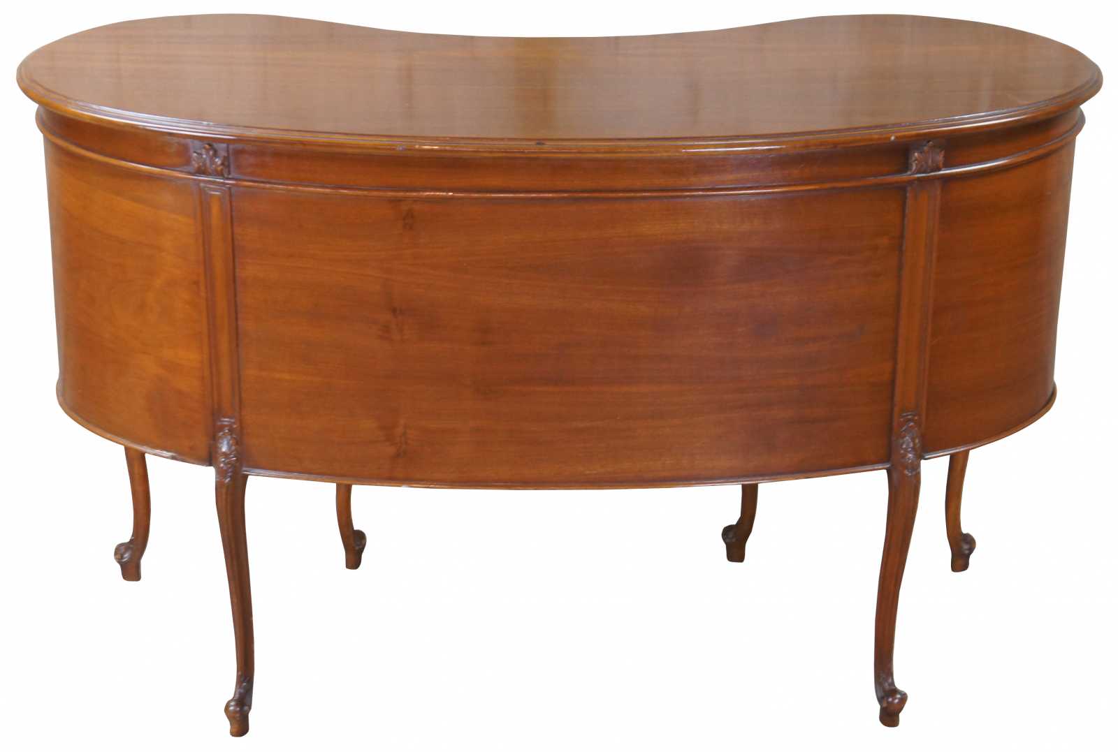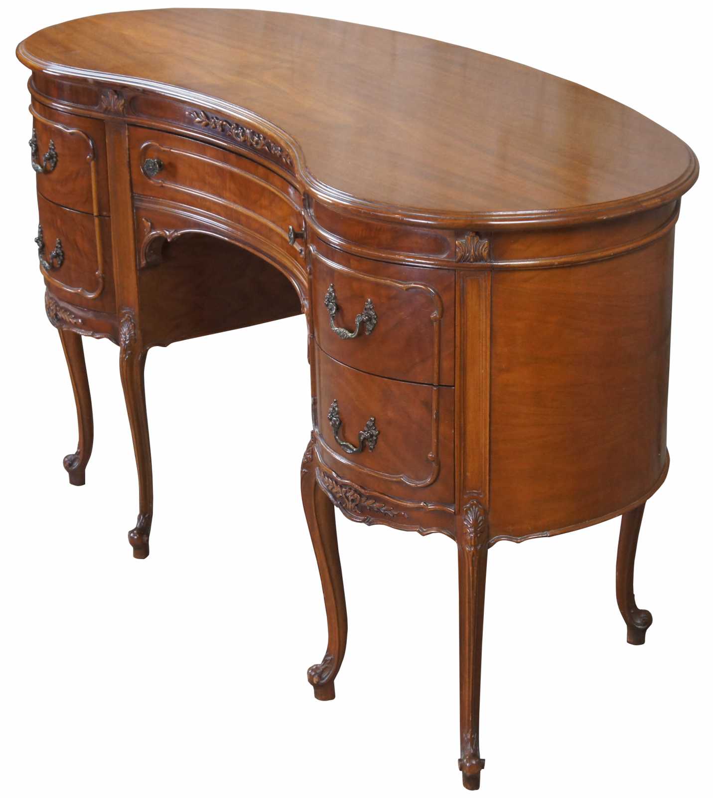1940s kidney bean or crescent shaped writing desk. Made from walnut with crotch veneer along the front. Features French styling with carved foliate accents and five drawers supported by six cabriole legs over scrolled feet. Includes Glass tops.