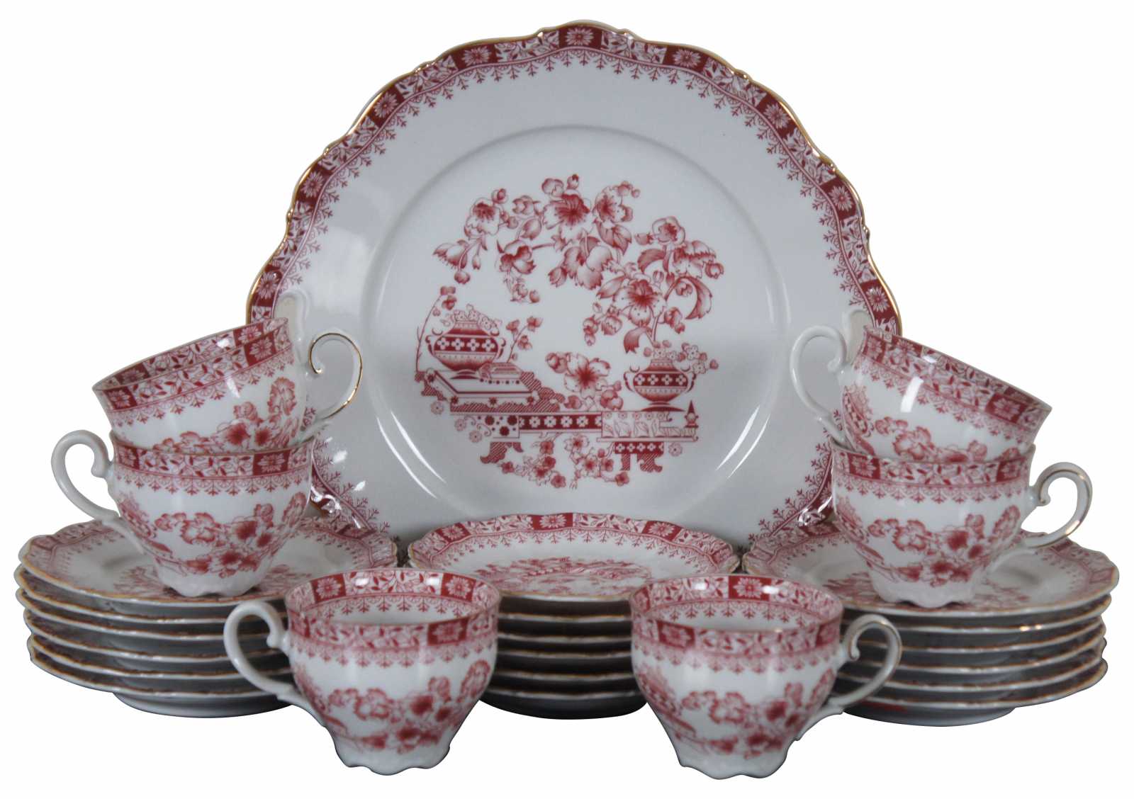Vintage 25 piece set of dessert tea china by Seltmann Weiden featuring an Asian transferware pattern of flowers and urns in red.